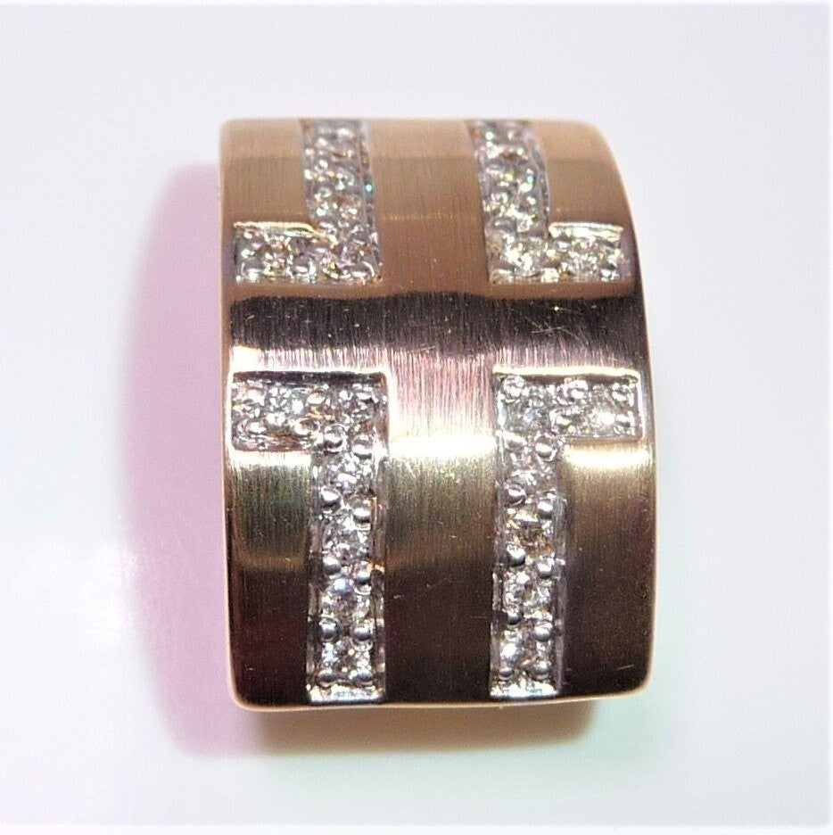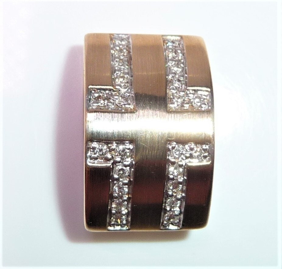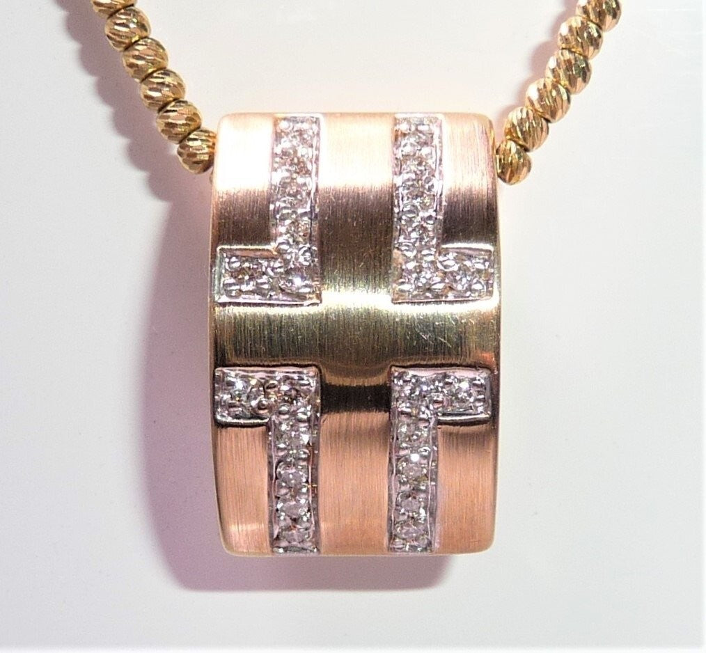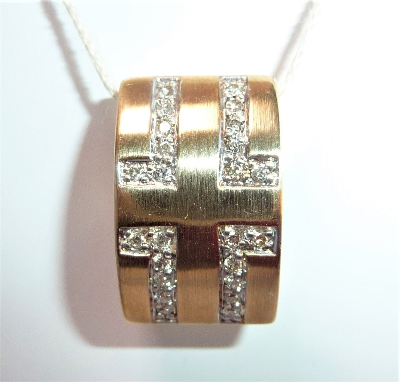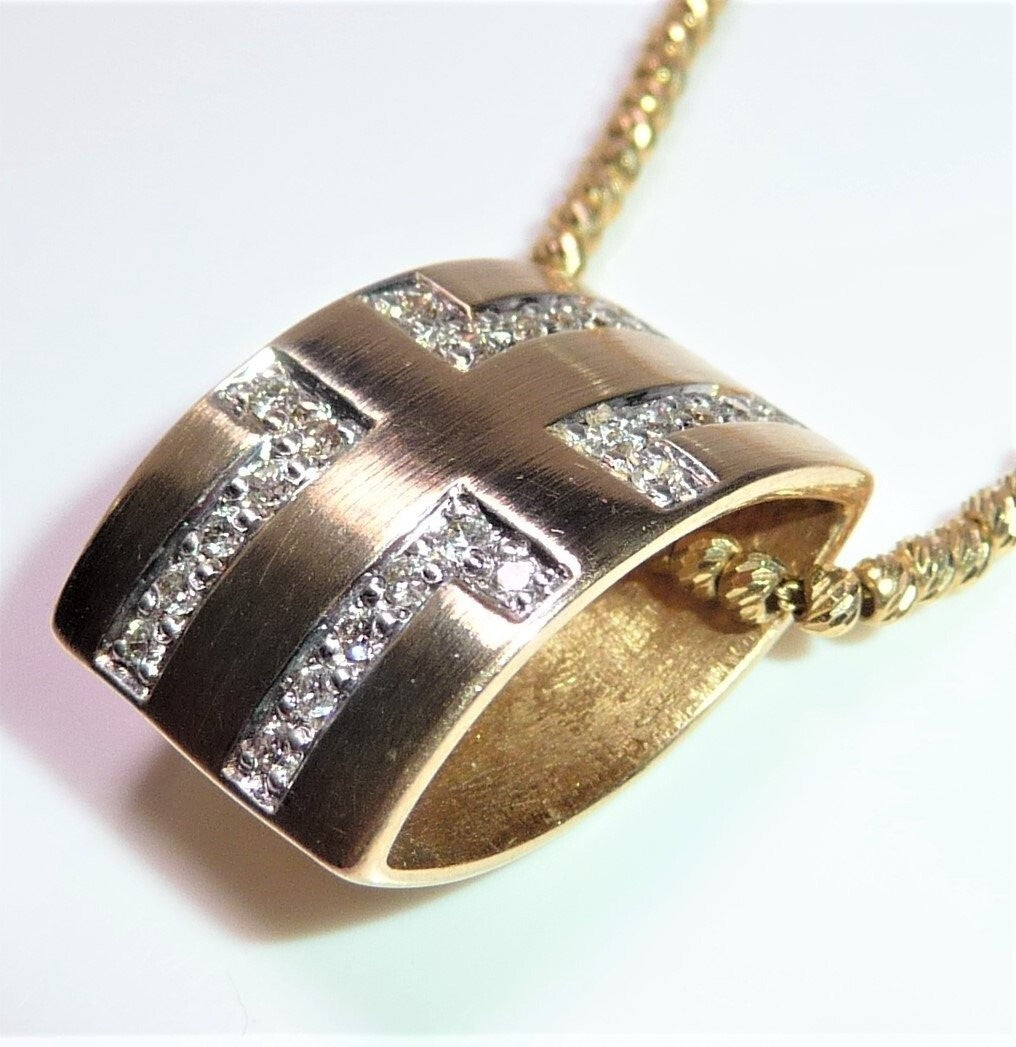 Anhänger in 585 / 14 K Gelbgold. Der breite Anhänger ist sehr flexibel einsetzbar, da er auch sehr breite Ketten, Lederbänder und sogar Perlenketten aufnehmen kann. Im Seitenprofil ist der Anhänger wie ein Auge geformt. Im vorderen Bereich ist ein Muster mit 24 Diamanten im Brillantschliff geformt. Das Muster ähnelt einem Kreuz. Die 24 Diamanten haben zusammen 0.24 ct. mit Farbe überwiegend G und Reinheit SI.