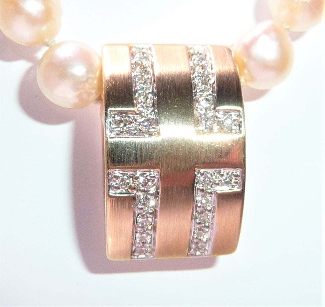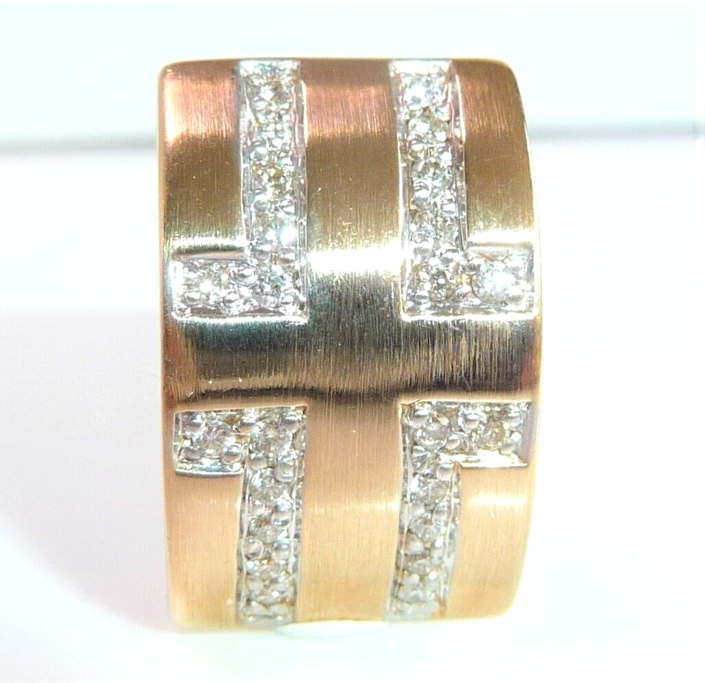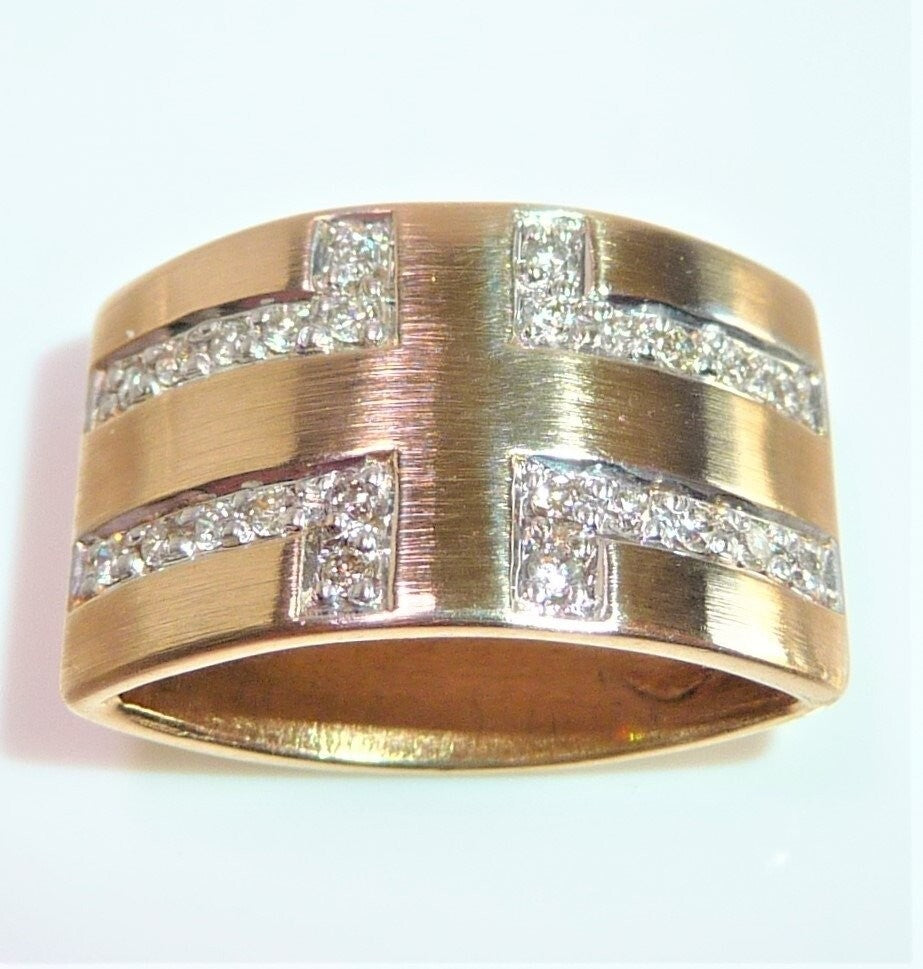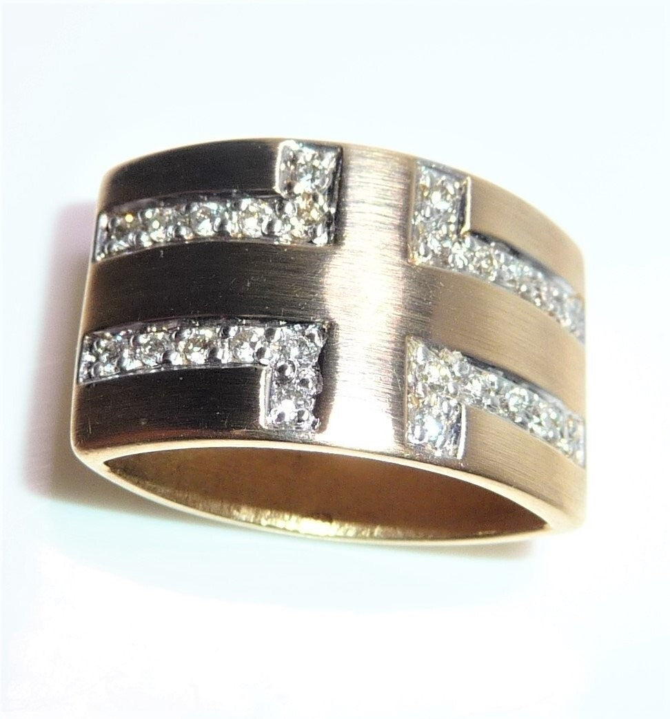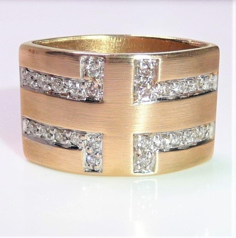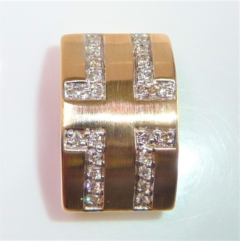 Anhänger in 585 / 14 K Gelbgold. Der breite Anhänger ist sehr flexibel einsetzbar, da er auch sehr breite Ketten, Lederbänder und sogar Perlenketten aufnehmen kann. Im Seitenprofil ist der Anhänger wie ein Auge geformt. Im vorderen Bereich ist ein Muster mit 24 Diamanten im Brillantschliff geformt. Das Muster ähnelt einem Kreuz. Die 24 Diamanten haben zusammen 0.24 ct. mit Farbe überwiegend G und Reinheit SI.