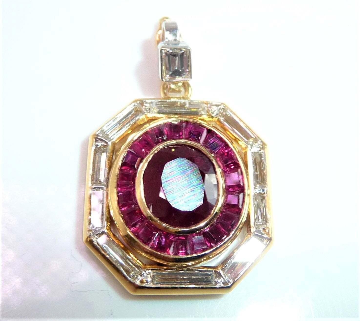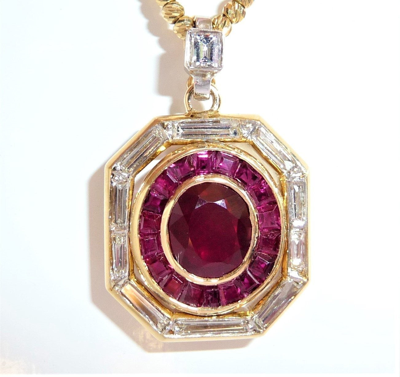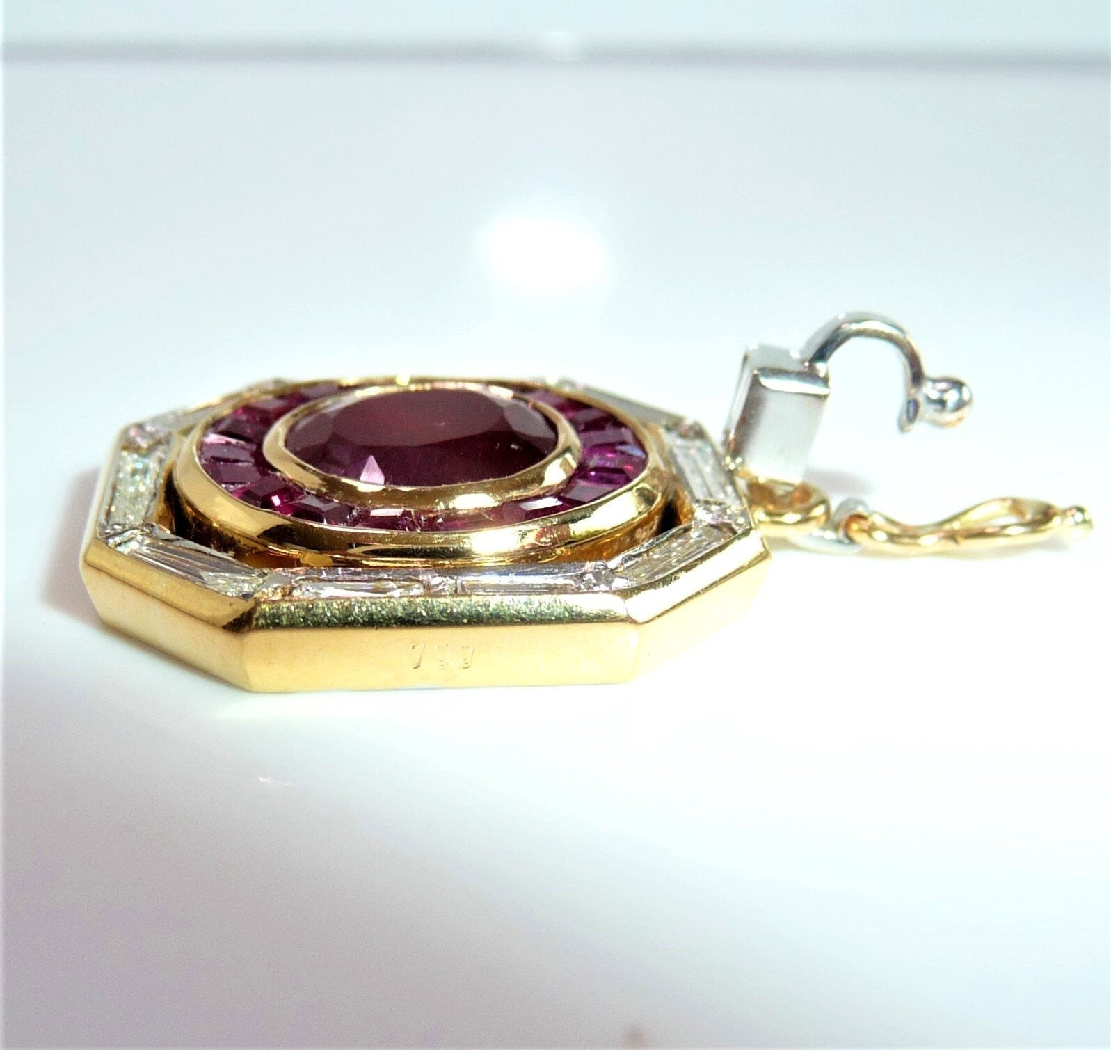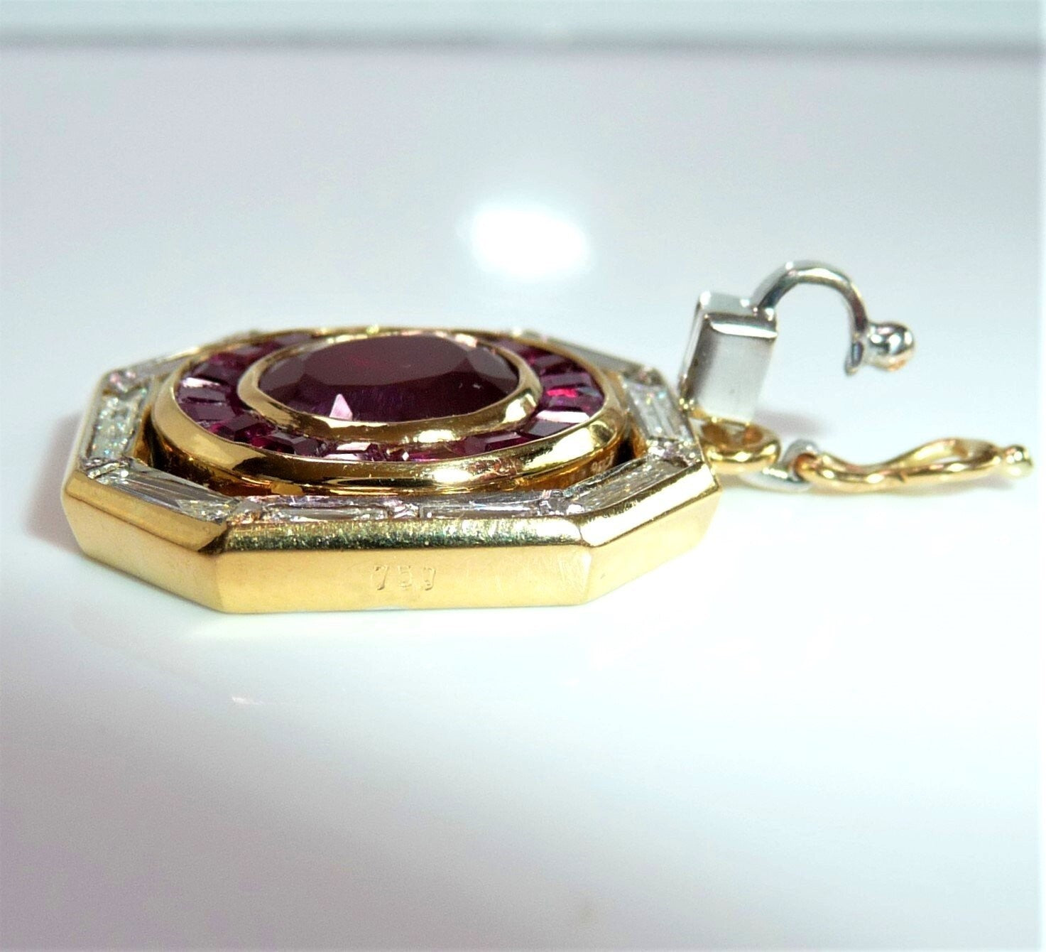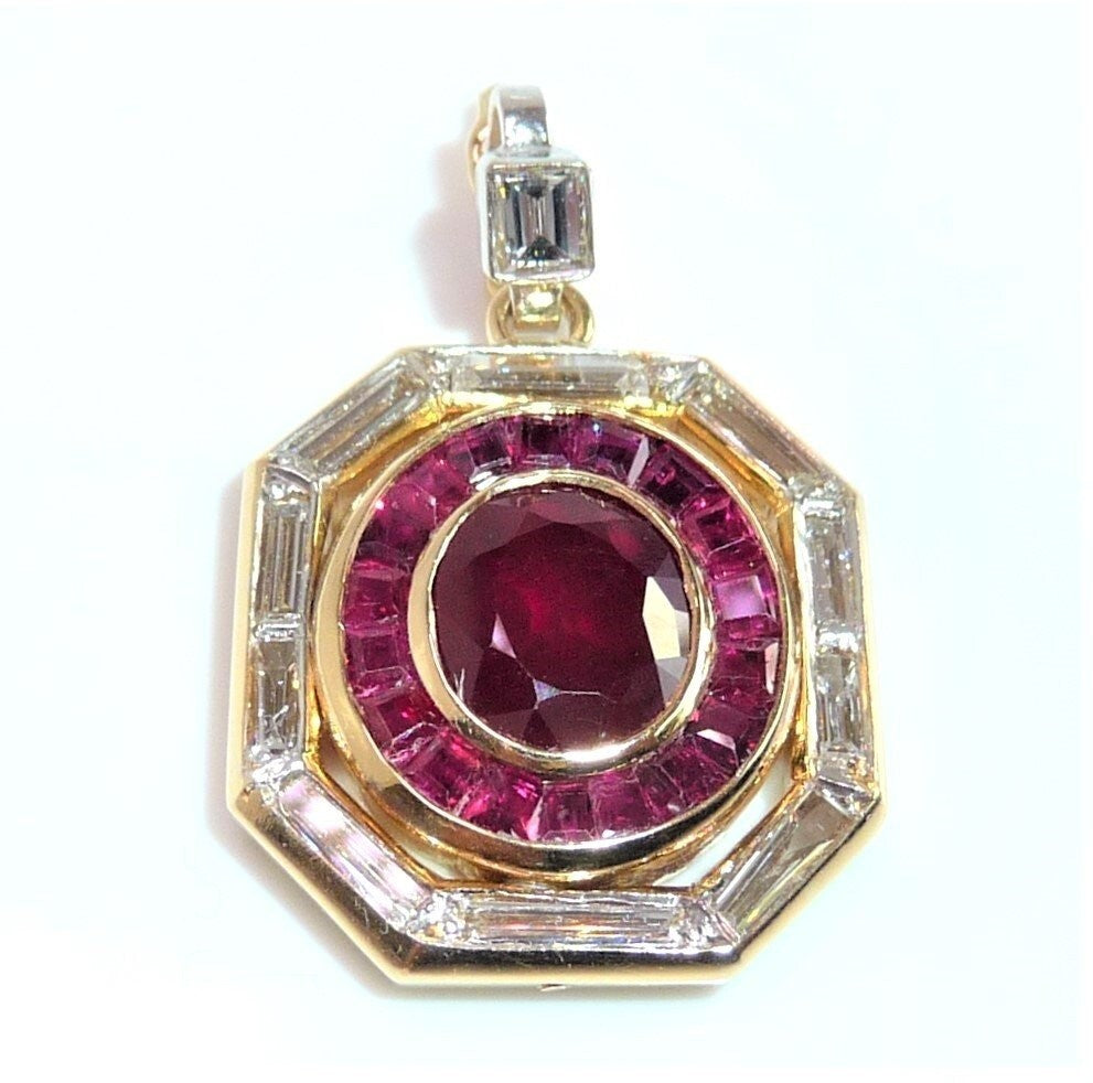 Anhänger in 18 K / 750 Gelbgold. Der Anhänger hat eine achteckige Form und ist besetzt mit sehr edlen und hochwertigen Diamanten und Rubinen.