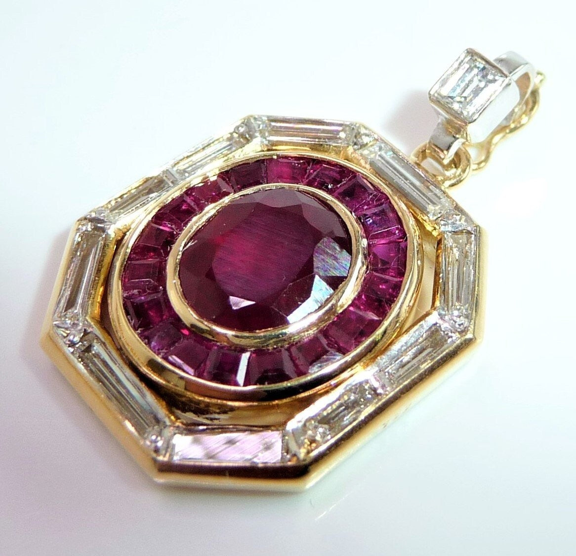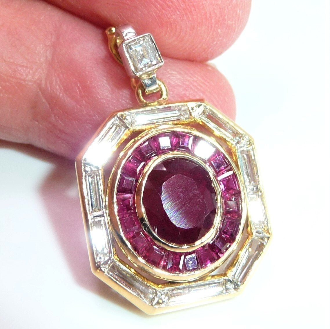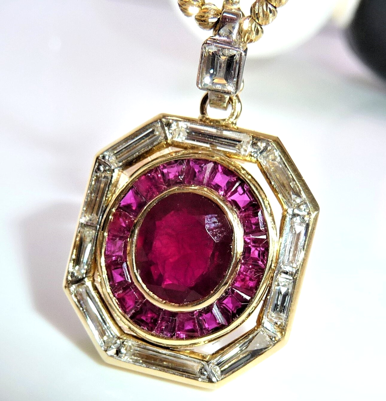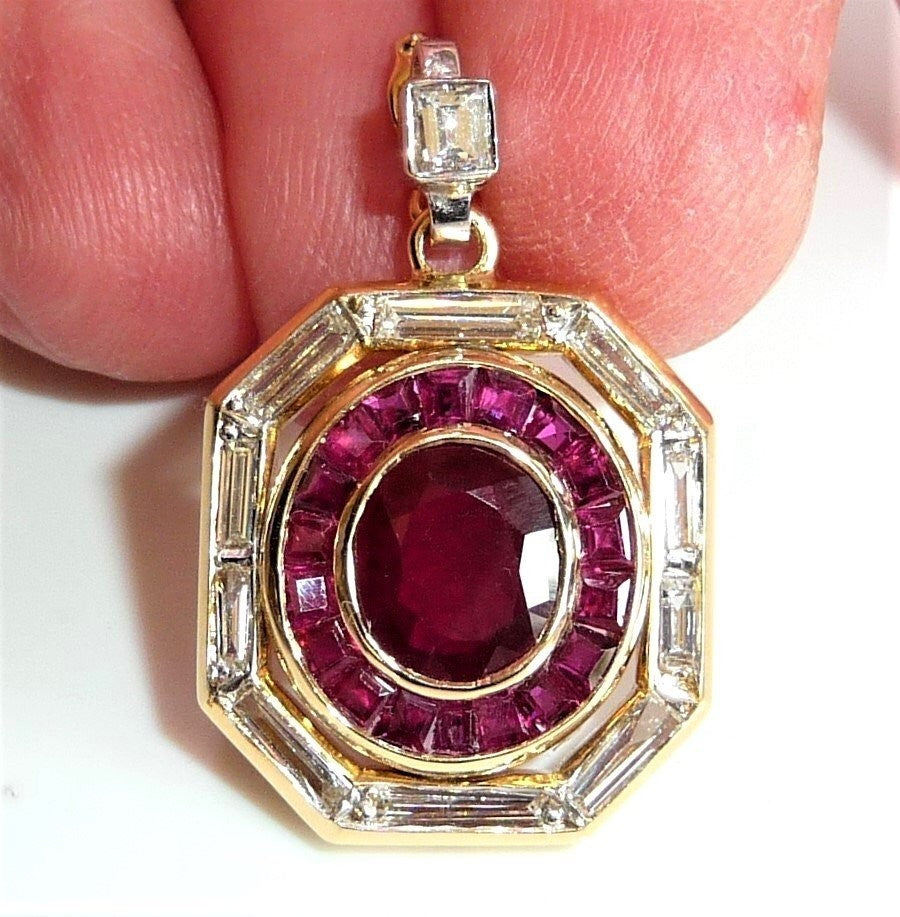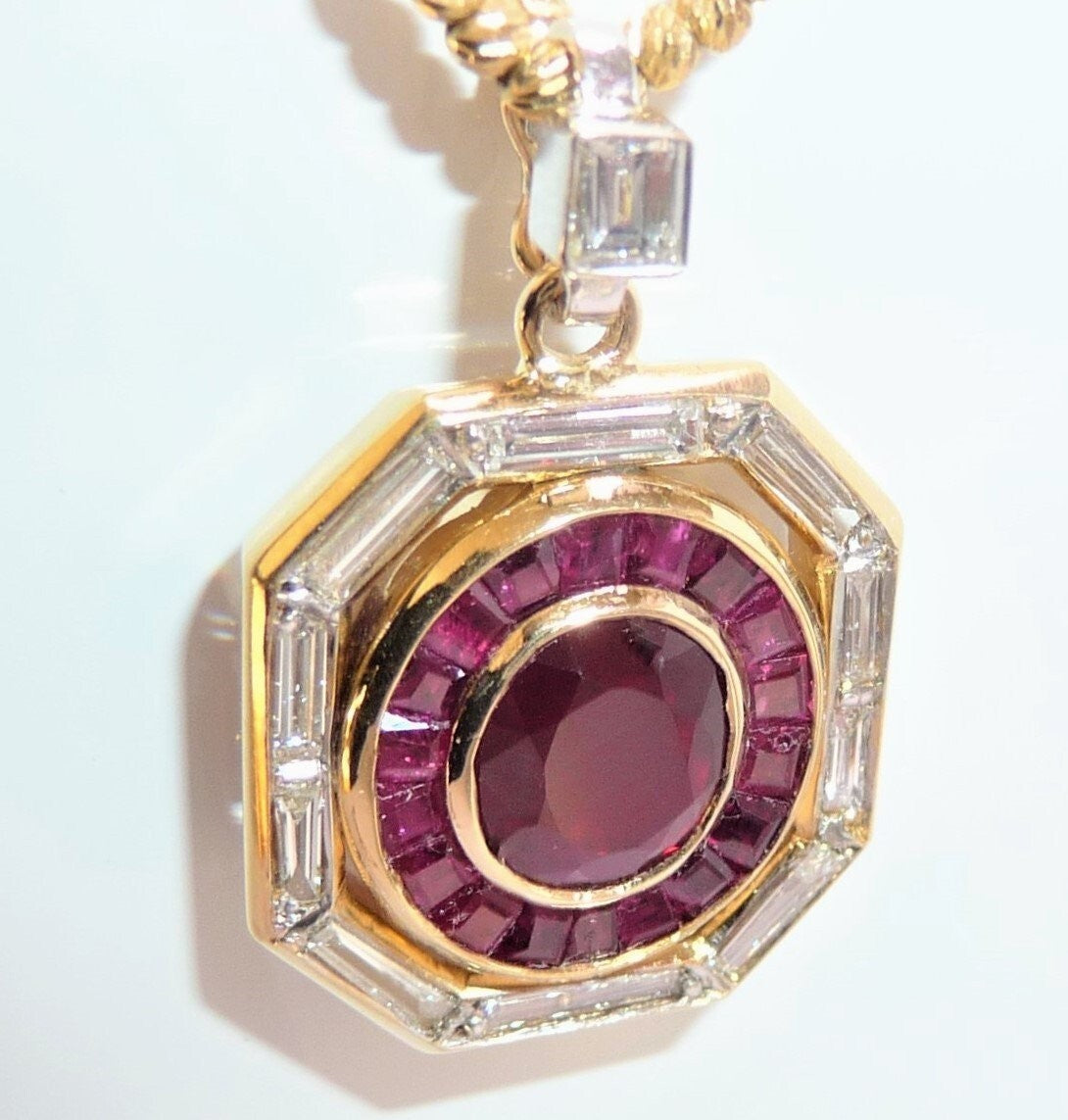 Anhänger in 18 K / 750 Gelbgold. Der Anhänger hat eine achteckige Form und ist besetzt mit sehr edlen und hochwertigen Diamanten und Rubinen.