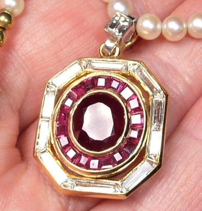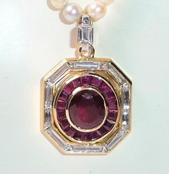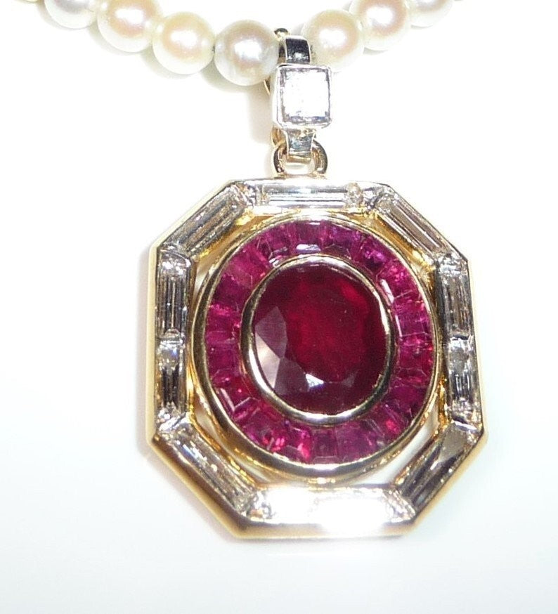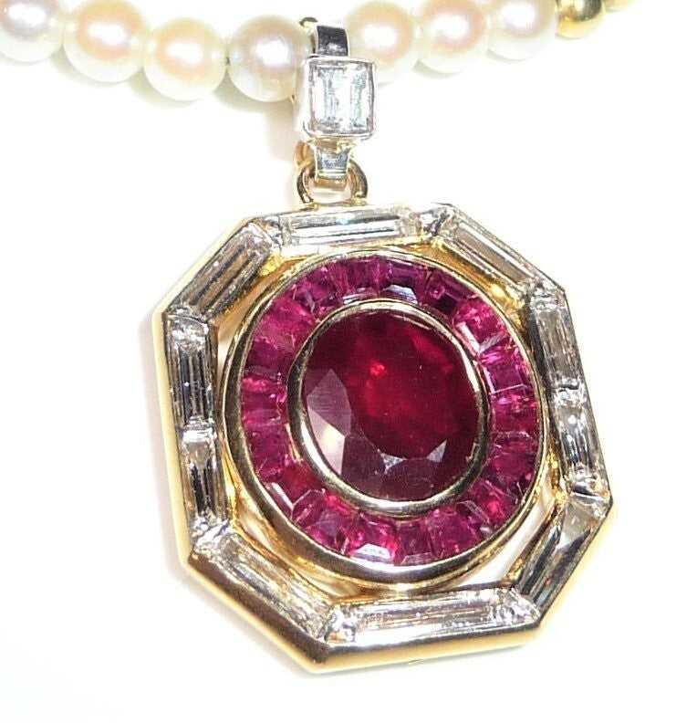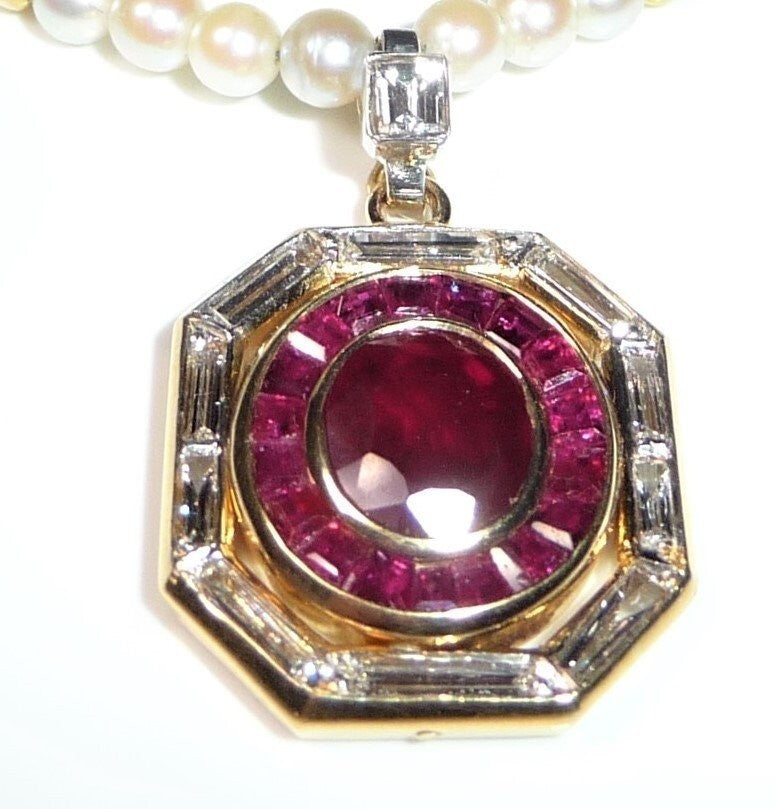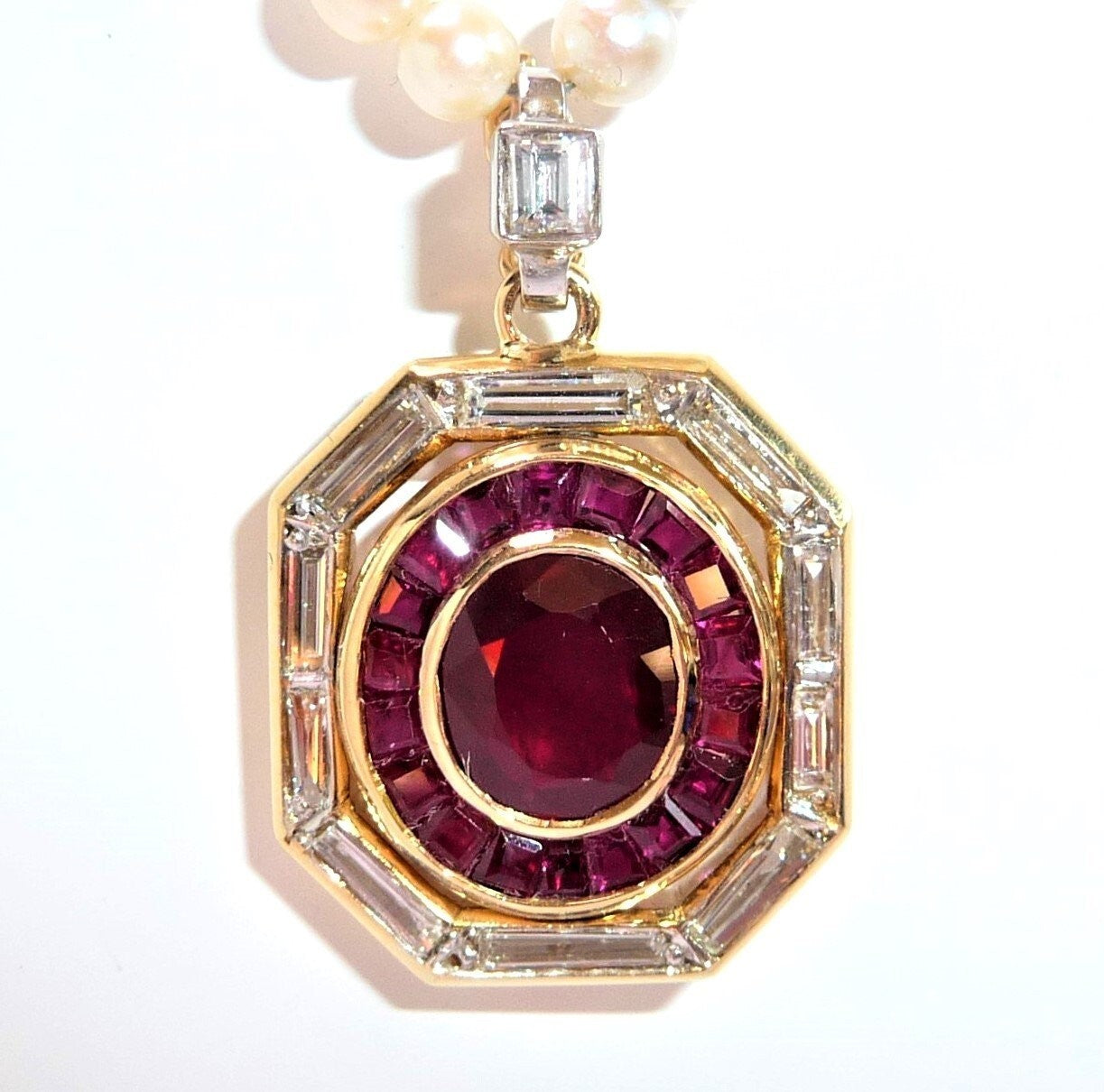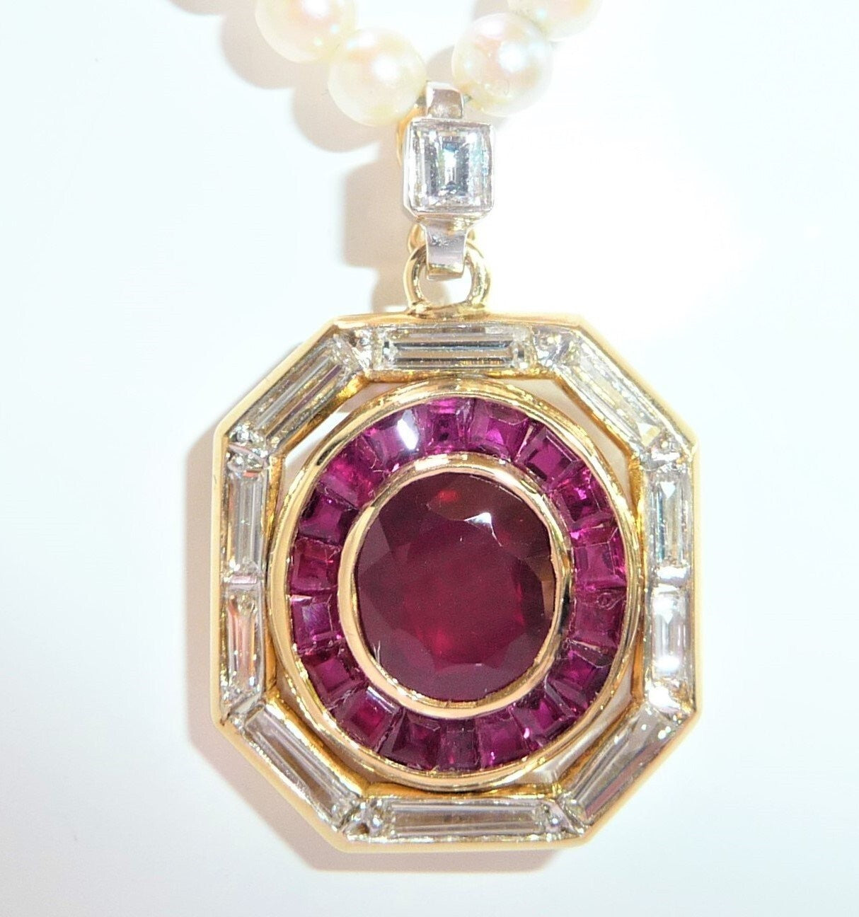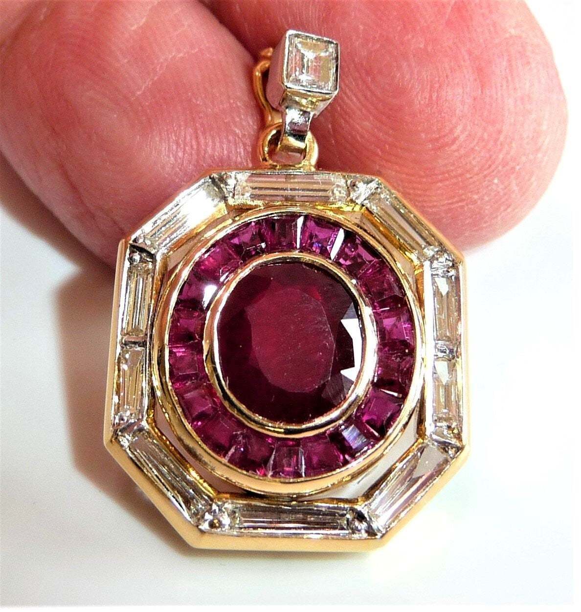 Anhänger in 18 K / 750 Gelbgold. Der Anhänger hat eine achteckige Form und ist besetzt mit sehr edlen und hochwertigen Diamanten und Rubinen.