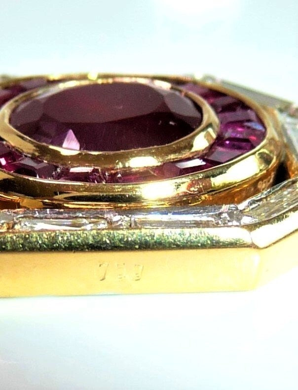Im Zentrum ist ein großer ovaler Rubin in blutroter Farbe von 1.70 ct. mit den Maßen 8,8 x 7,3 c 3 mm. Ein Rahmen von 18 quadratischen Rubinen umspielen den zentralen Rubin und bringen nochmal 0.90 ct. auf die Waage. Rubine total: 2.60 ct.