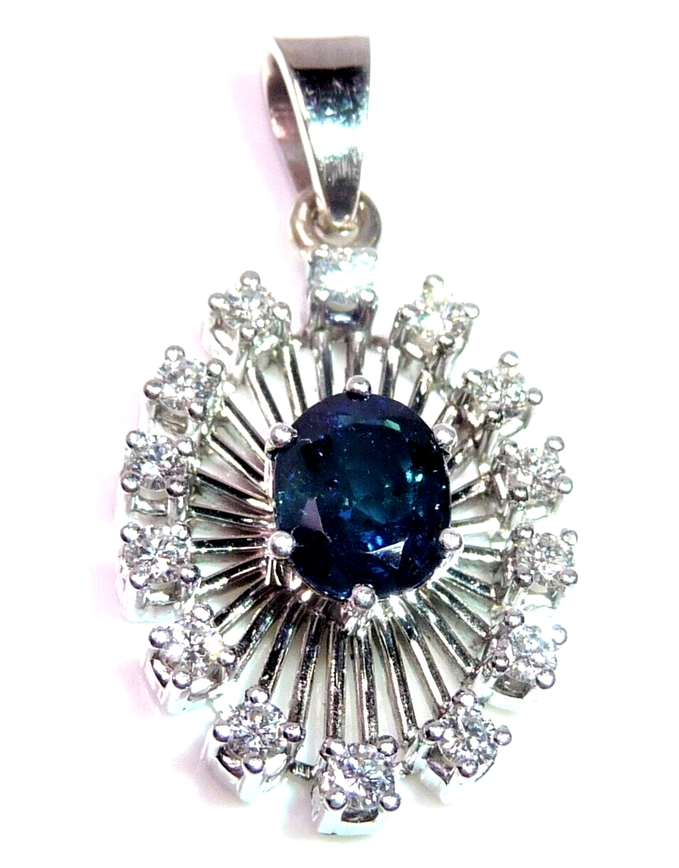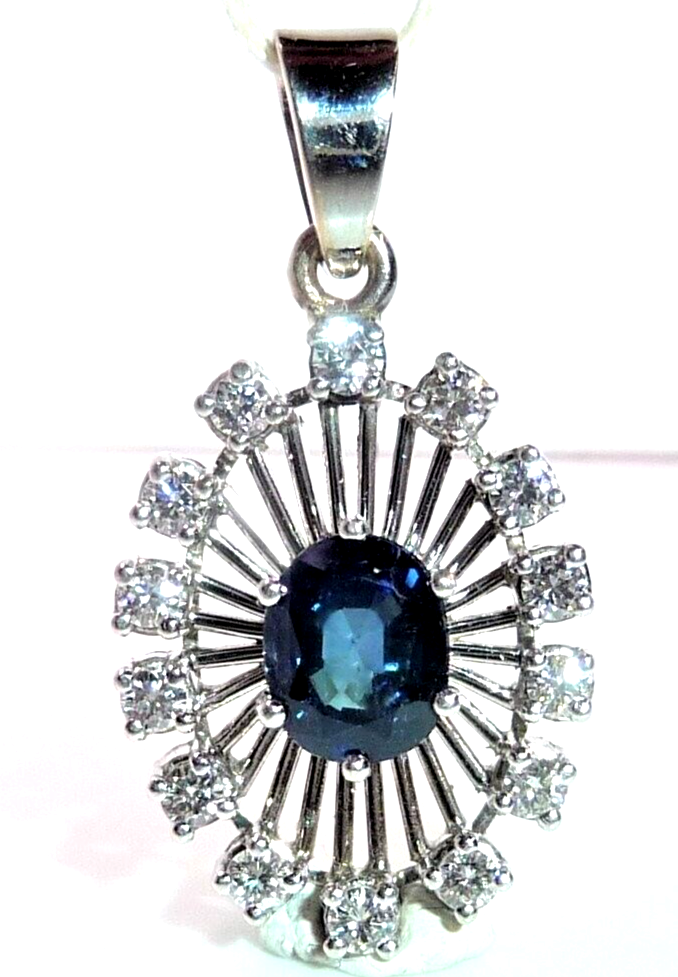 Anhänger in 750 / 18 K Weißgold. Der Anhänger hat eine ovale Form. Insgesamt 28 Strahlen in Form von feinen Weißgold-Streben, gehen vom Zentrum nach außen. Jeweils zwei Strahlen münden in eine Krappen-Fassung die einen Diamanten im Brillantschliff einfassen. Die 14 Diamanten haben jeweils einen Durchmesser von 2.3 mm und damit etwa 0.04-0.045 ct. Diamanten total: 0.60 ct. mit Farbe F und Reinheit VVS.