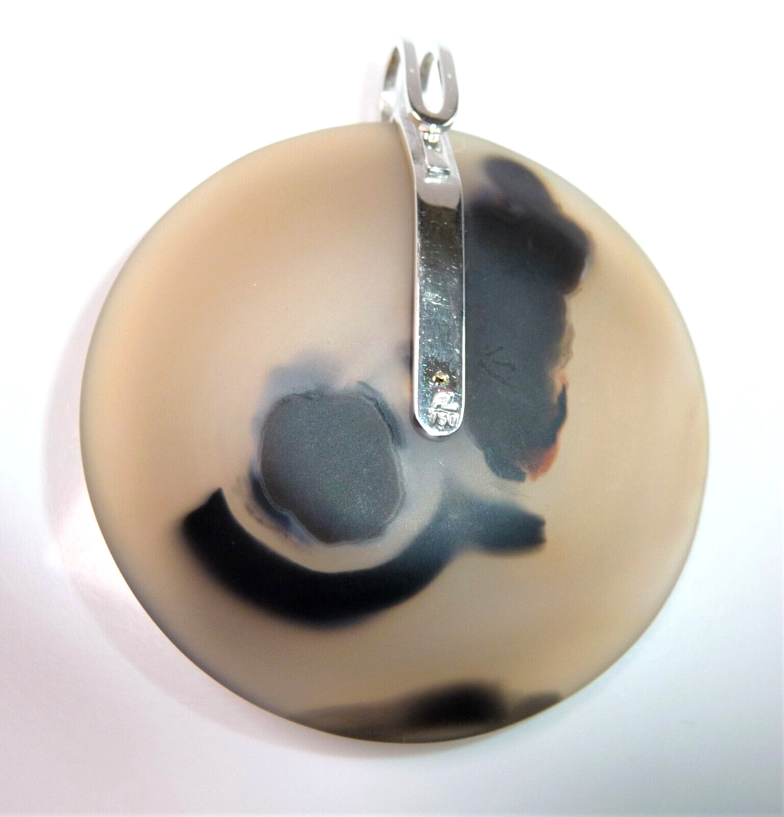 Außergewöhnlicher Design-Anhänger der Goldschmiede Reinhard Ziegler, Köln. Absolutes Einzelstück / Unikat. Der Anhänger hat einen großen semitransparenten Achat, der wie eine runde Schale geschliffen ist mit satinierter Oberfläche. An der "Schale" ist ein Weißgold-Element befestigt, dass einen Streifen mit 13 Diamanten im Brillantschliff von 0.06 ct. (F/VVS) enthält. Gleichzeitig entwickelt sich daraus die sehr große Öse.
