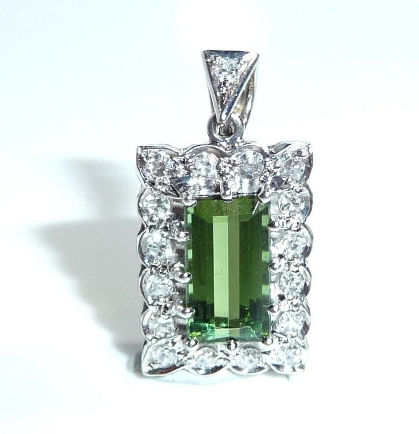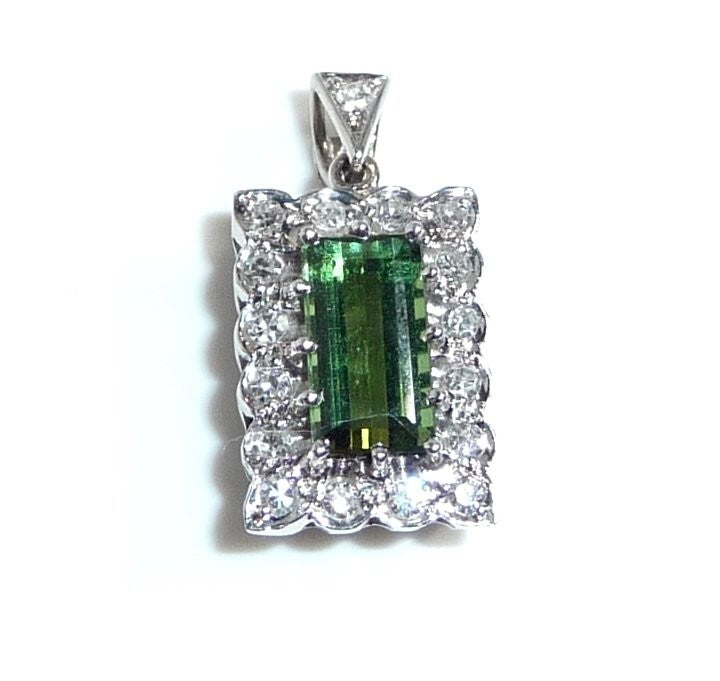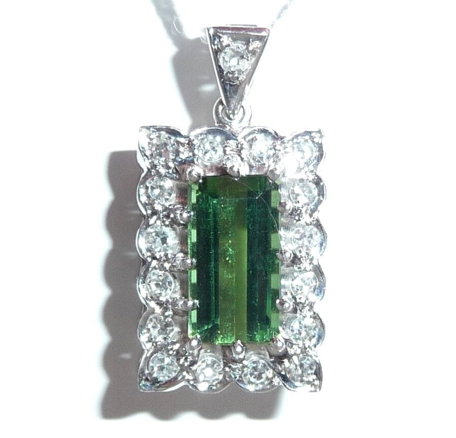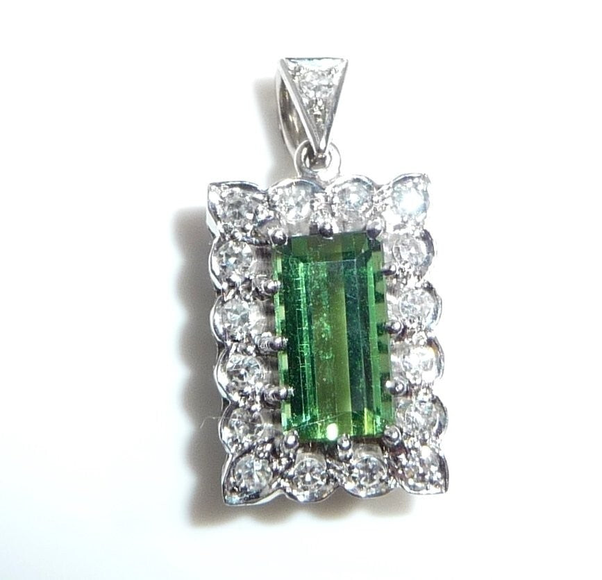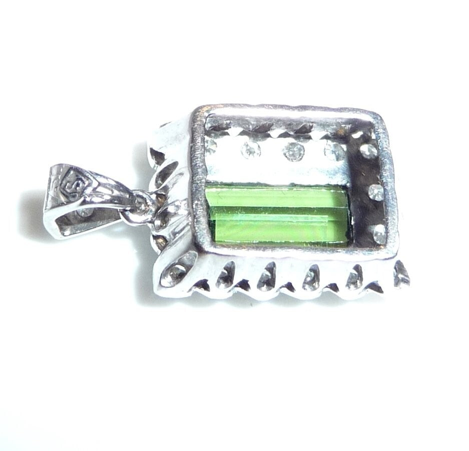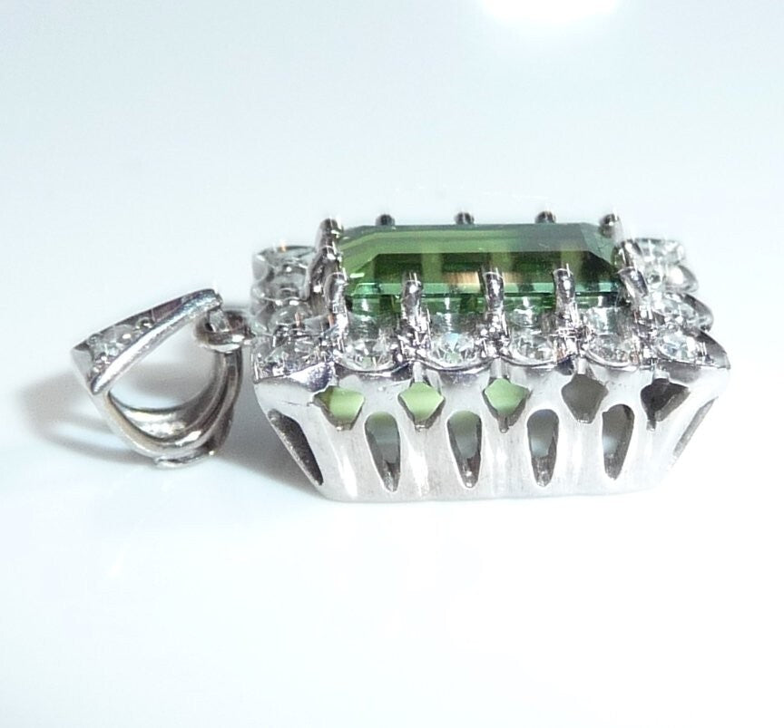 Anhänger in 750 / 18 K Weißgold. Der Anhänger ist ein Goldschmiede-Unikat und von Hand gefertigt. Die Punzierung mit dem Goldschmiede-Signé "S" könnte von Schoeffel sein. Der Anhänger ist rechteckig mit weich gewellten Rändern. Im Zentrum ist ein klarer grüner Turmalin mit einem warmen dunklen Grünton. Der Turmalin wird umrundet von 16 klaren Diamanten im Achtkantschliff. Ein 17. Diamant ist in der Schlaufe eingearbeitet. Zusammen haben die 17 Diamanten 0.34 ct. (F/VVS).