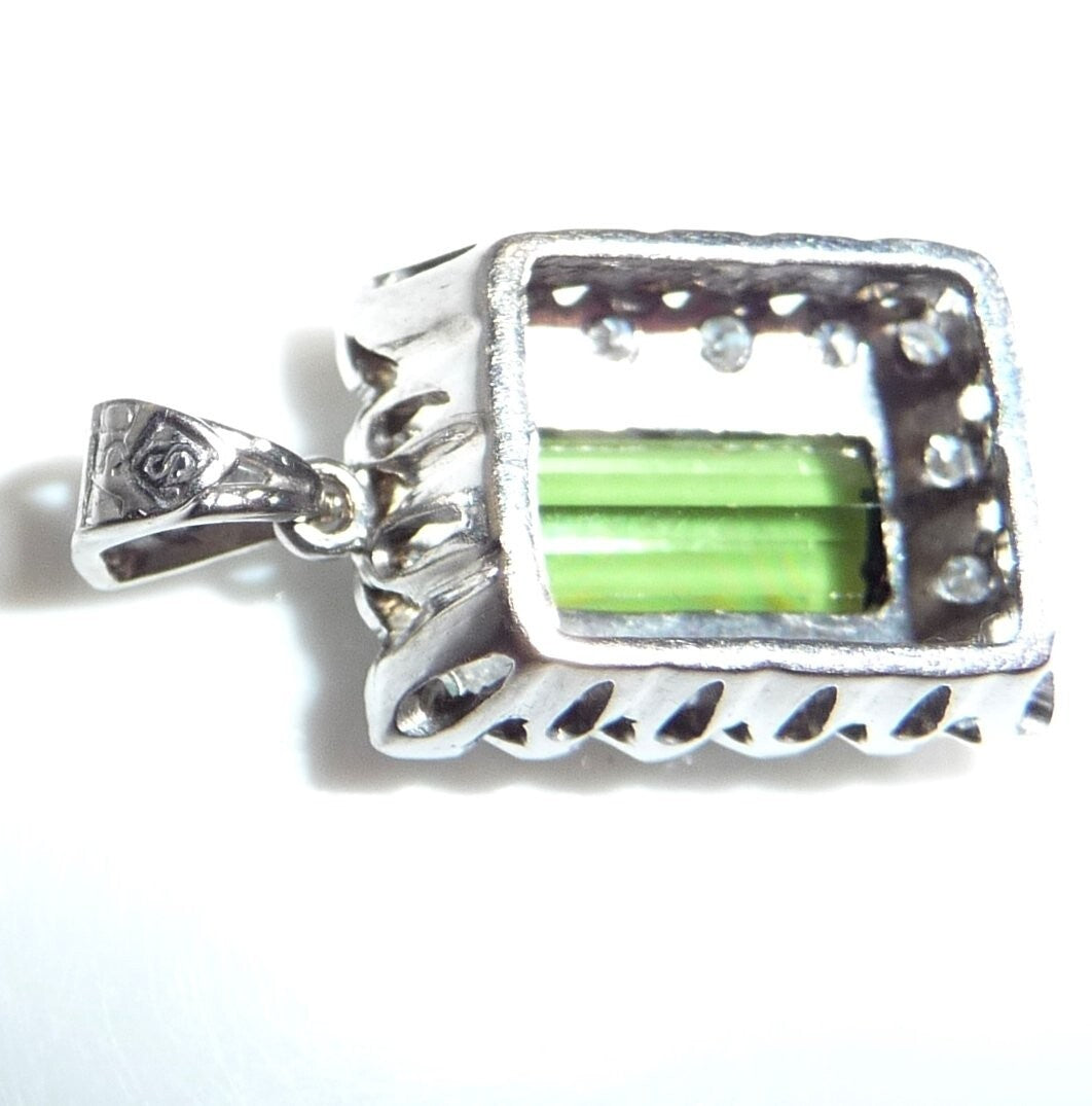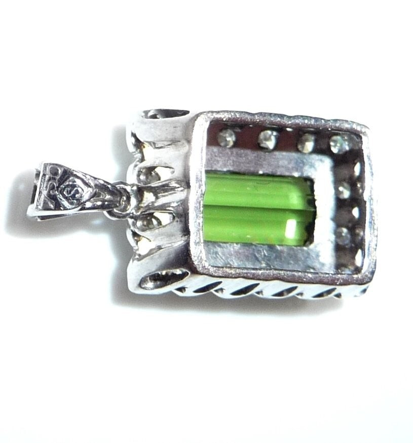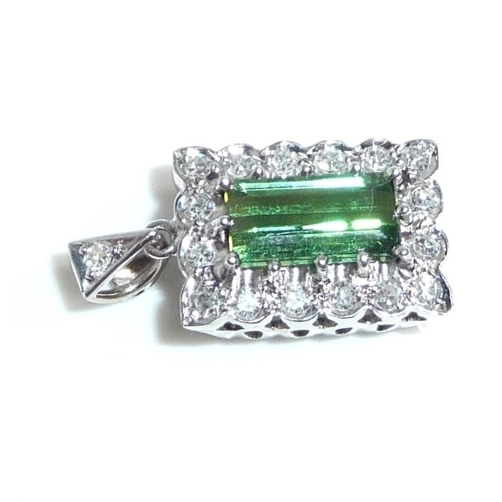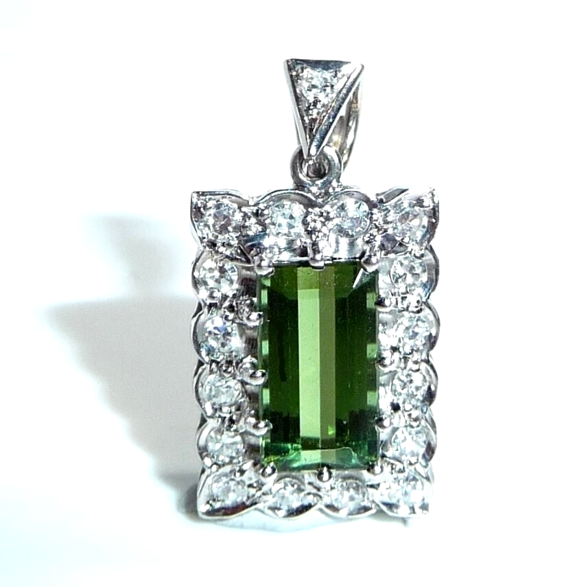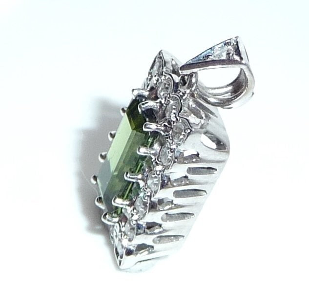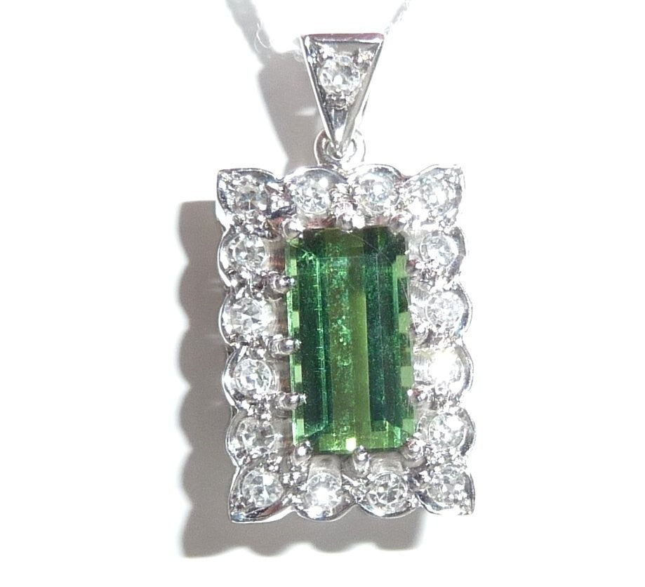Anhänger in 750 / 18 K Weißgold. Der Anhänger ist ein Goldschmiede-Unikat und von Hand gefertigt. Die Punzierung mit dem Goldschmiede-Signé "S" könnte von Schoeffel sein. Der Anhänger ist rechteckig mit weich gewellten Rändern. Im Zentrum ist ein klarer grüner Turmalin mit einem warmen dunklen Grünton. Der Turmalin wird umrundet von 16 klaren Diamanten im Achtkantschliff. Ein 17. Diamant ist in der Schlaufe eingearbeitet. Zusammen haben die 17 Diamanten 0.34 ct. (F/VVS).