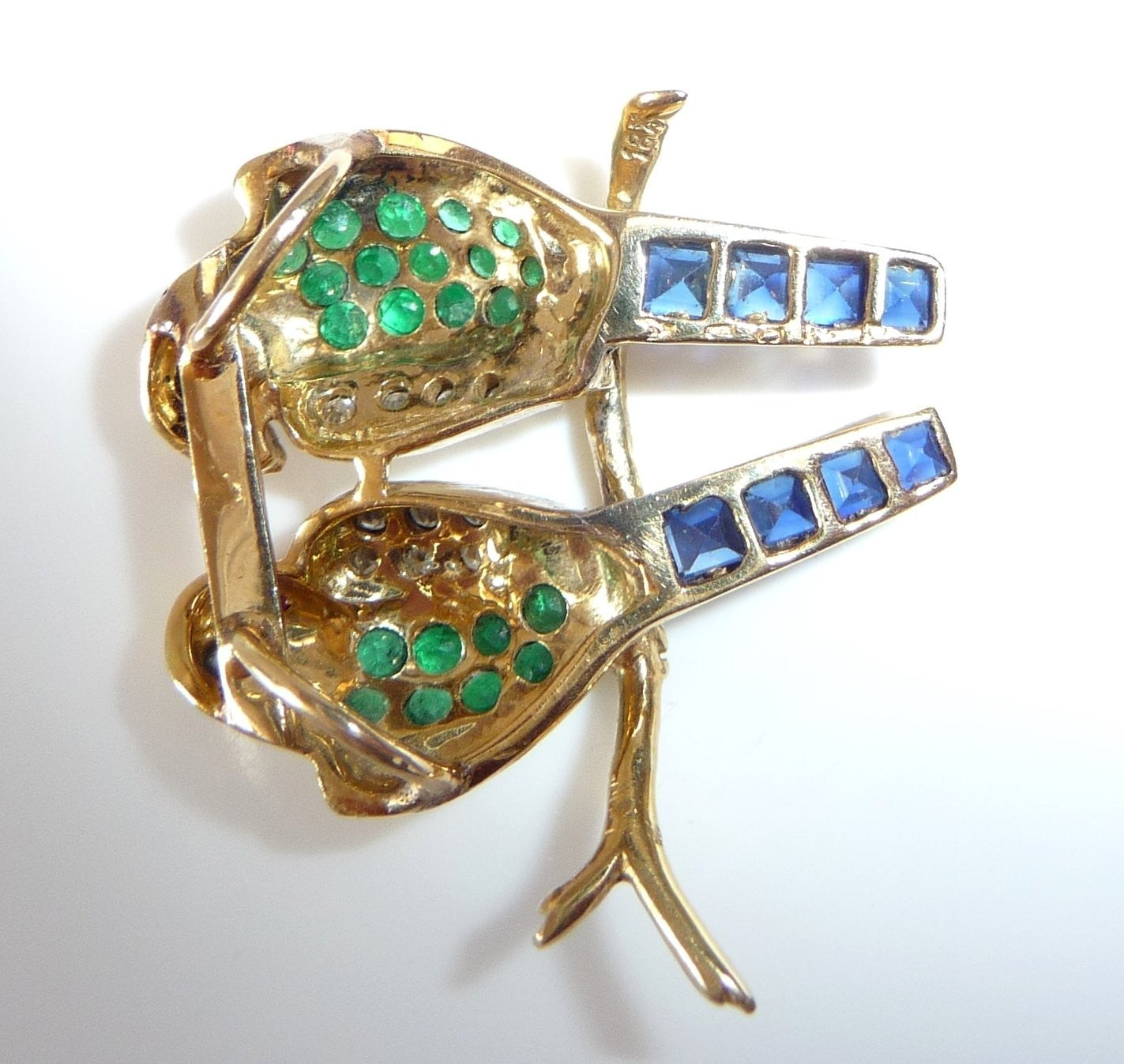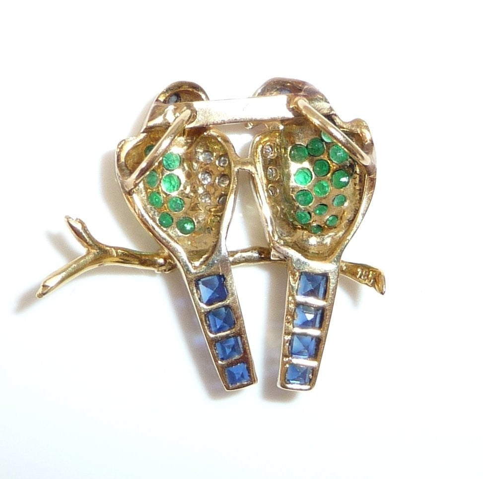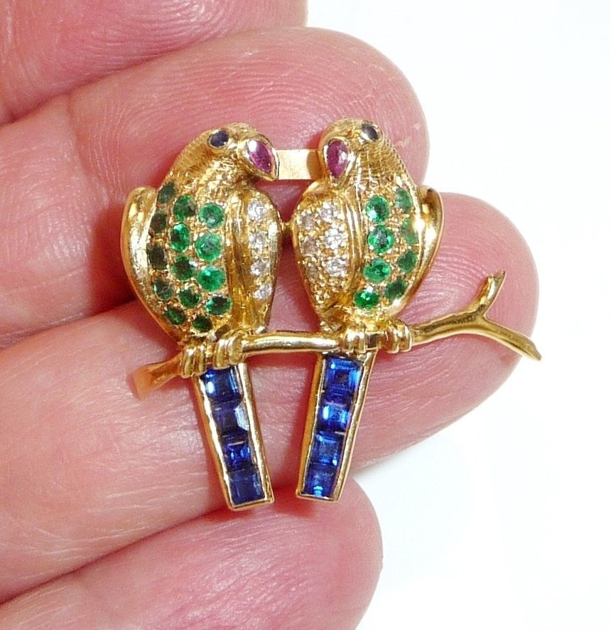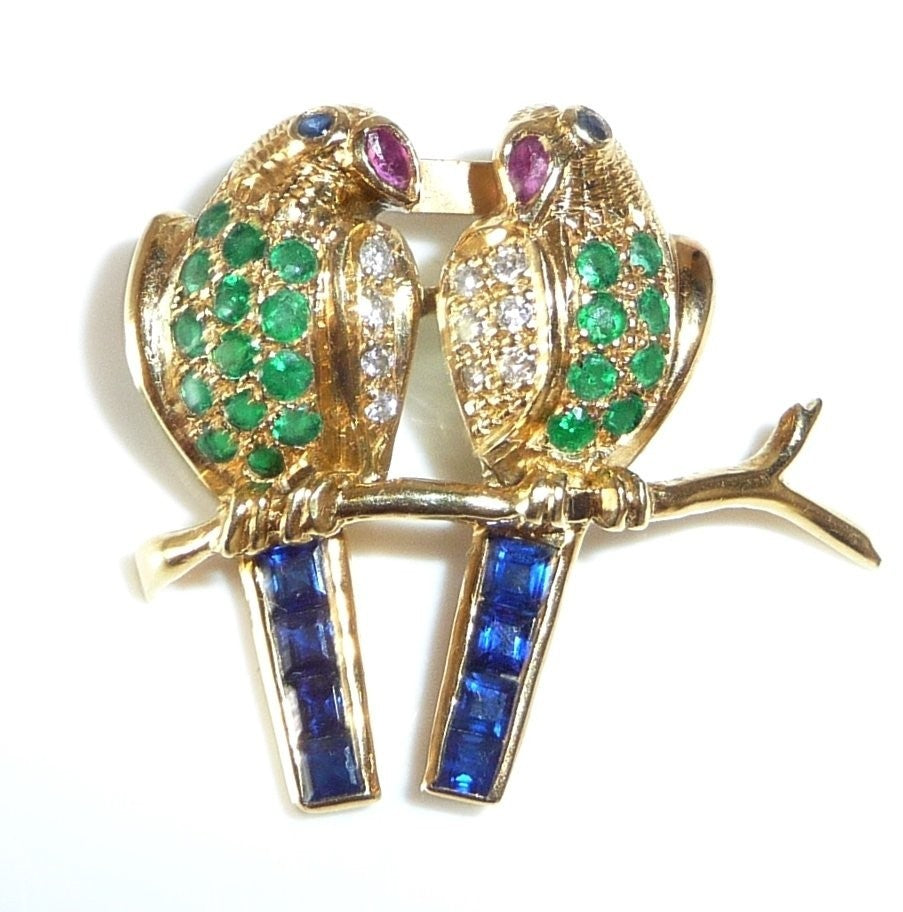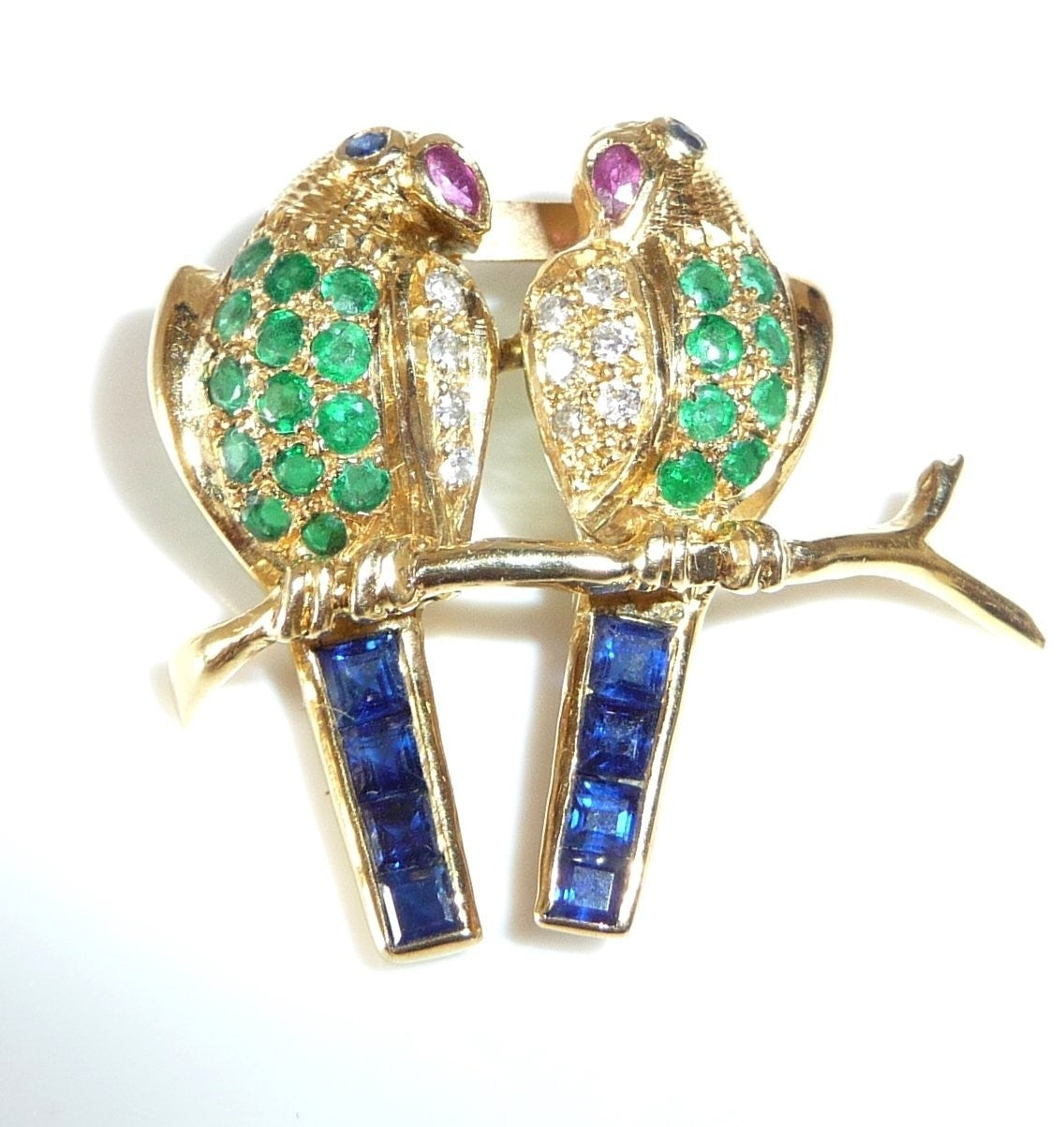 Die beiden kleinen Papageien sind ein Kunstwerk in Gold und Edelstein.