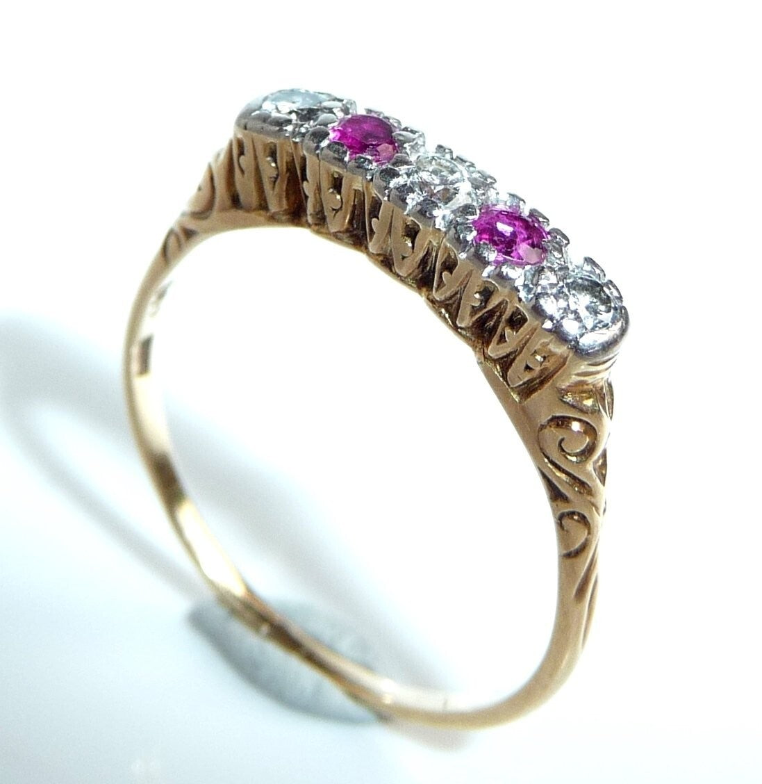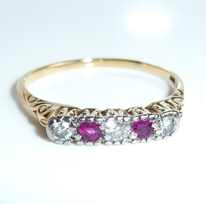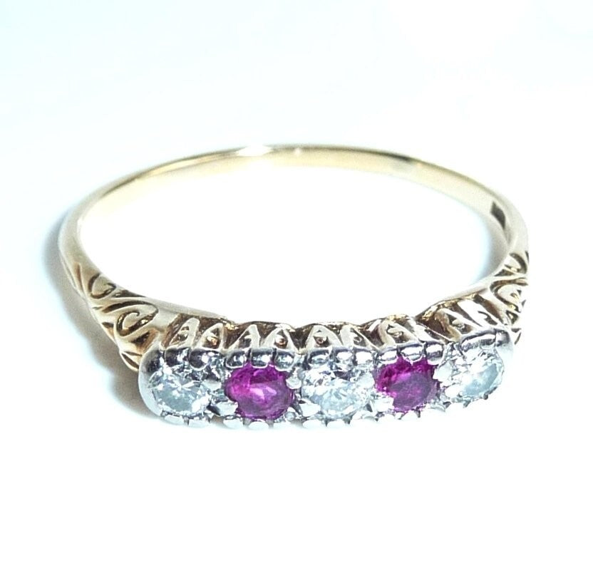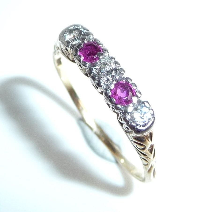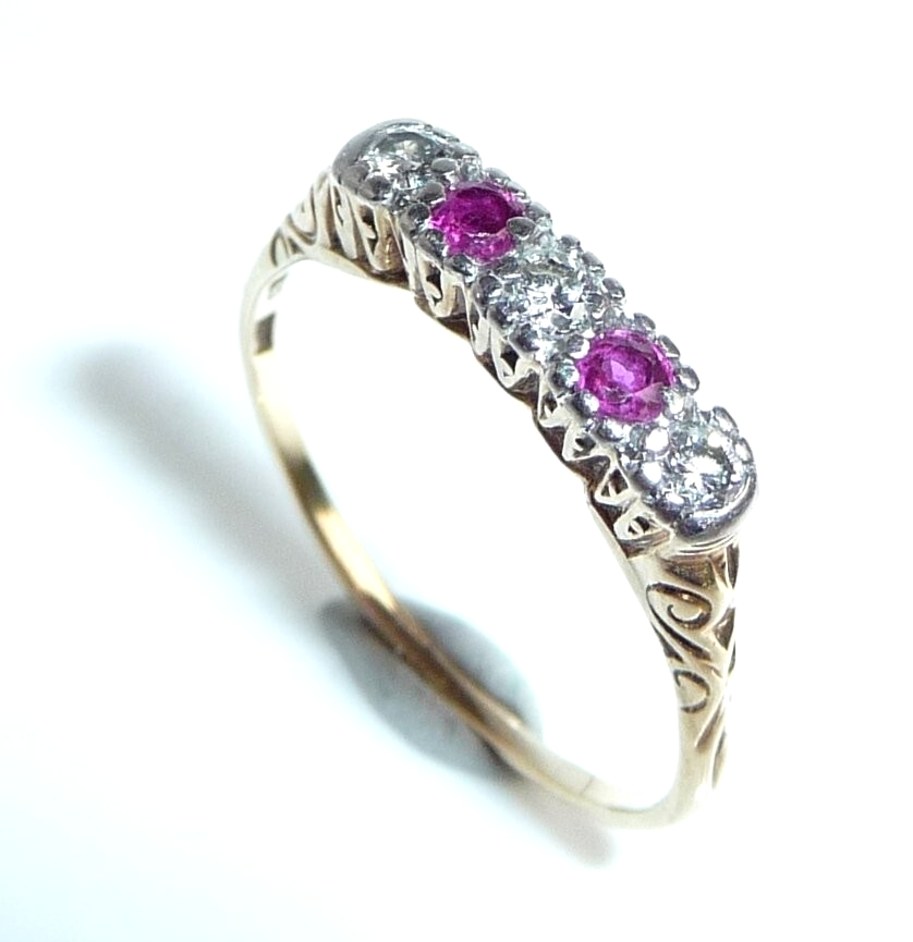 Antiker Ring, gearbeitet in 14 K / 585 Gelbgold. Das Design ist quer zum Finger arrangiert und verzaubert mit seitlichen Ornamenten im Ringkopf. Die 5 Edelsteine sind in eine Schicht Platin eingefasst. 3 Diamanten im frühen Brillantschliff haben zusammen 0.15 ct. (F/VS). Die 3 Diamanten werden kontrastiert durch 2 blutrote Rubine von total 0.10 ct.