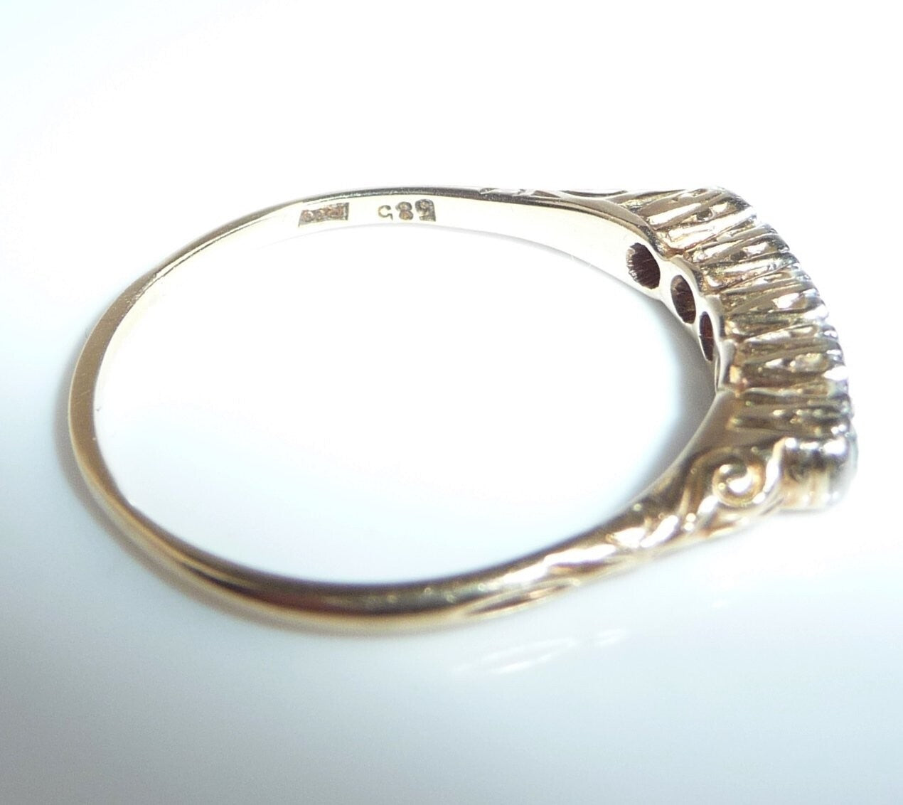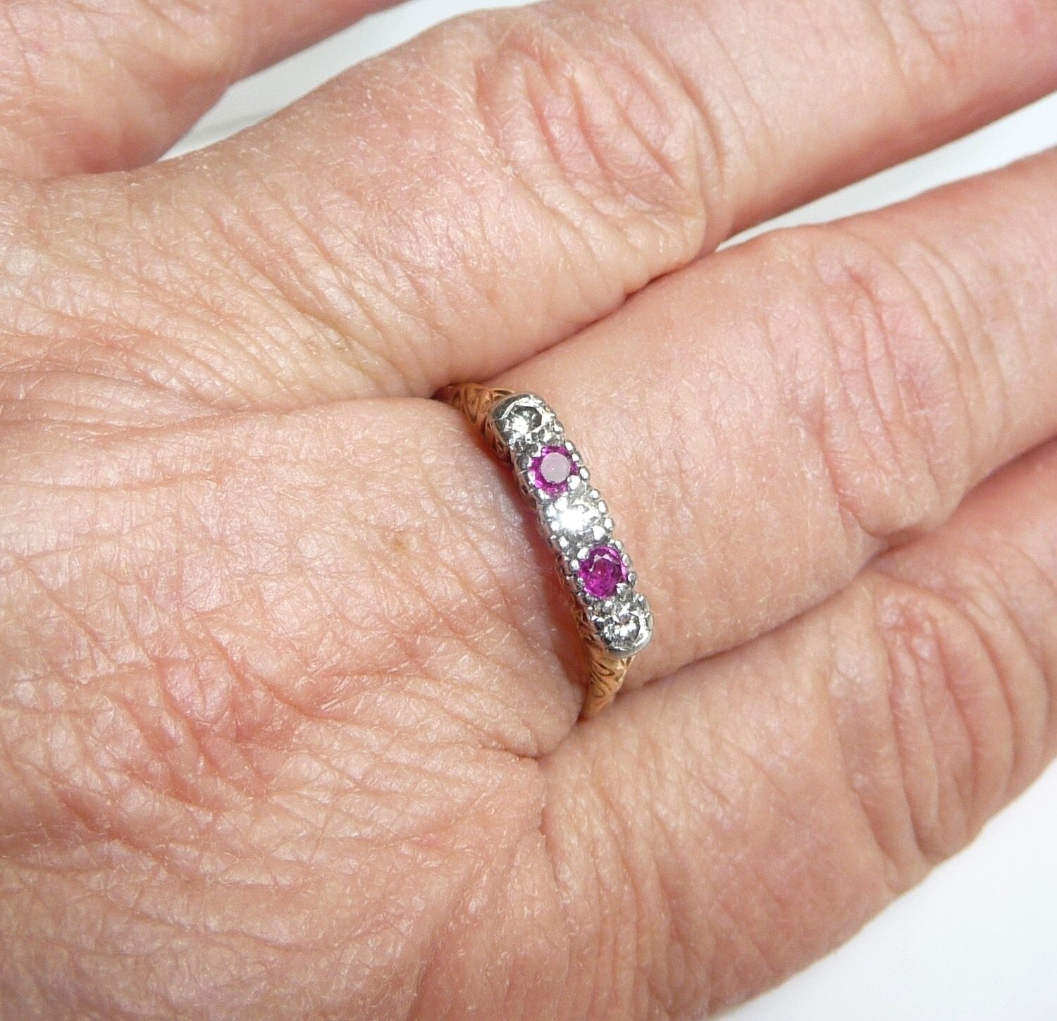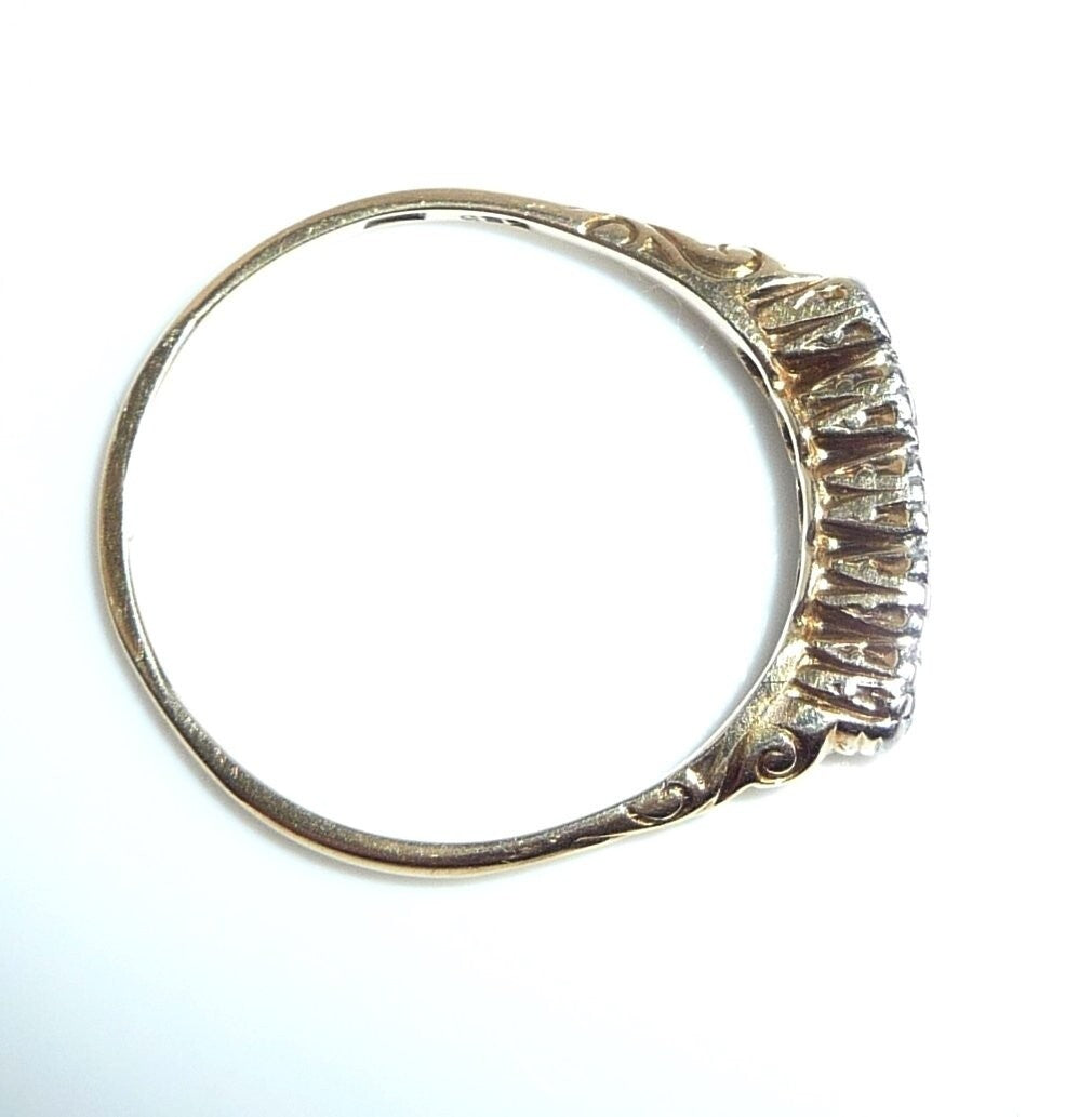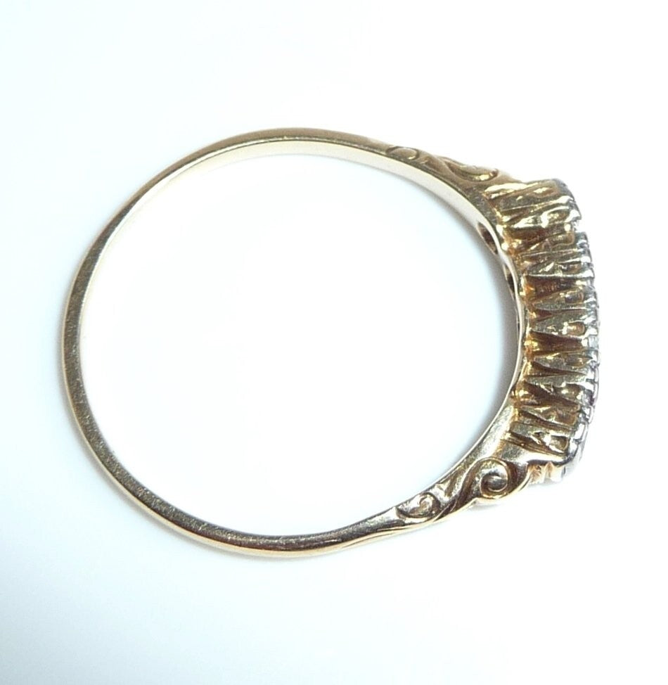 Antiker Ring, gearbeitet in 14 K / 585 Gelbgold. Das Design ist quer zum Finger arrangiert und verzaubert mit seitlichen Ornamenten im Ringkopf. Die 5 Edelsteine sind in eine Schicht Platin eingefasst. 3 Diamanten im frühen Brillantschliff haben zusammen 0.15 ct. (F/VS). Die 3 Diamanten werden kontrastiert durch 2 blutrote Rubine von total 0.10 ct.
