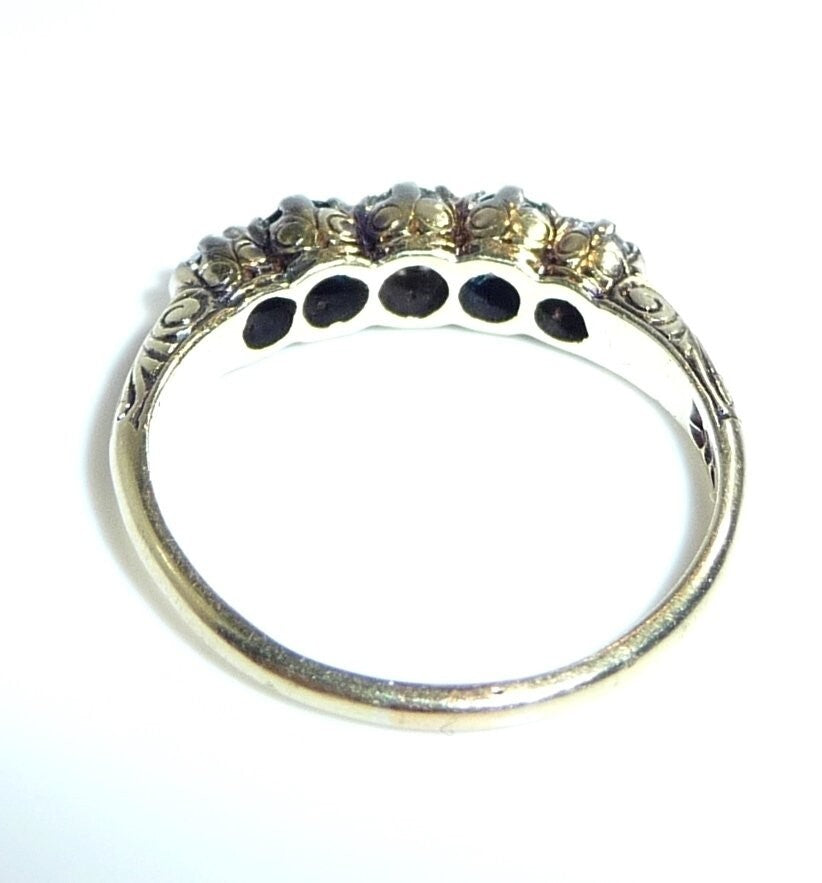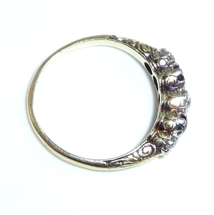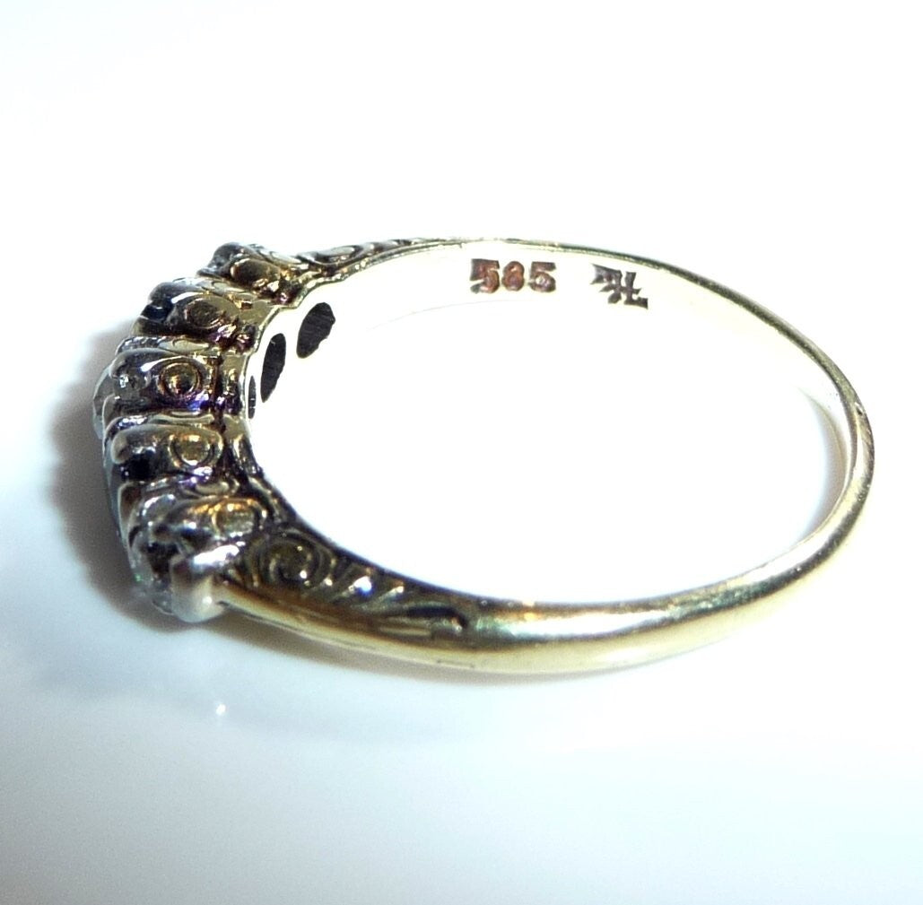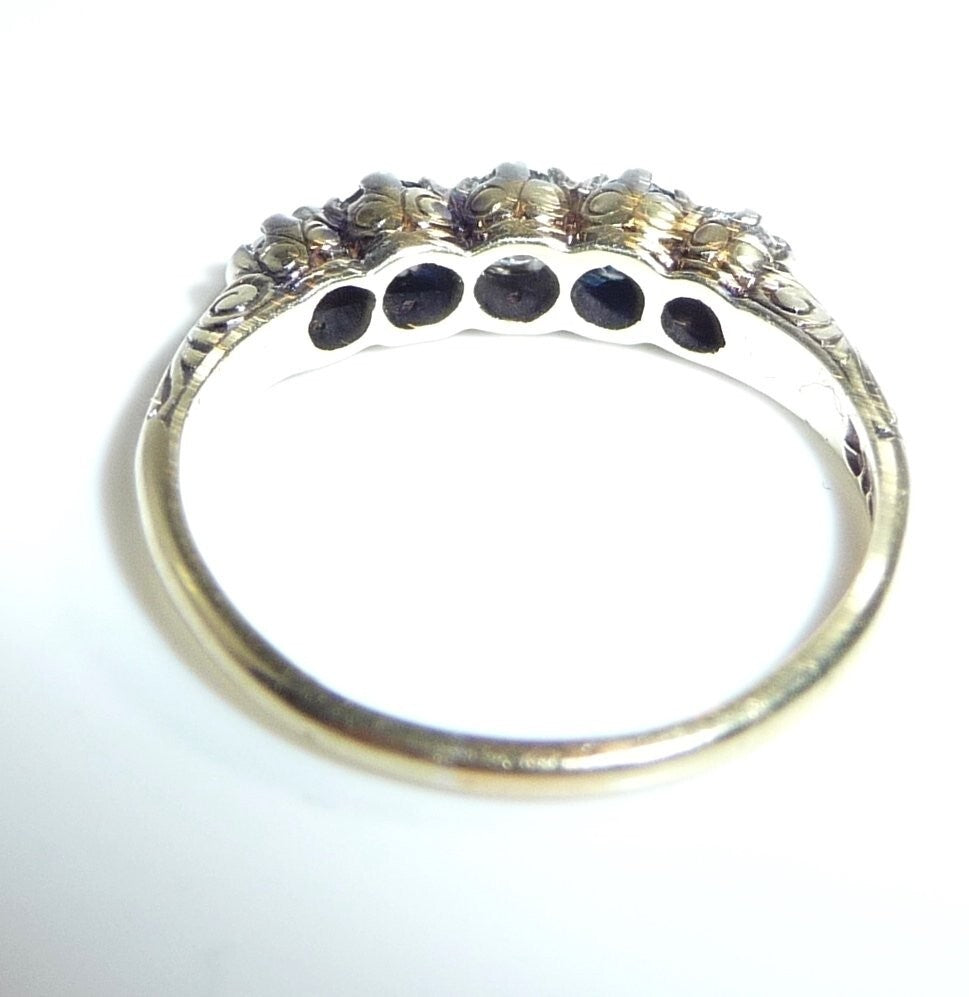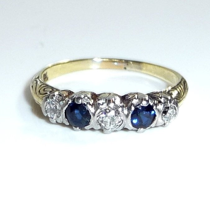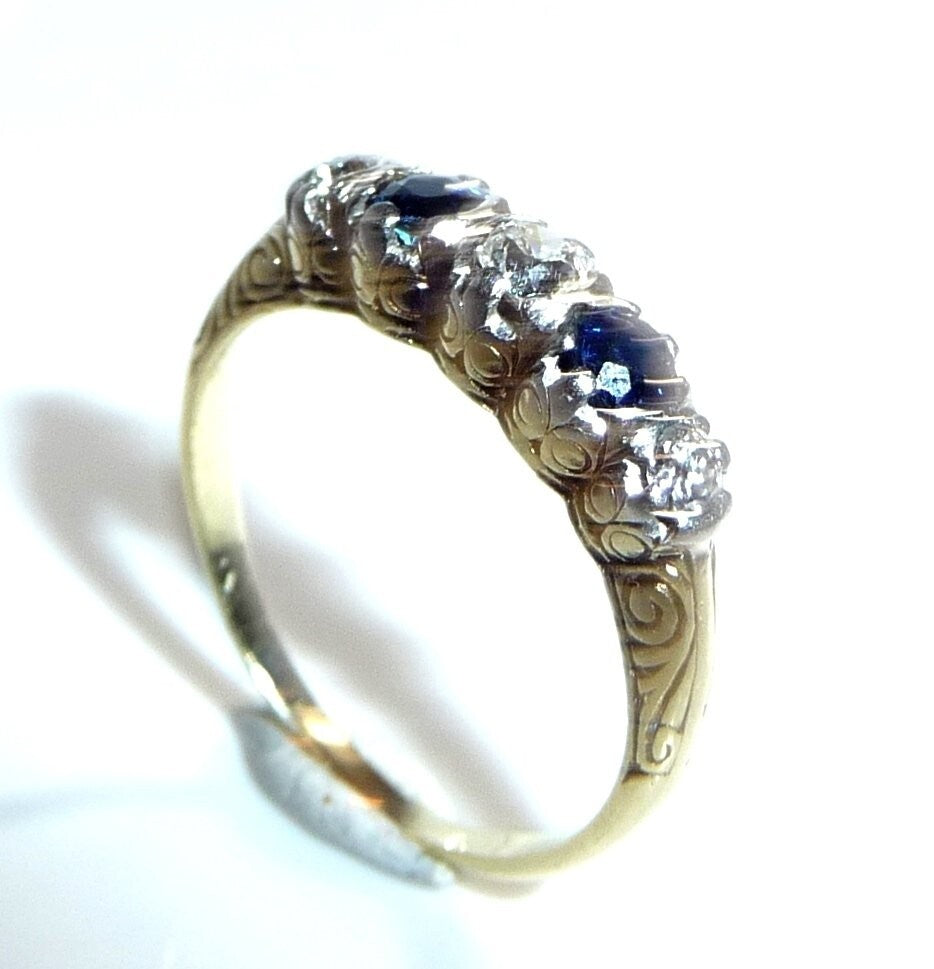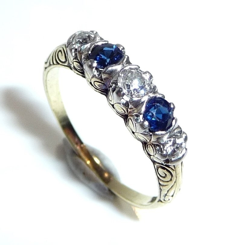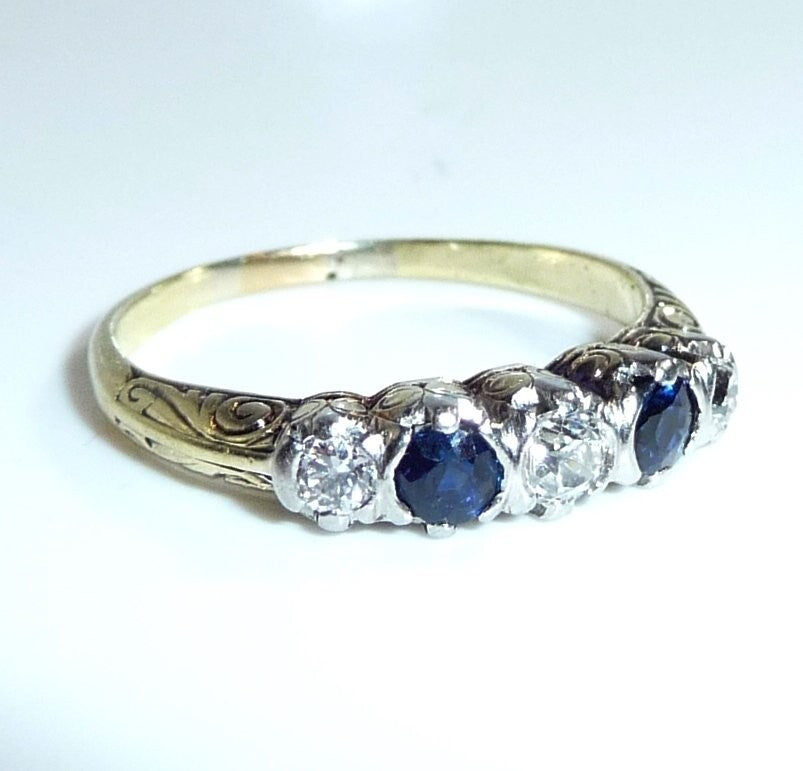 Antiker Ring, gearbeitet in 14 K / 585 Gelbgold. Der Reihenring ist quer zum Finger arrangiert und kann sehr gut als Vorsteckring mit anderen Ringen kombiniert werden. Die Seiten-Partien sind mit schönen Mustern graviert. Die 5 Edelsteine sind im oberen Bereich in Platin gefasst. Eingefasst sind 3 Diamanten im antiken Europäischen Schliff von total 0.20 ct. (1 x 0.10ct und 2 x 0.05 ct.). Farbe F und Reinheit VVS-VS. Zwischen die Diamanten sind 2 Saphire von total 0.20 ct. eingefasst.