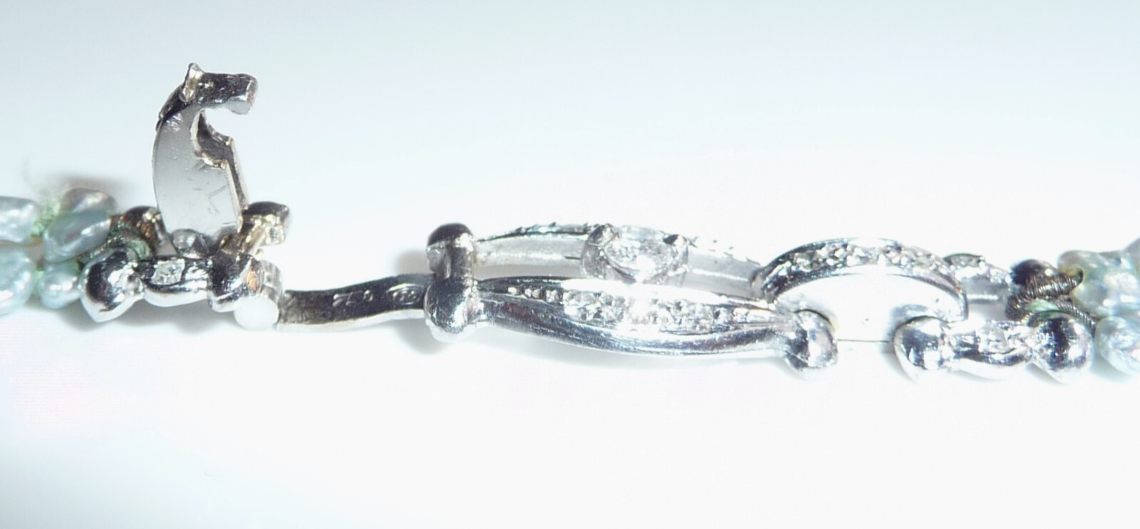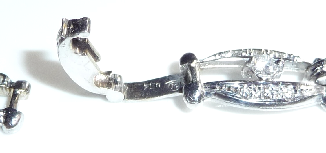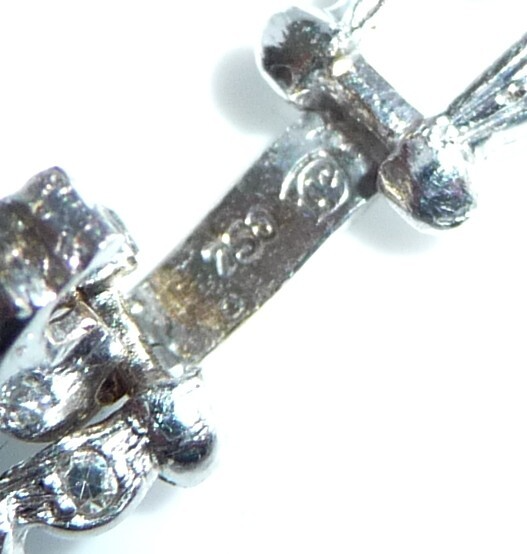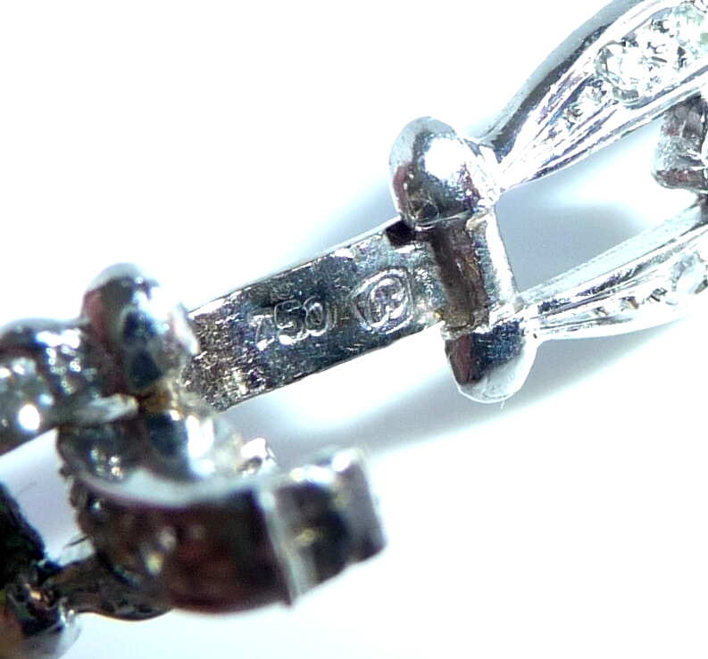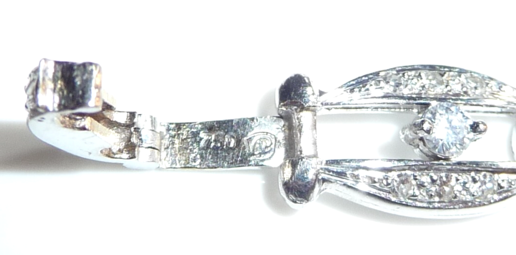 Besonders reizvoll ist das mehrgliedrige Weißgold-Schloss in 750 / 18 K Weißgold. Es erinnert an den Stil der Art Deco-Periode. Insgesamt sind 16 Diamanten im Achtkantschliff und 1 Diamant im Brillant-Vollschliff von 0,08 ct. eingefasst. Total etwa 0,25 ct. (G-F/VS).