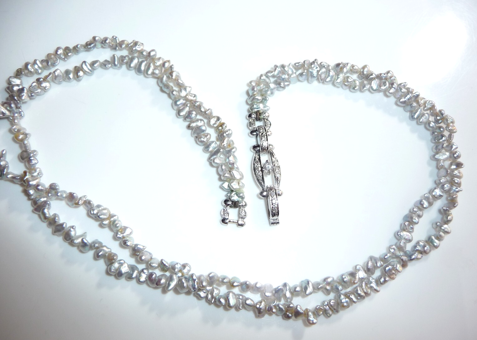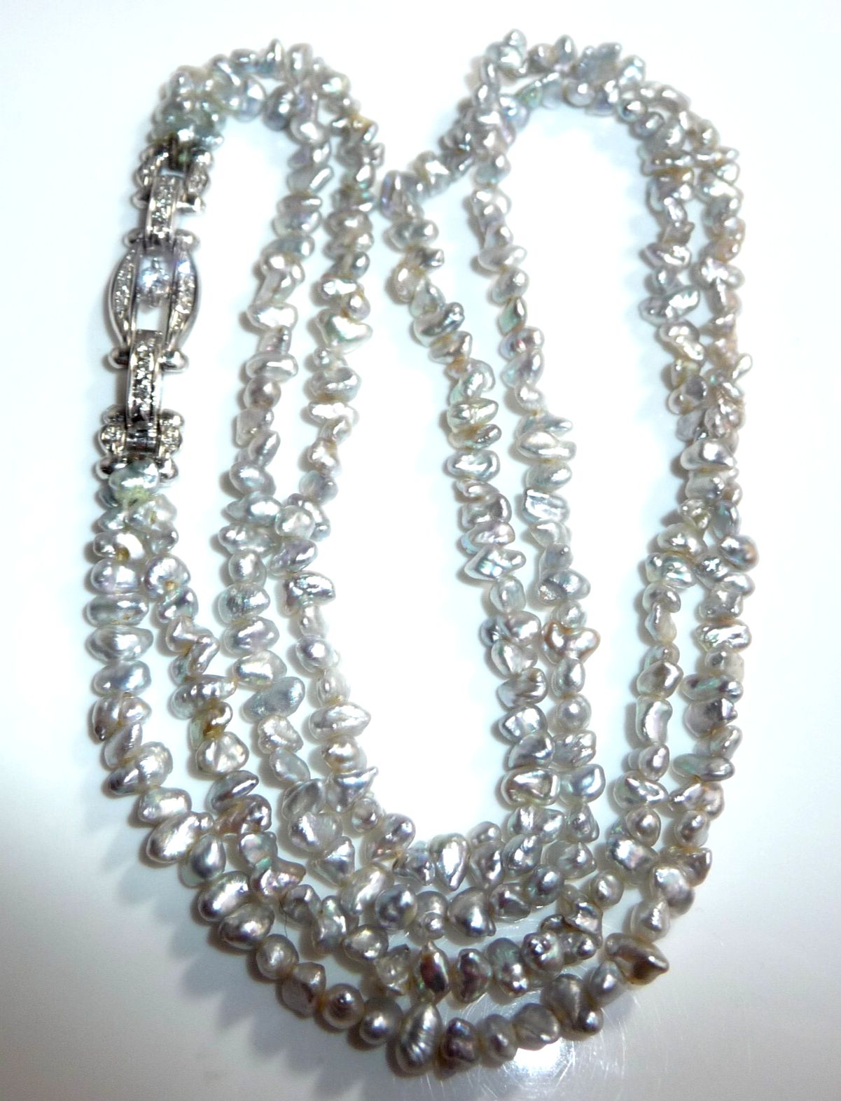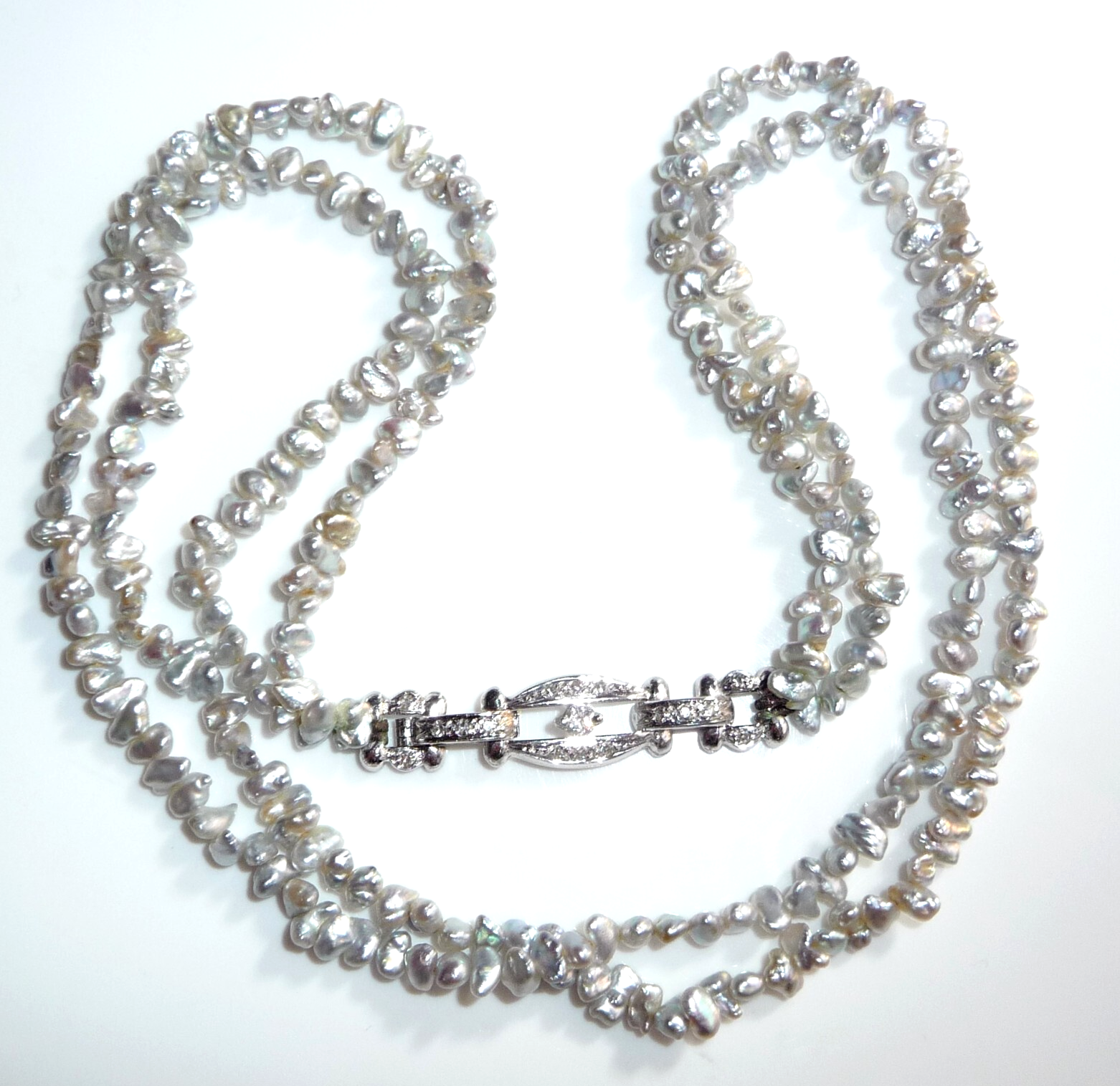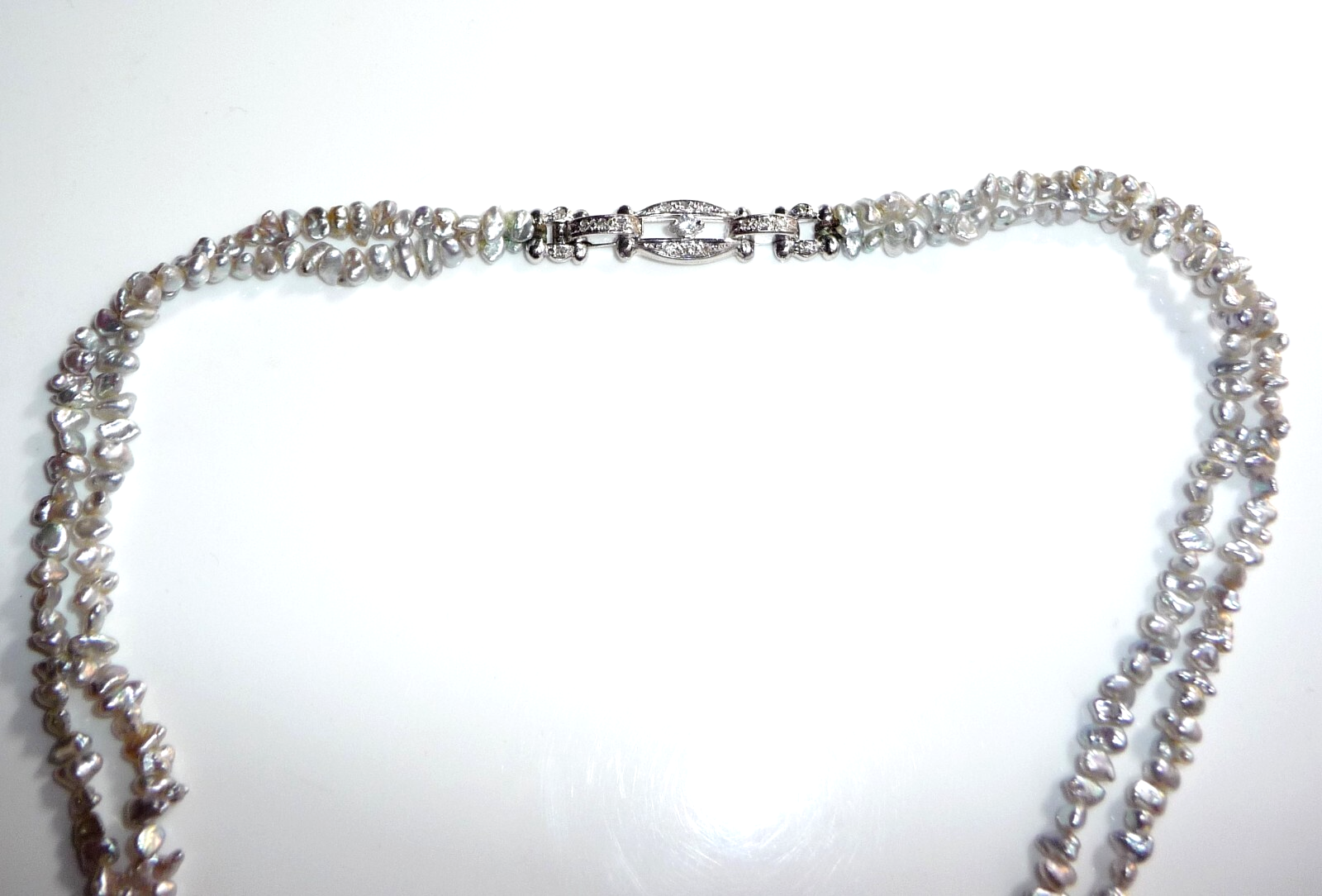 Collier-Kette - doppelreihige Perlenkette mit 18 K / 750 Weißgold-Schloss. Gefertigt von dem Nobel-Juwelier Rüschenbeck. Die Perlenkette hat zwei Stränge mit feinen Keshi aufgereiht. Die kleinen Keshi Perl-Nuggets haben eine silber-graue Farbe mit extrem feinem Lüster. Insgesamt sind etwa 260-270 Perlen aufgereiht. Die Perlen sind quer gebohrt und haben dadurch eine grö0ßere Breite von durchschnittlich 4,3 mm.