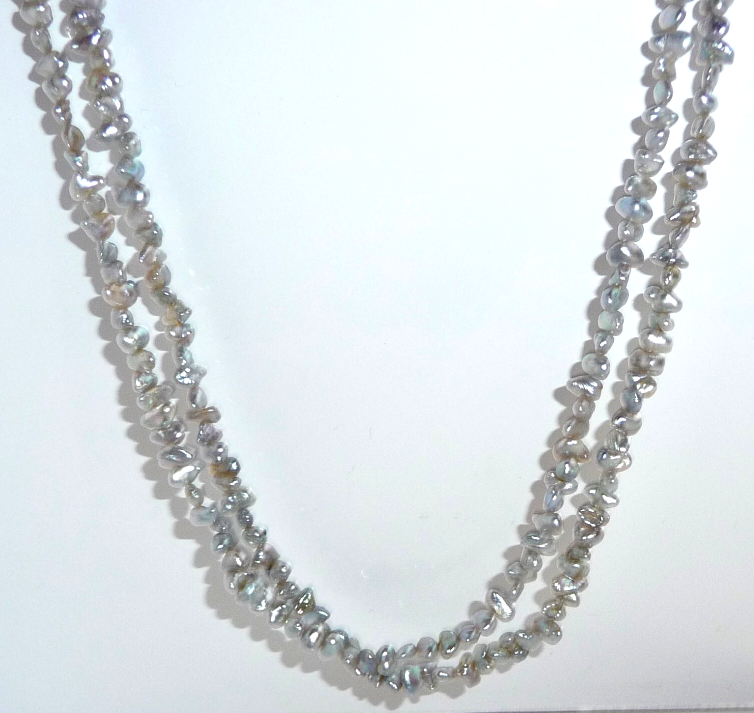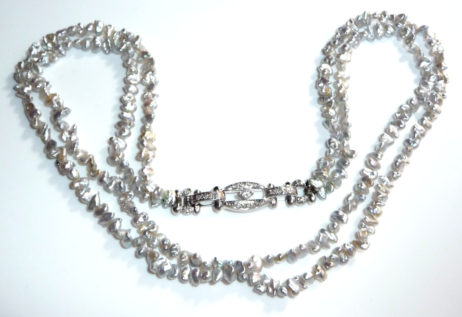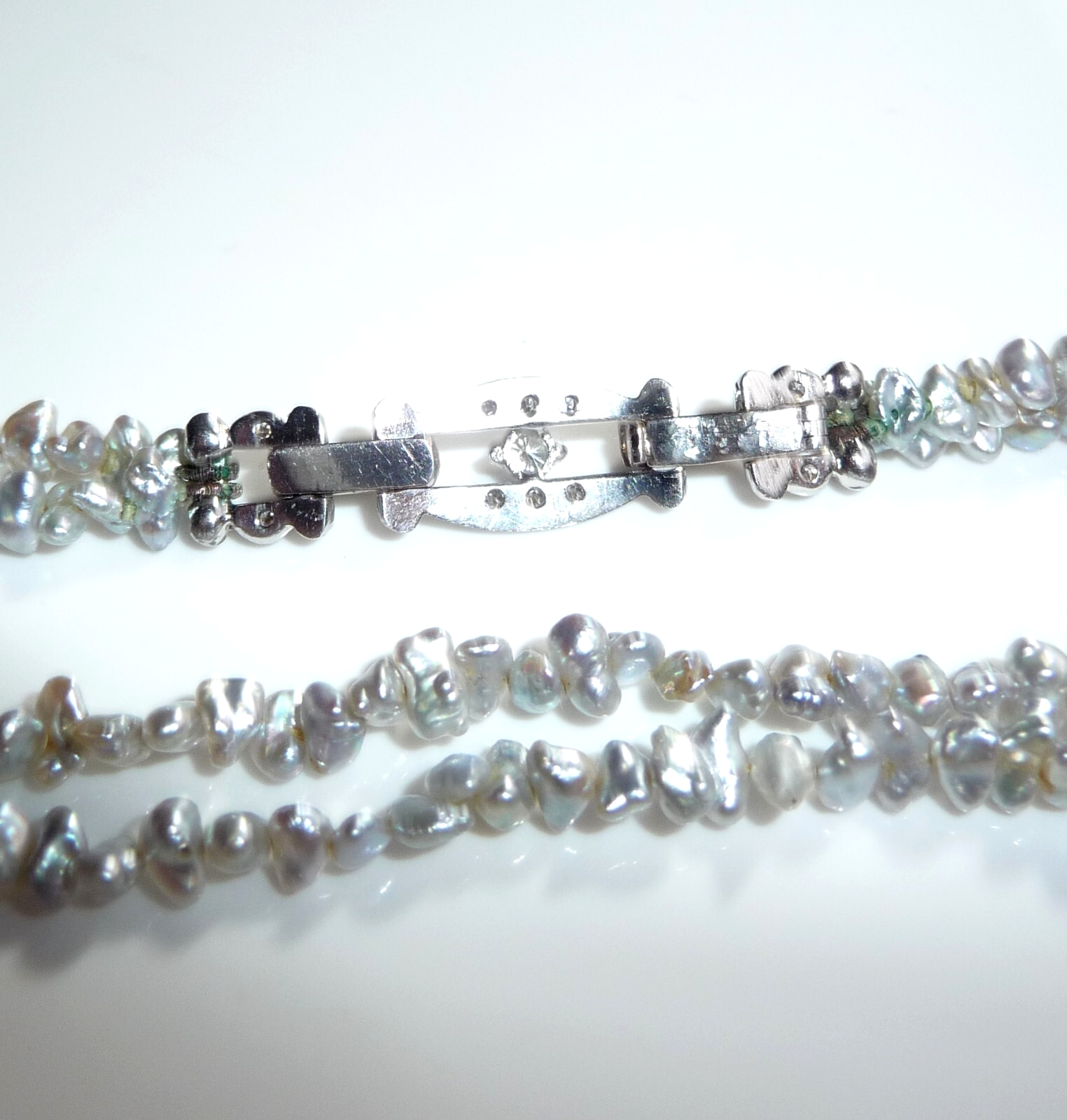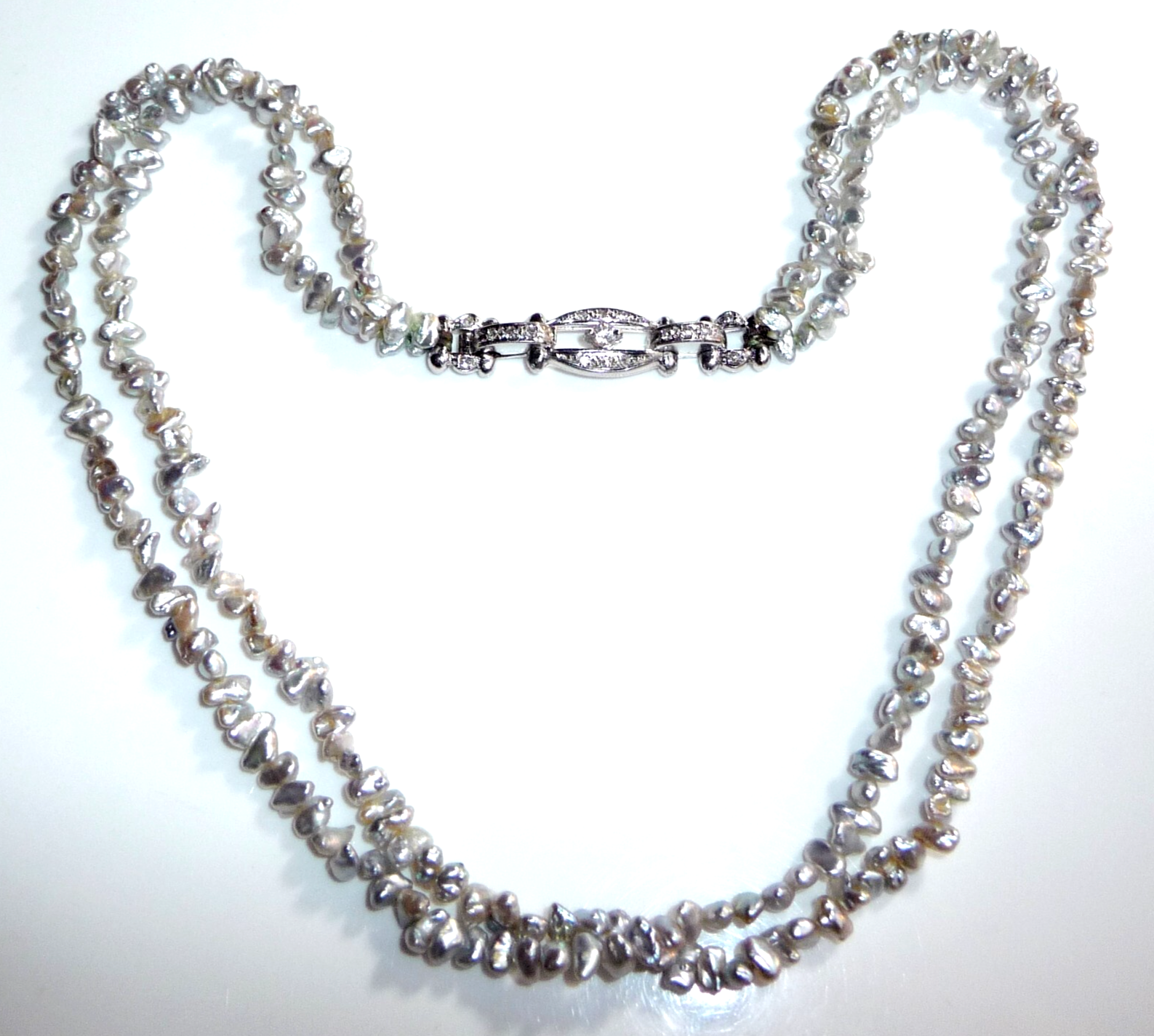Collier-Kette - doppelreihige Perlenkette mit 18 K / 750 Weißgold-Schloss. Gefertigt von dem Nobel-Juwelier Rüschenbeck. Die Perlenkette hat zwei Stränge mit feinen Keshi aufgereiht. Die kleinen Keshi Perl-Nuggets haben eine silber-graue Farbe mit extrem feinem Lüster. Insgesamt sind etwa 260-270 Perlen aufgereiht. Die Perlen sind quer gebohrt und haben dadurch eine grö0ßere Breite von durchschnittlich 4,3 mm.