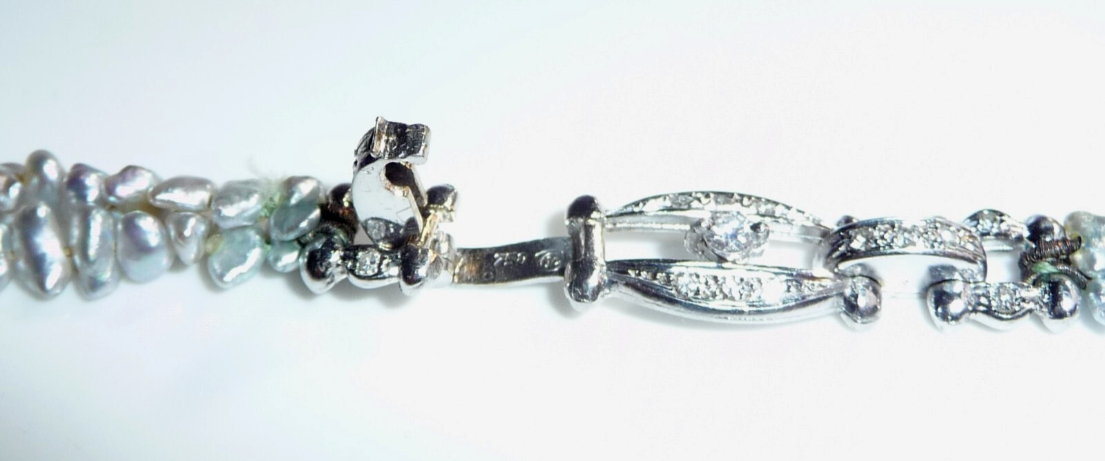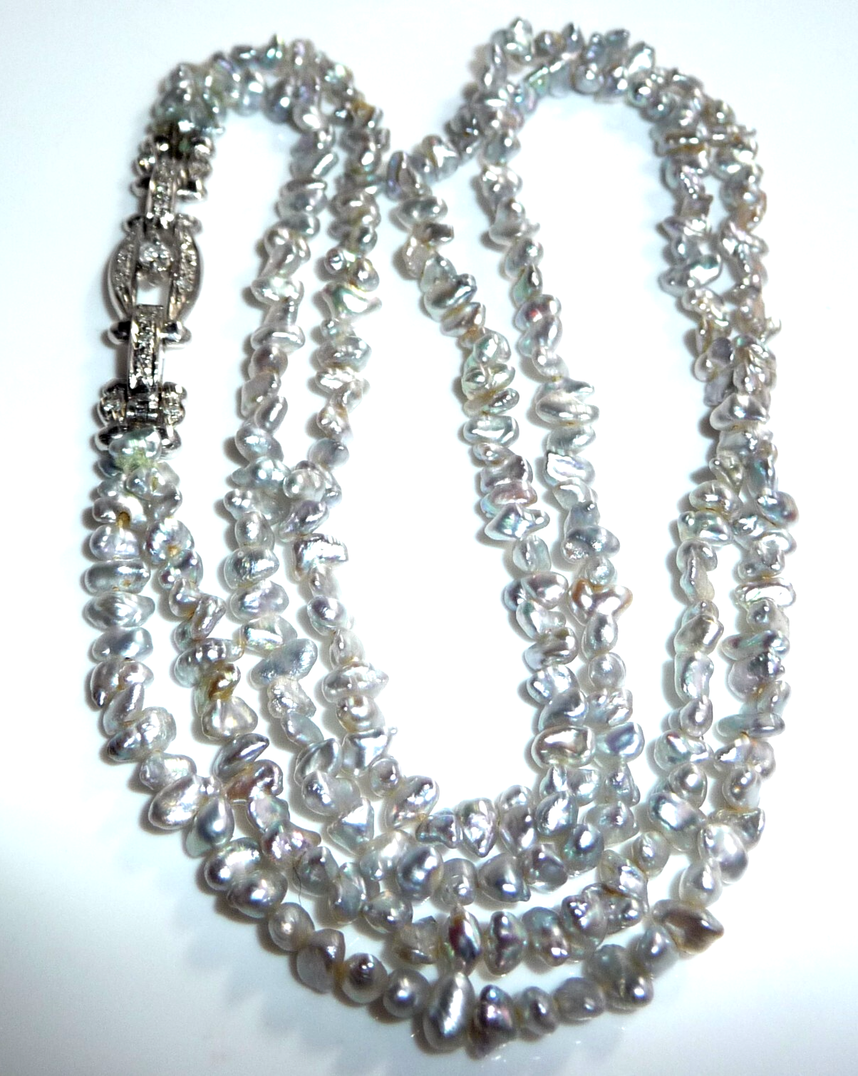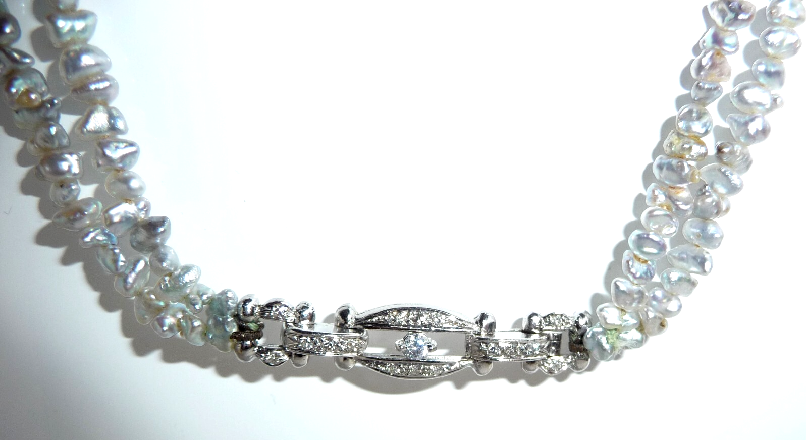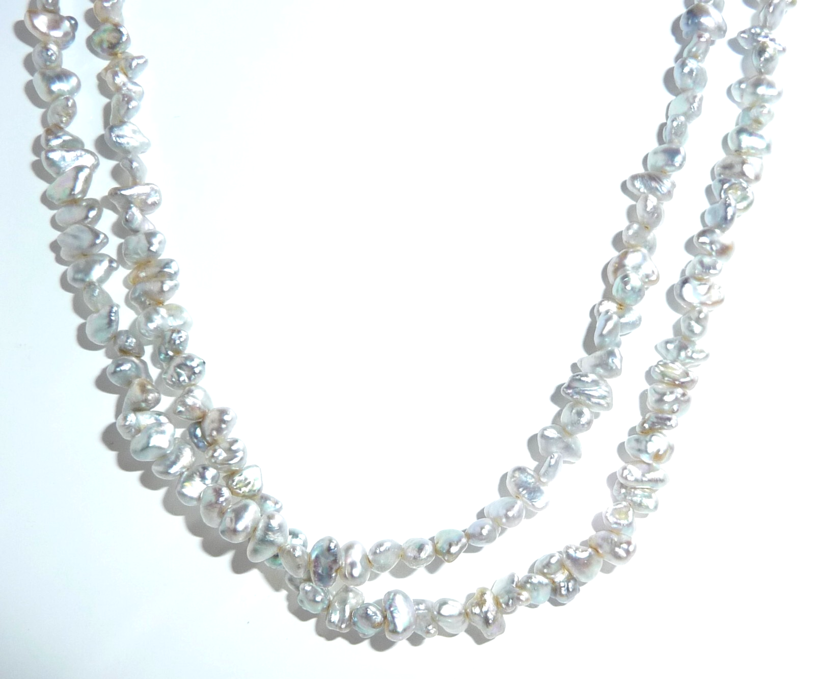 Collier-Kette - doppelreihige Perlenkette mit 18 K / 750 Weißgold-Schloss. Gefertigt von dem Nobel-Juwelier Rüschenbeck. Die Perlenkette hat zwei Stränge mit feinen Keshi aufgereiht. Die kleinen Keshi Perl-Nuggets haben eine silber-graue Farbe mit extrem feinem Lüster. Insgesamt sind etwa 260-270 Perlen aufgereiht. Die Perlen sind quer gebohrt und haben dadurch eine grö0ßere Breite von durchschnittlich 4,3 mm.