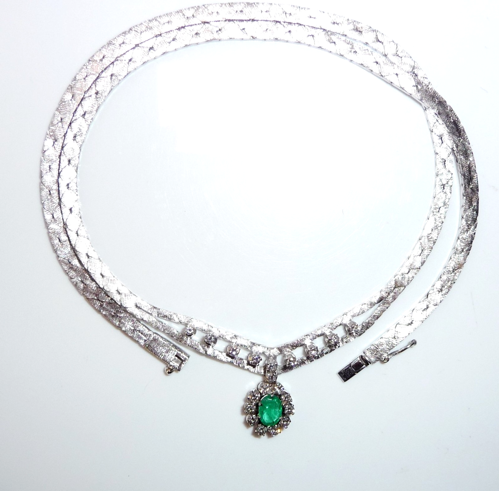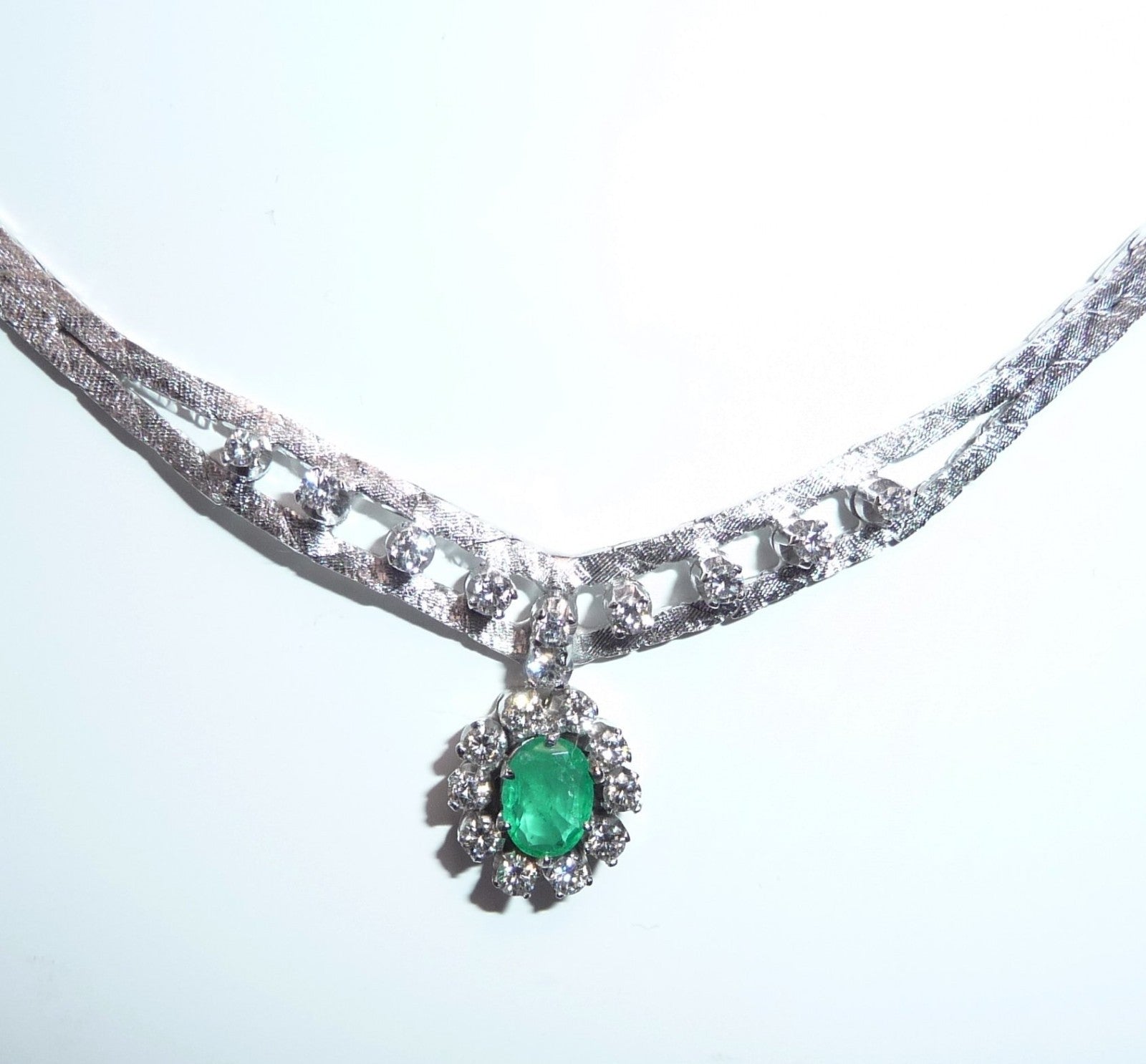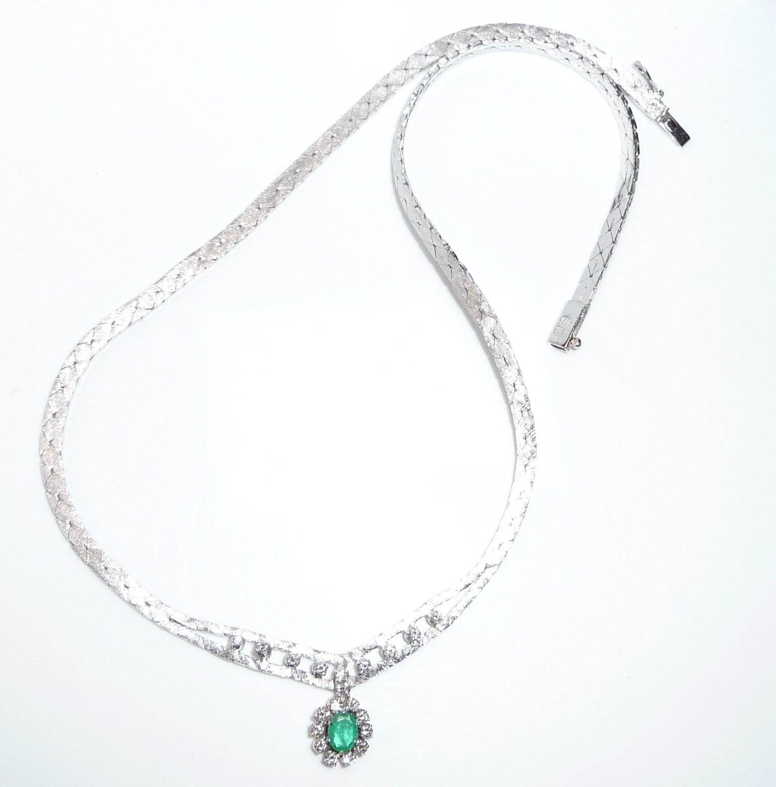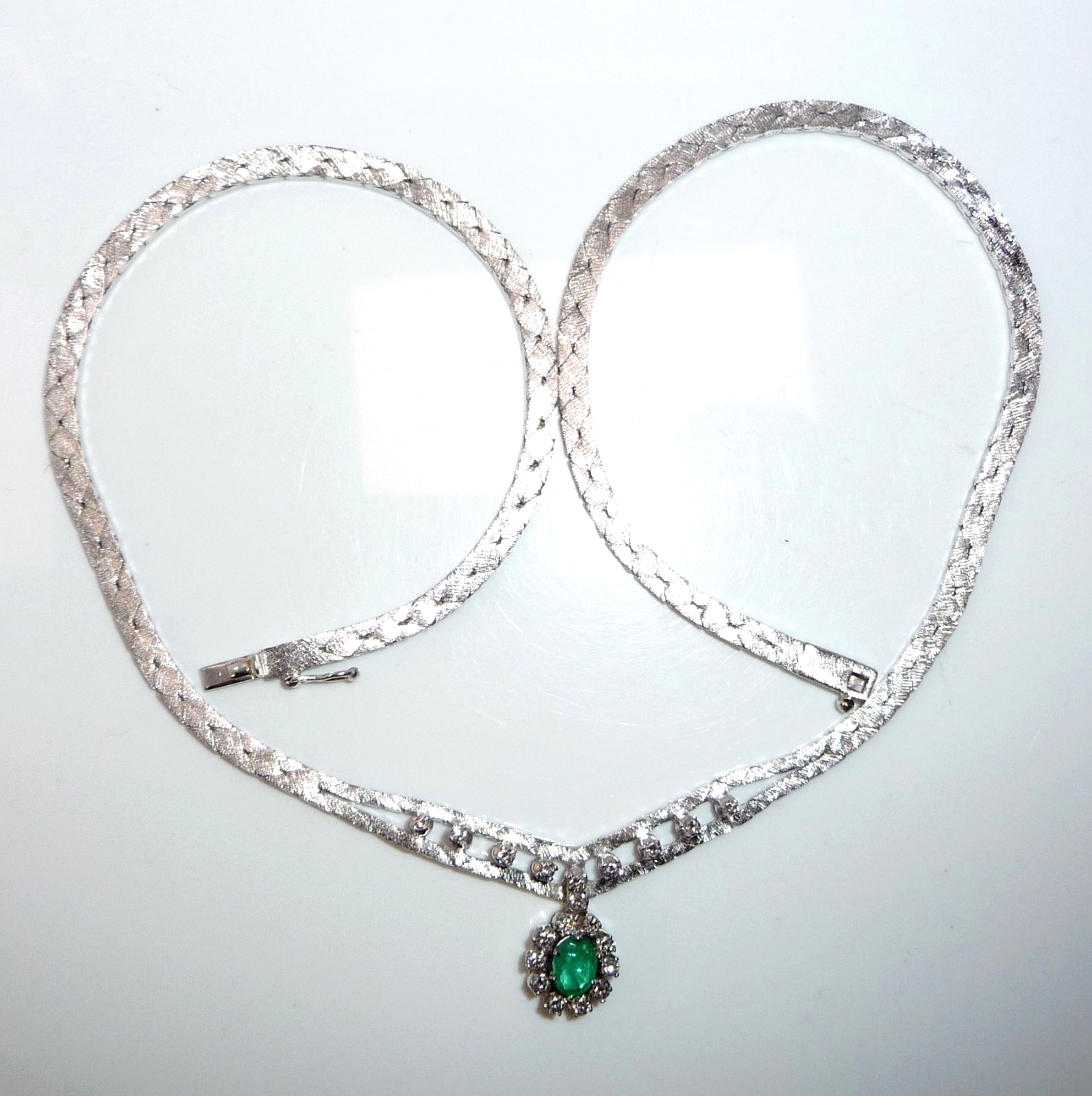 Collier-Kette in 14 K / 585 Weißgold. Das Collier hat eine edel mattierte, flache Schlangenkette, die sich im Zentrum teilt. 10 Diamanten im Brillantschliff von zusammen 0.30 ct. schmücken den Mittelteil. Eine ovale, bewegliche Abhängung wird zum Blickfang des Colliers. Im Zentrum ist ein Smaragd in frischem Grün von 0.40 ct.. Der Smaragd wird umrundet von 10 Diamanten im Brillantschliff von zusammen nochmal 0.40 ct. Diamanten total: 0.70 ct. /G-F/VS).