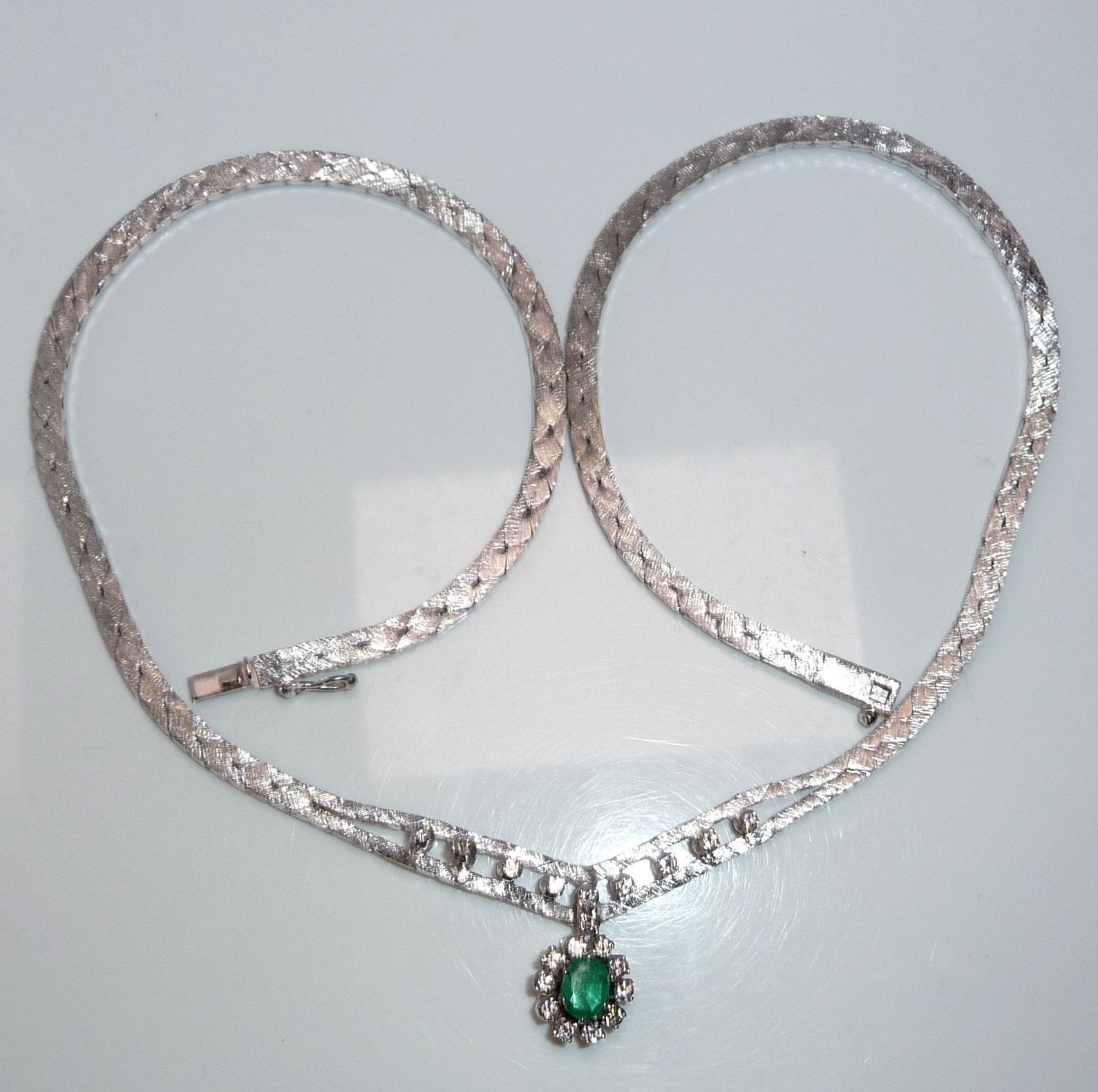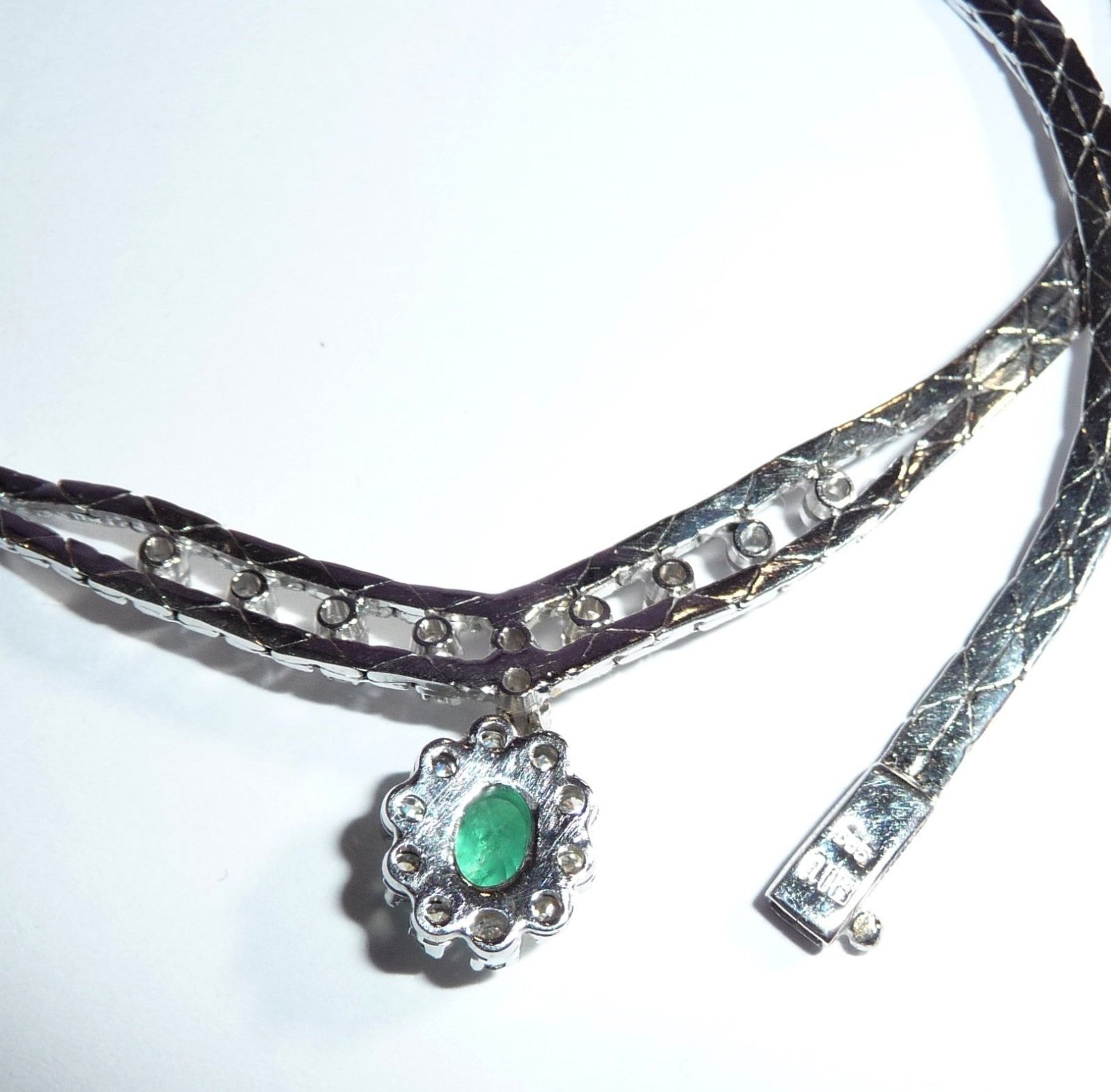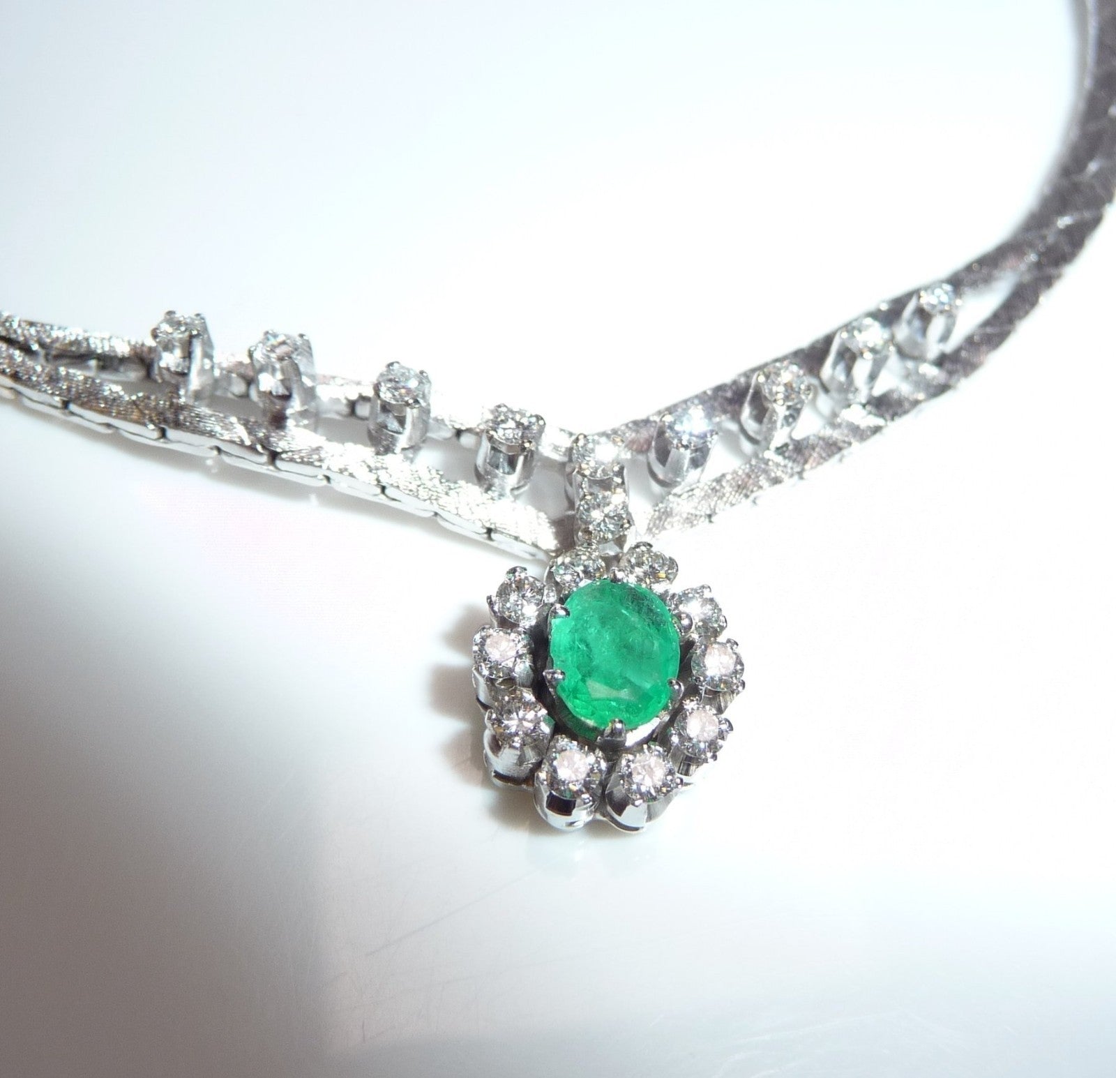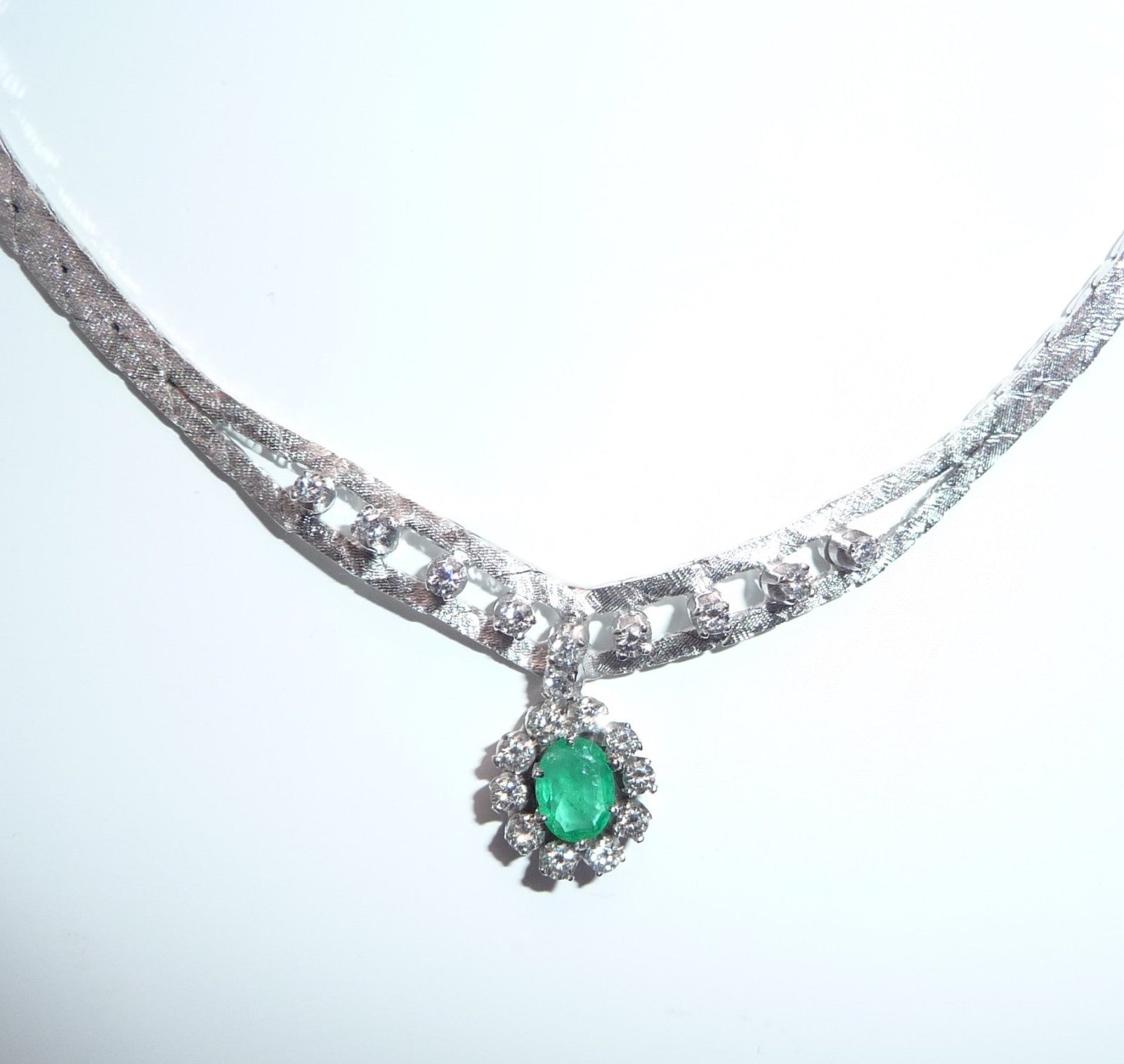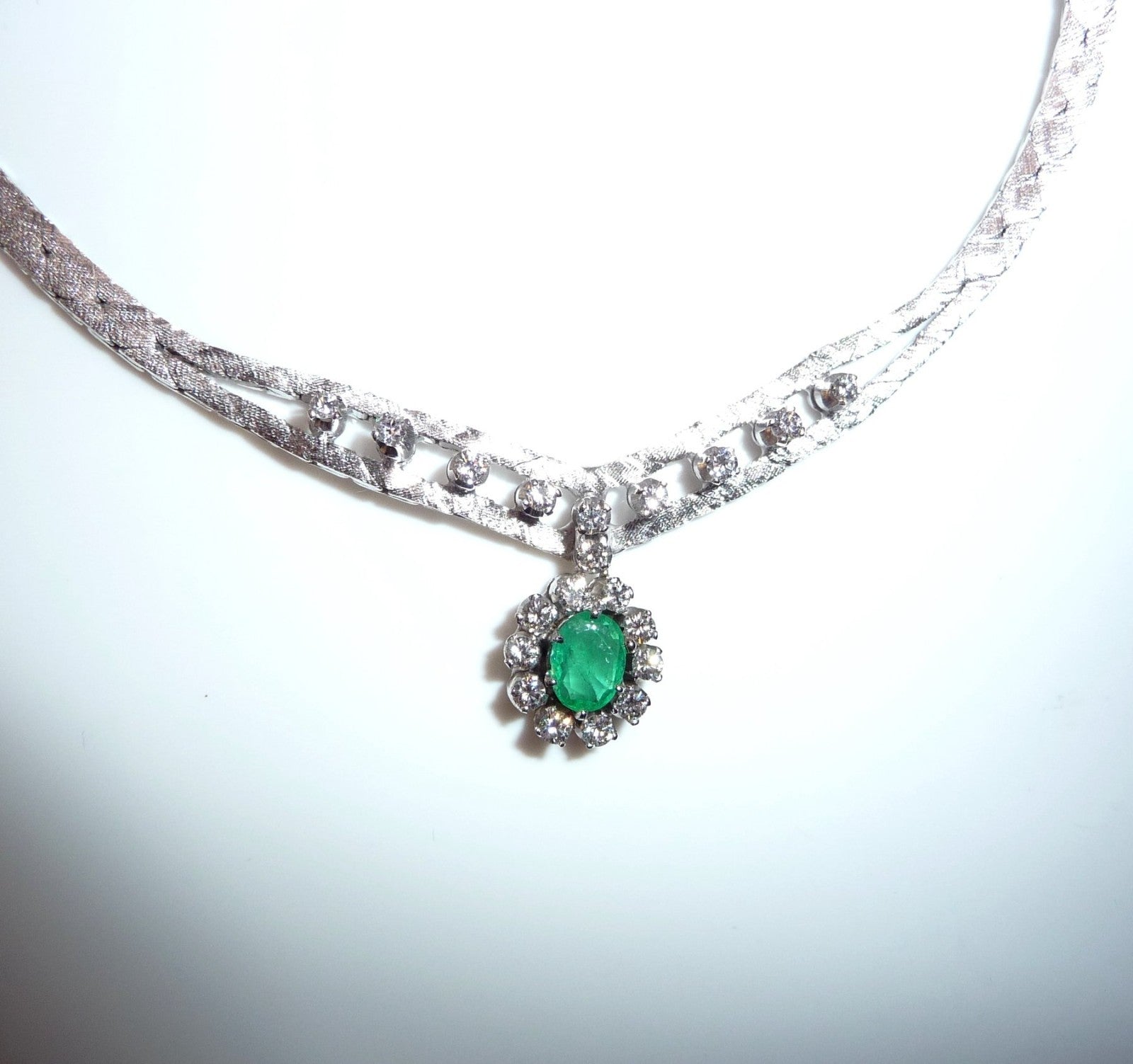 Collier-Kette in 14 K / 585 Weißgold. Das Collier hat eine edel mattierte, flache Schlangenkette, die sich im Zentrum teilt. 10 Diamanten im Brillantschliff von zusammen 0.30 ct. schmücken den Mittelteil. Eine ovale, bewegliche Abhängung wird zum Blickfang des Colliers. Im Zentrum ist ein Smaragd in frischem Grün von 0.40 ct.. Der Smaragd wird umrundet von 10 Diamanten im Brillantschliff von zusammen nochmal 0.40 ct. Diamanten total: 0.70 ct. /G-F/VS).