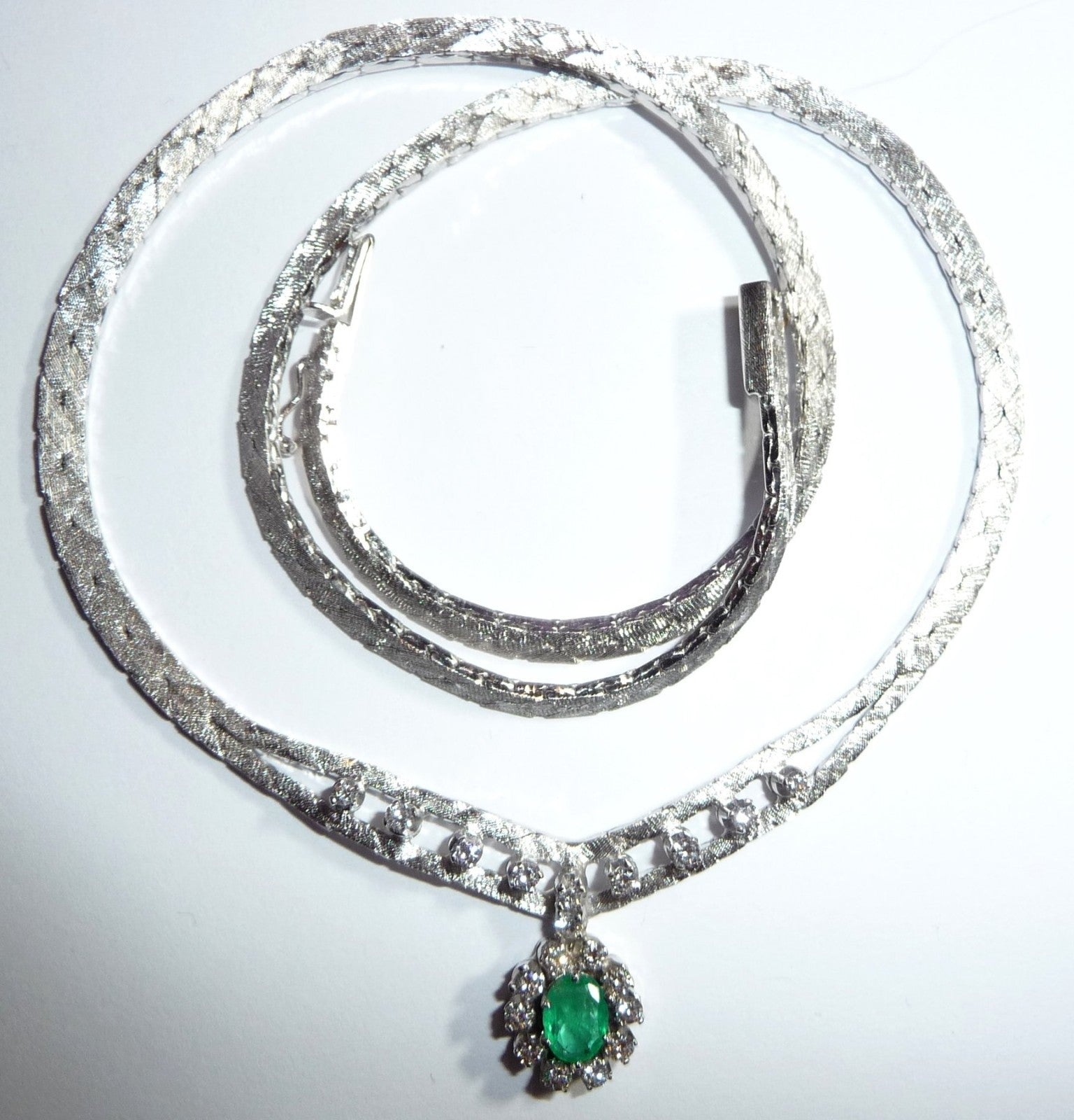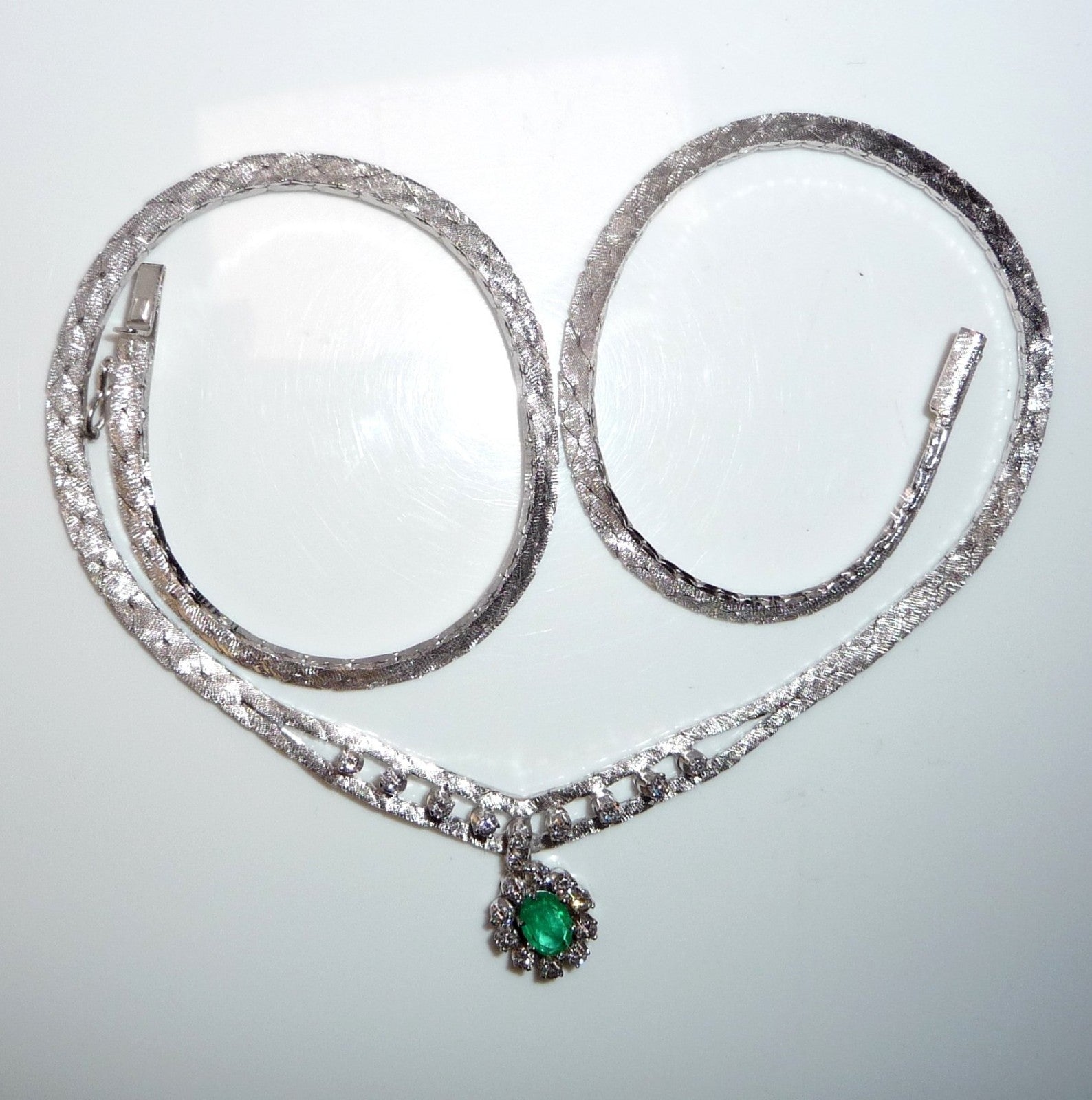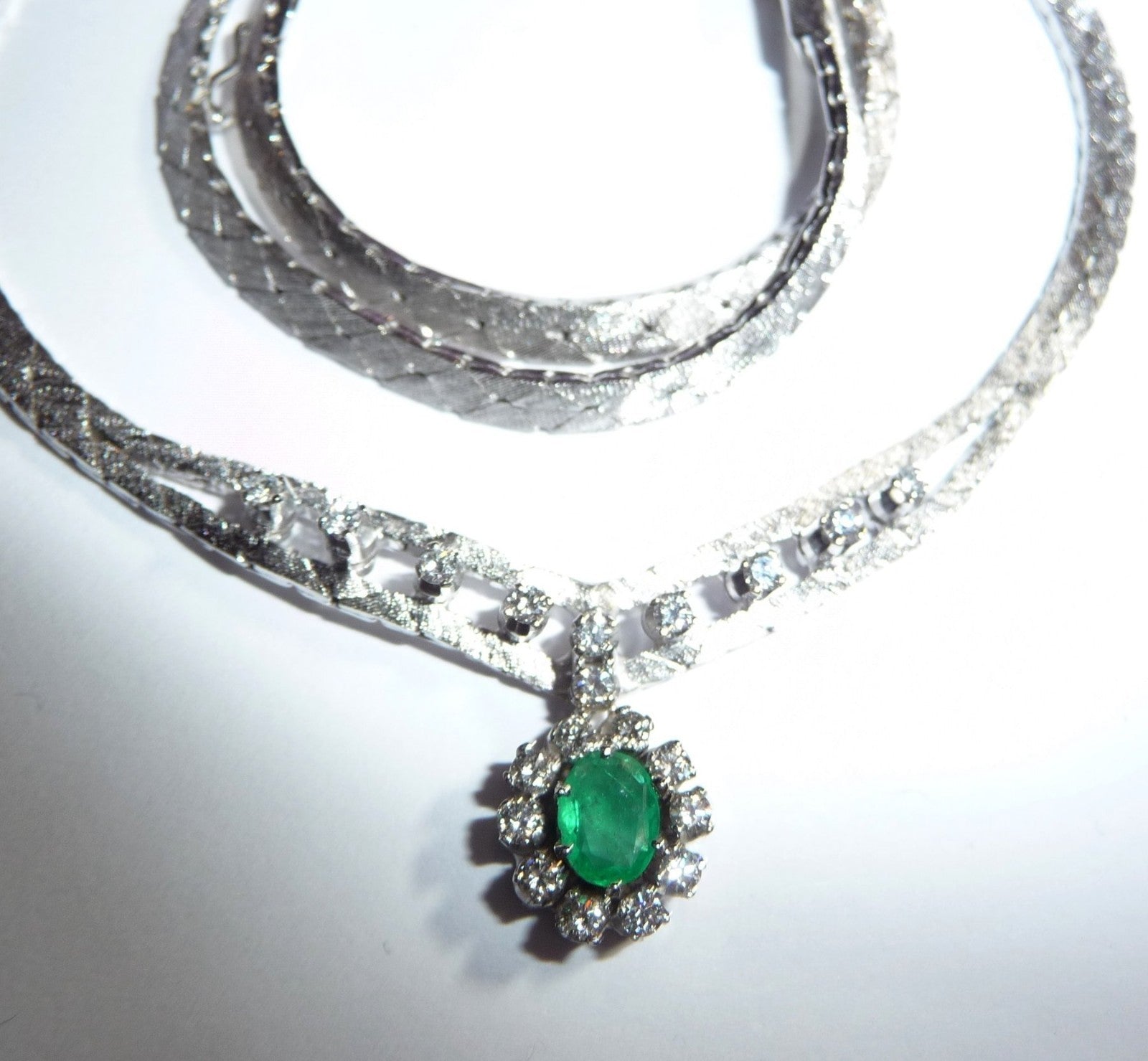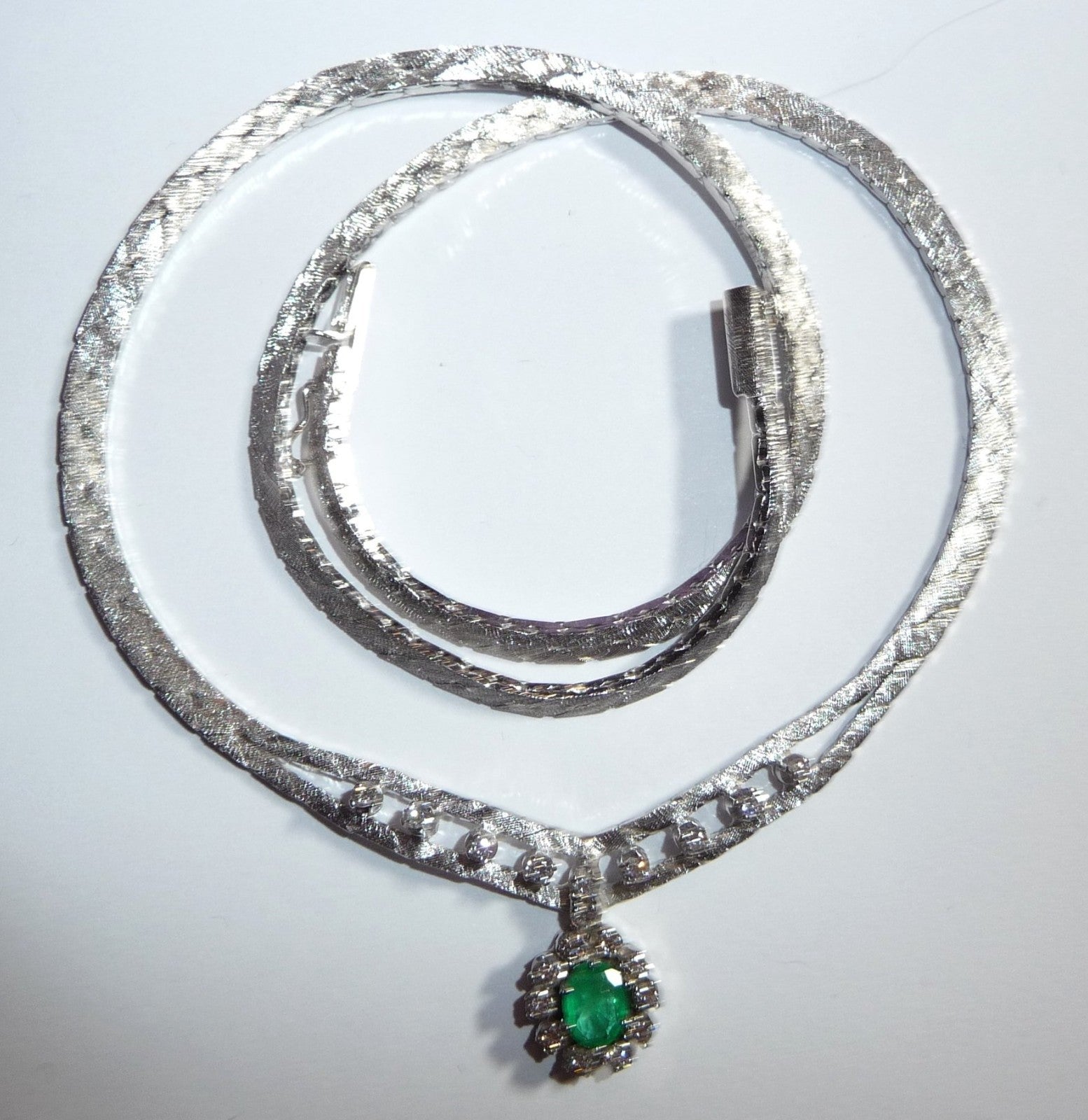 Collier-Kette in 14 K / 585 Weißgold. Das Collier hat eine edel mattierte, flache Schlangenkette, die sich im Zentrum teilt. 10 Diamanten im Brillantschliff von zusammen 0.30 ct. schmücken den Mittelteil. Eine ovale, bewegliche Abhängung wird zum Blickfang des Colliers. Im Zentrum ist ein Smaragd in frischem Grün von 0.40 ct.. Der Smaragd wird umrundet von 10 Diamanten im Brillantschliff von zusammen nochmal 0.40 ct. Diamanten total: 0.70 ct. /G-F/VS).