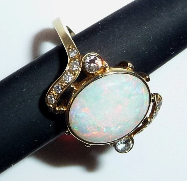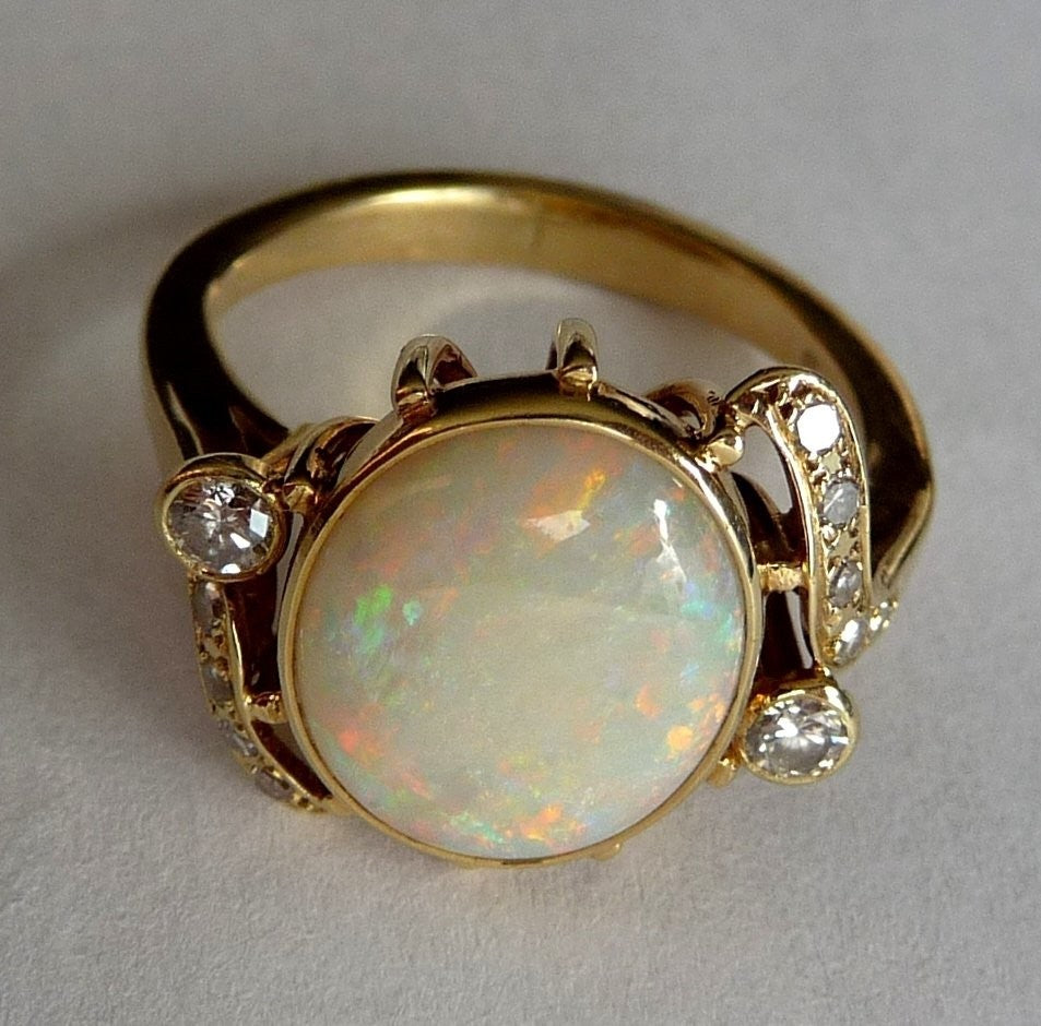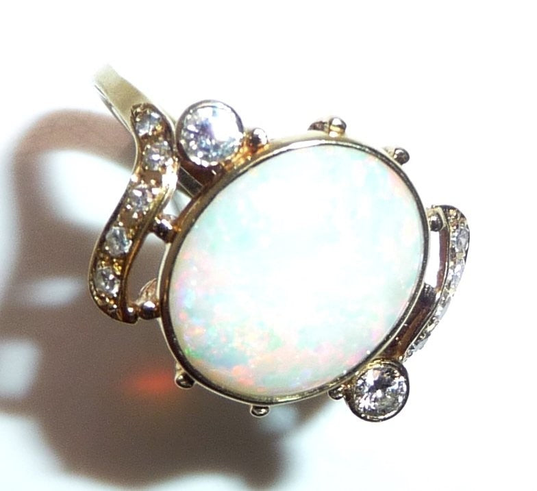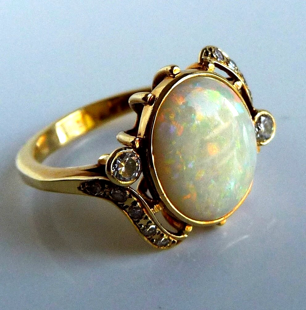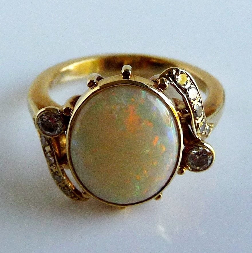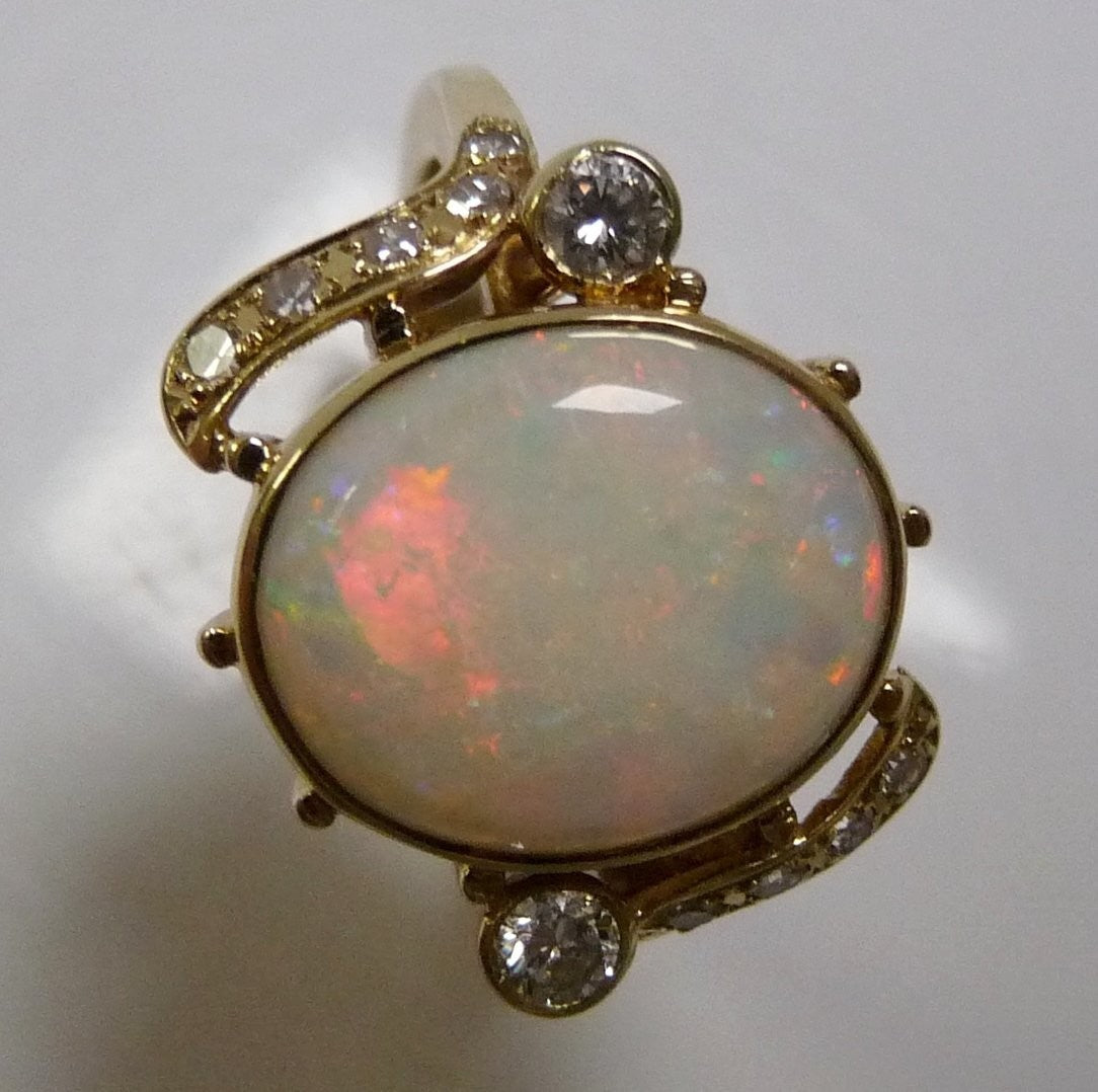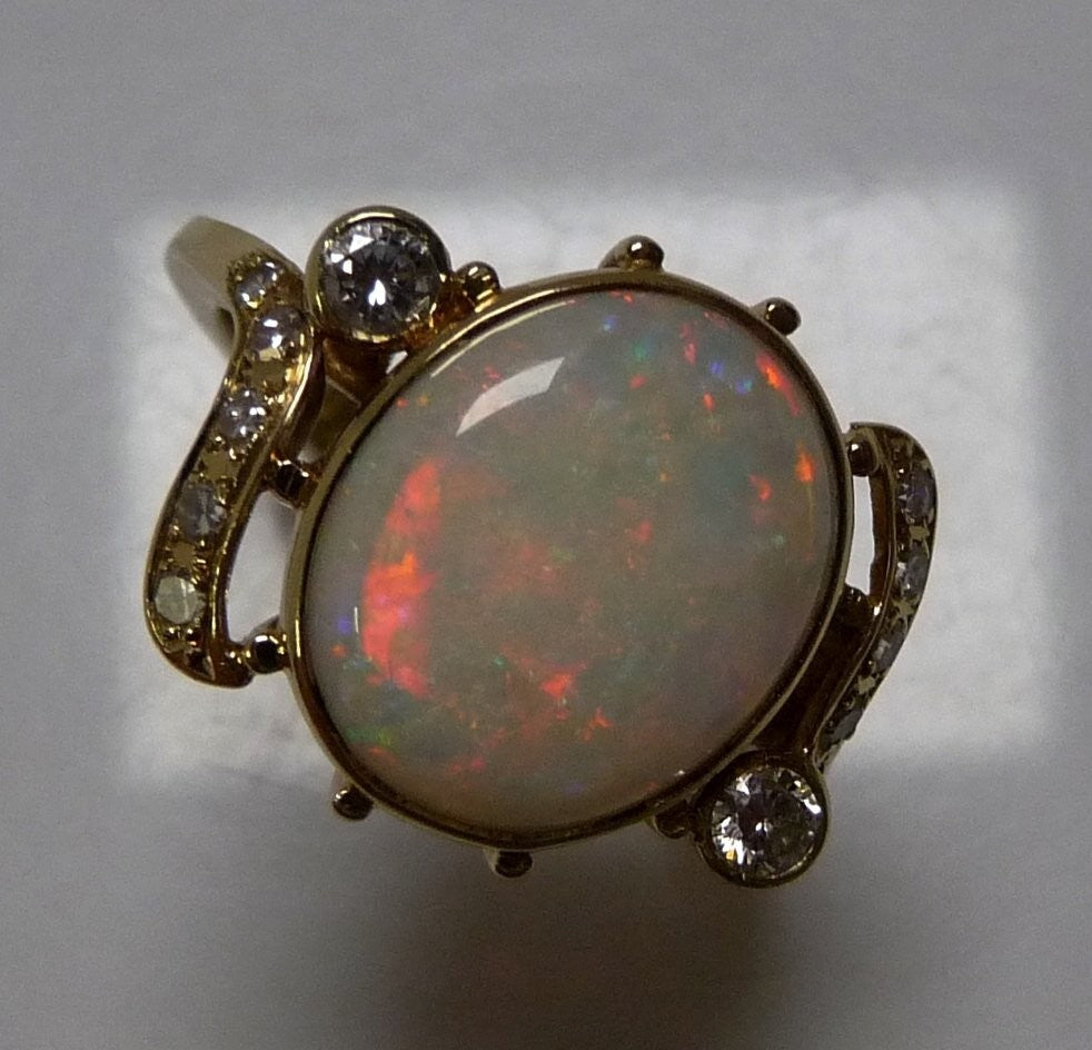 Ring in 14 Kt. / 585 Gelbgold. Der Ring hat einen ovalen Australischen Opal im Cabochon-Schliff von ca. 2.50 ct. eingefasst. Der Milchopal zeigt bei Bewegung sehr viele Farben, die auf den starren Fotos nicht sehr gut eingefangen werden können. Neben grün, blau, gelb und lila machen sich auch viele Flashes in dem seltenen Rot bemerkbar.