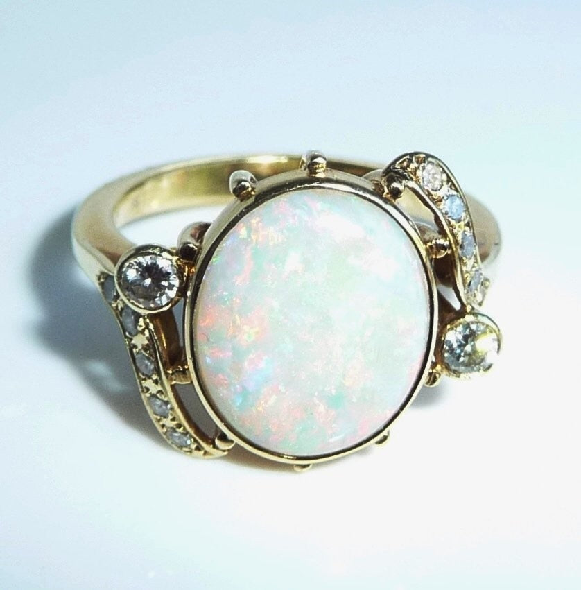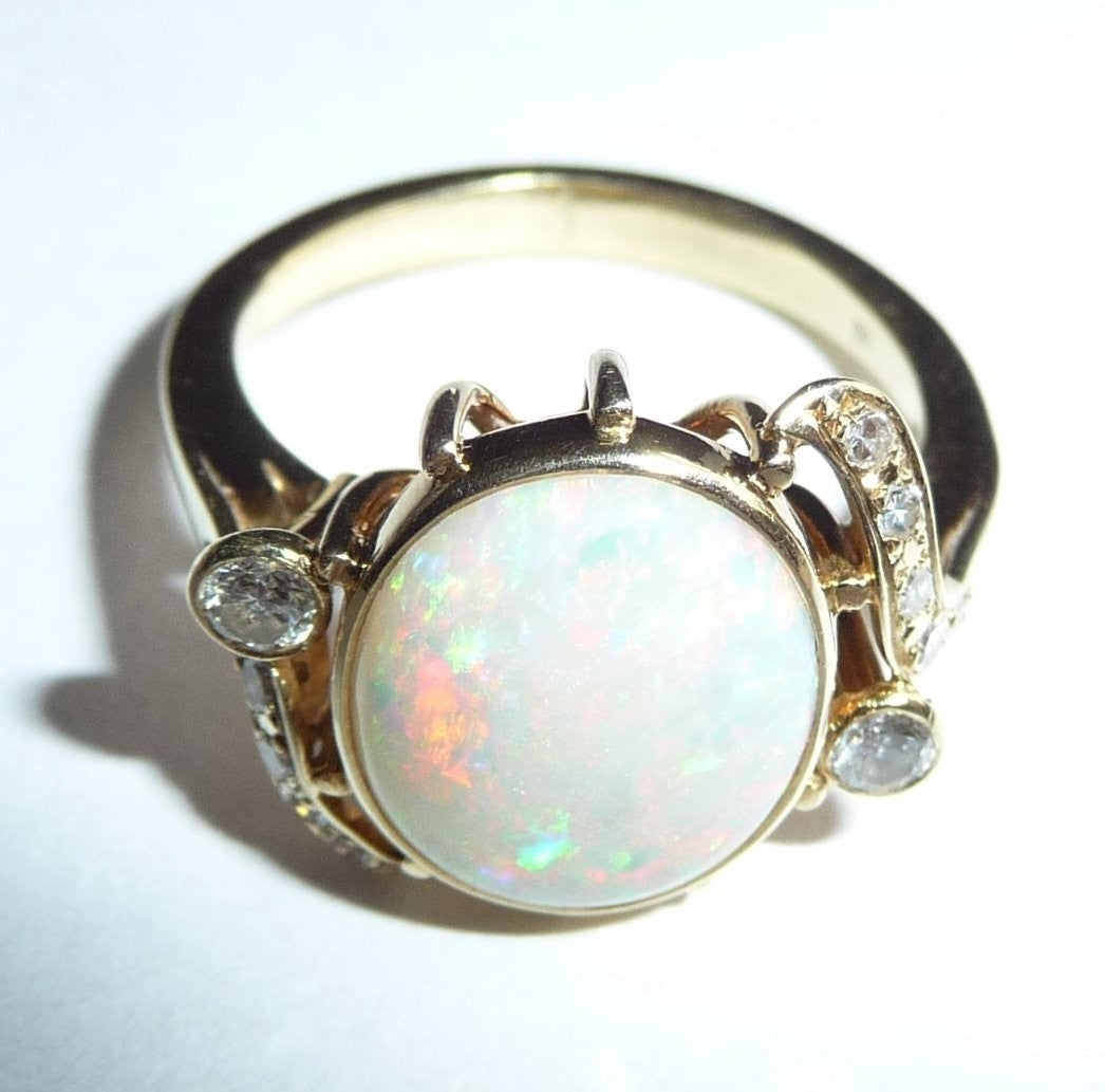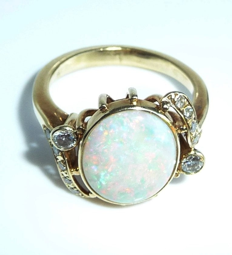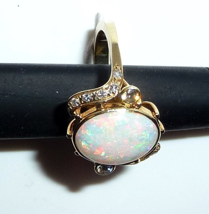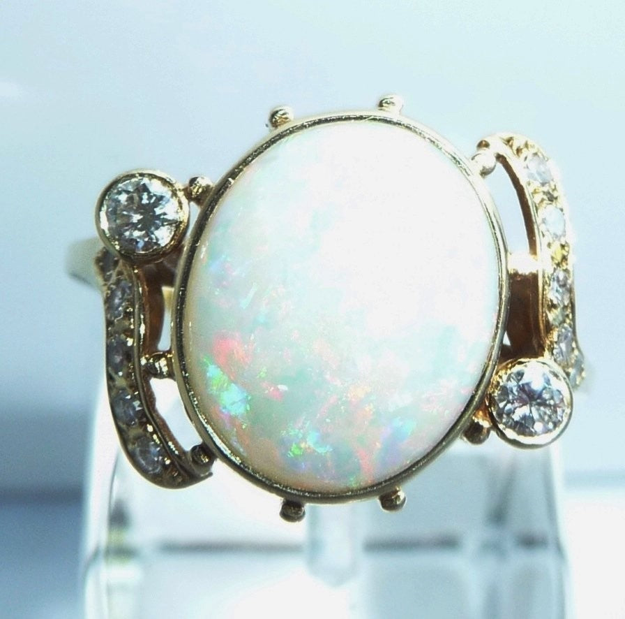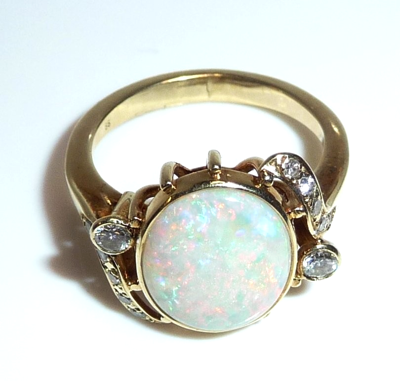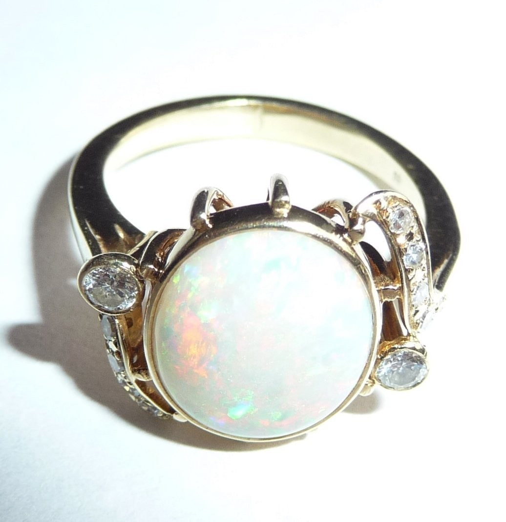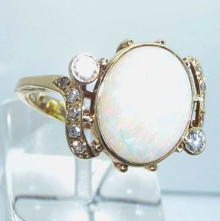Ring in 14 Kt. / 585 Gelbgold. Der Ring hat einen ovalen Australischen Opal im Cabochon-Schliff von ca. 2.50 ct. eingefasst. Der Milchopal zeigt bei Bewegung sehr viele Farben, die auf den starren Fotos nicht sehr gut eingefangen werden können. Neben grün, blau, gelb und lila machen sich auch viele Flashes in dem seltenen Rot bemerkbar.