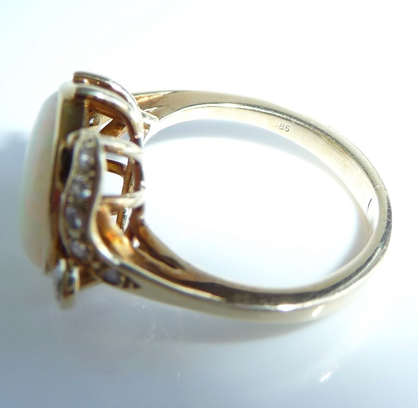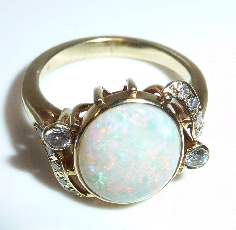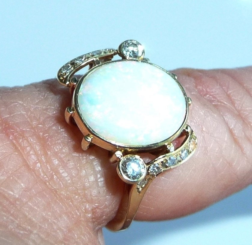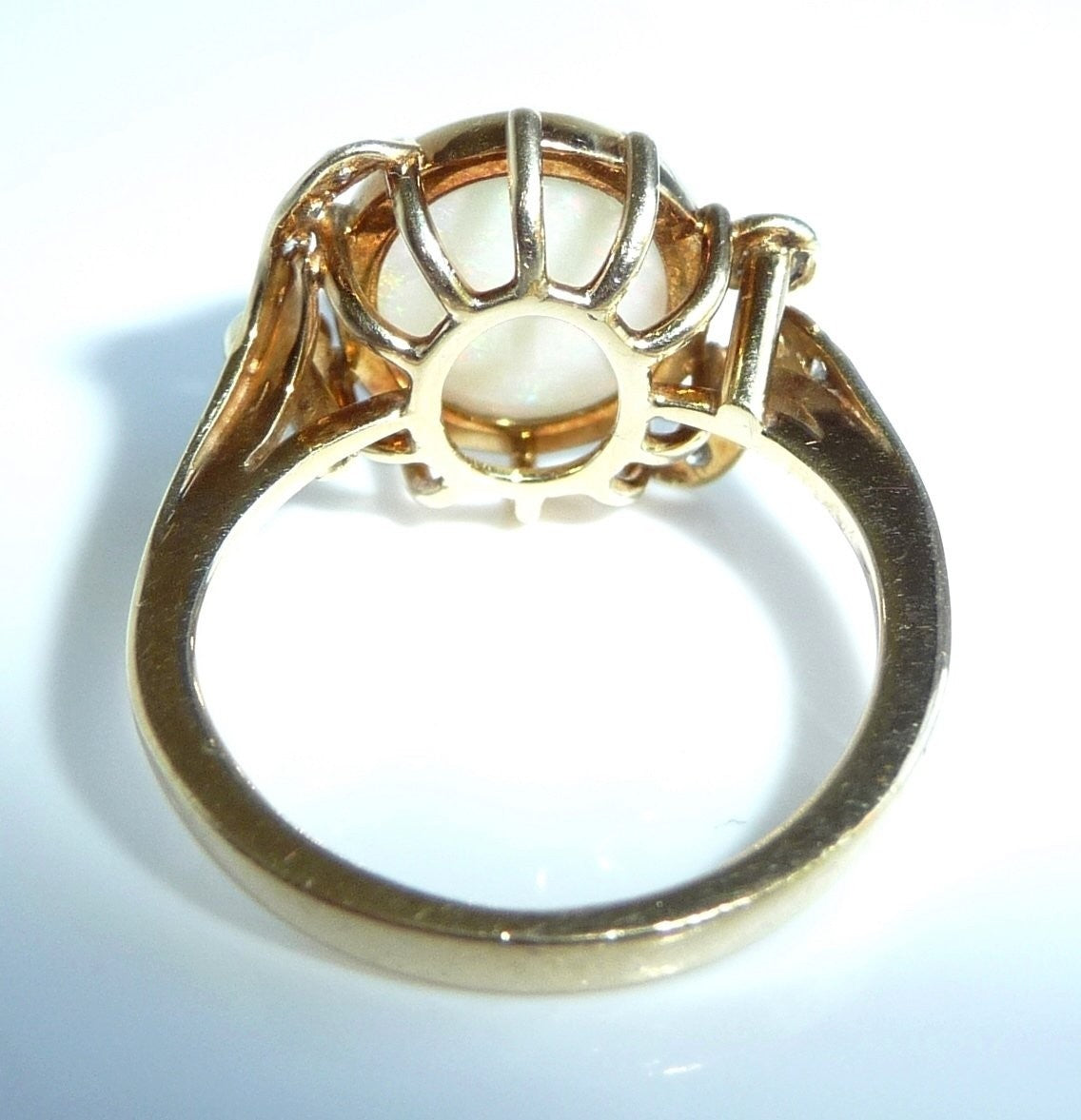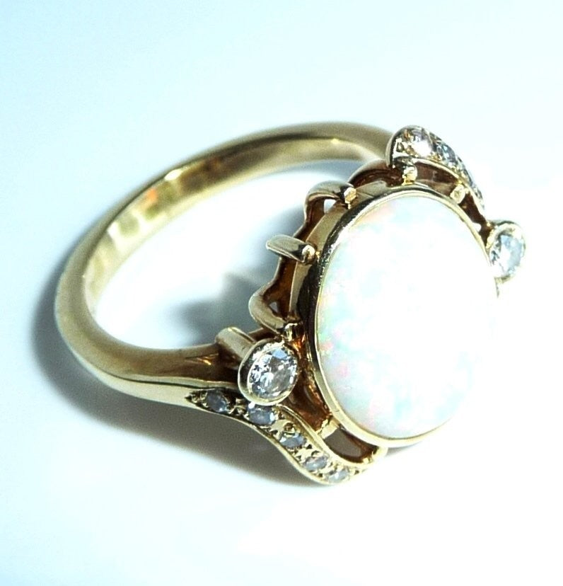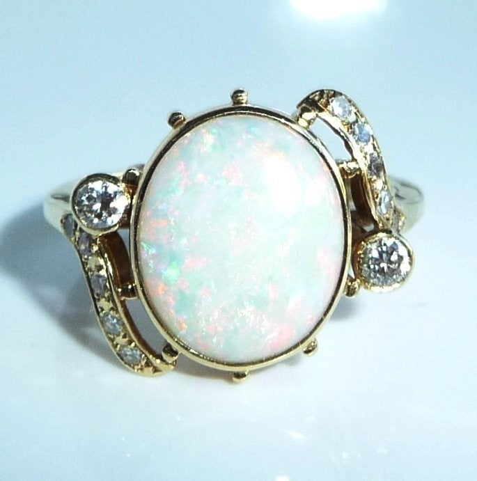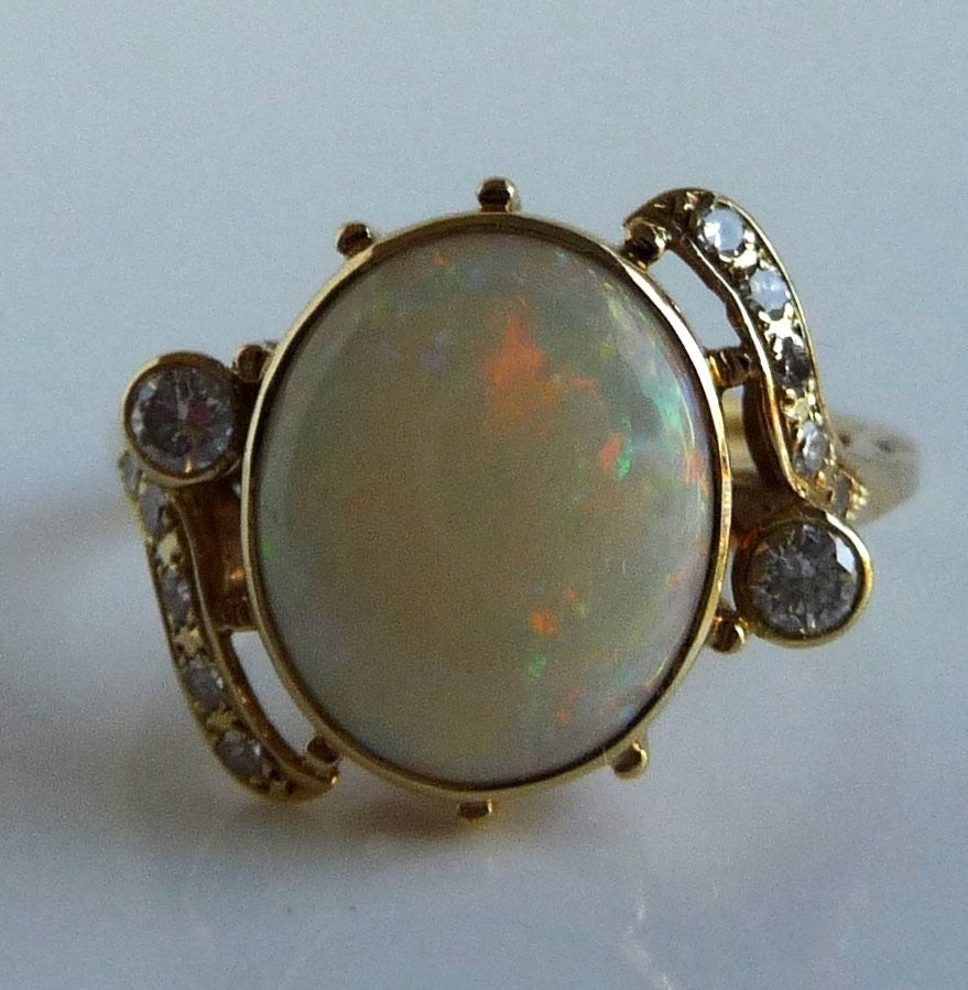 Ring in 14 Kt. / 585 Gelbgold. Der Ring hat einen ovalen Australischen Opal im Cabochon-Schliff von ca. 2.50 ct. eingefasst. Der Milchopal zeigt bei Bewegung sehr viele Farben, die auf den starren Fotos nicht sehr gut eingefangen werden können. Neben grün, blau, gelb und lila machen sich auch viele Flashes in dem seltenen Rot bemerkbar.