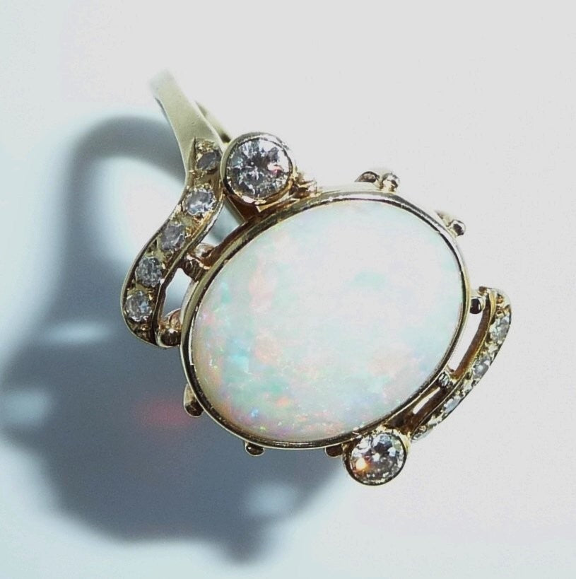 Der Opale wird begleitet von insgesamt 12 Diamanten von total 0.30 ct. (G/SI). Davon sind zwei Diamanten im Brillantschliff (2 x 0.05 ct.) und 10 Diamanten im Achtkantschliff (10 x 0.02 ct.)