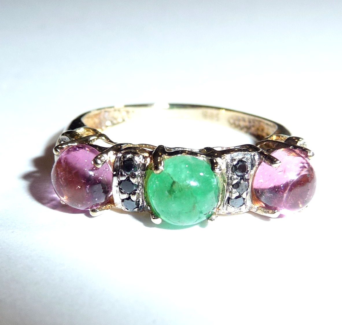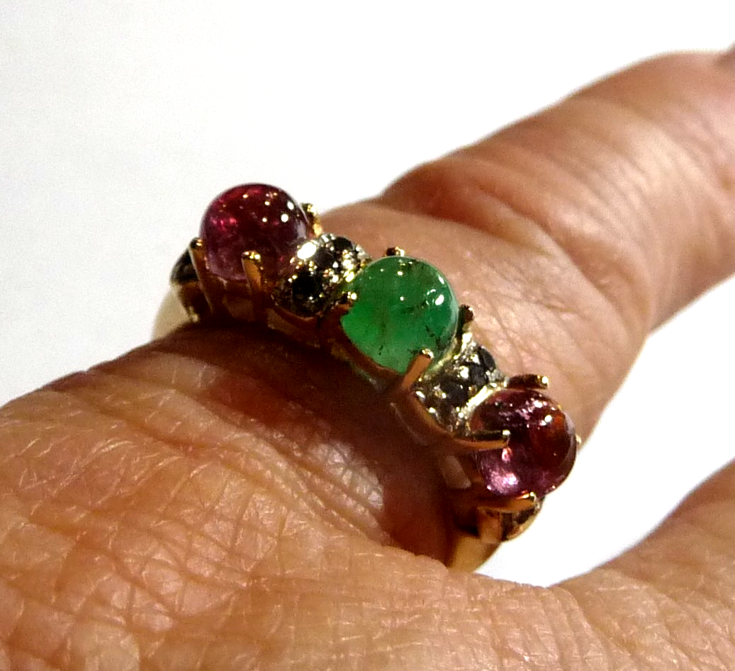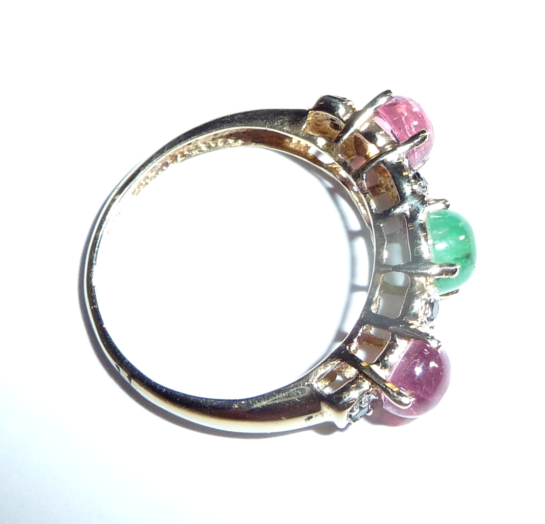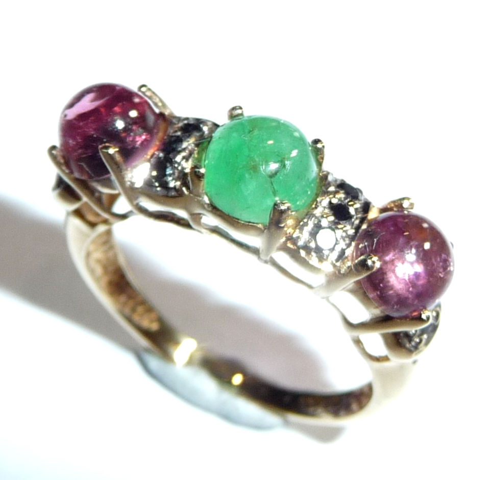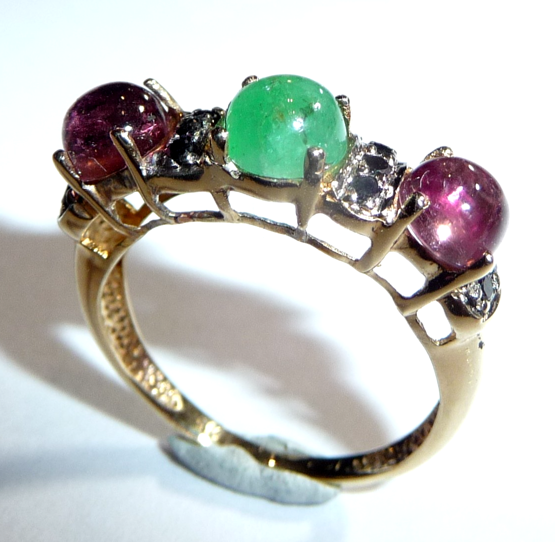Ring in 585 / 14 K Gelbgold. Der Reihenring ist quer zum Finger arrangiert. Es sind 3 Edelsteine im Cabochon-Schliff eingefasst: 2 rosa Turmaline (Rubellite) und 1 Smaragd von total 1,50 ct.. Zwischen den Edelsteinen sind insgesamt 10 schwarze Diamanten im Achtkantschliff von total 0,20 ct. eingefasst.