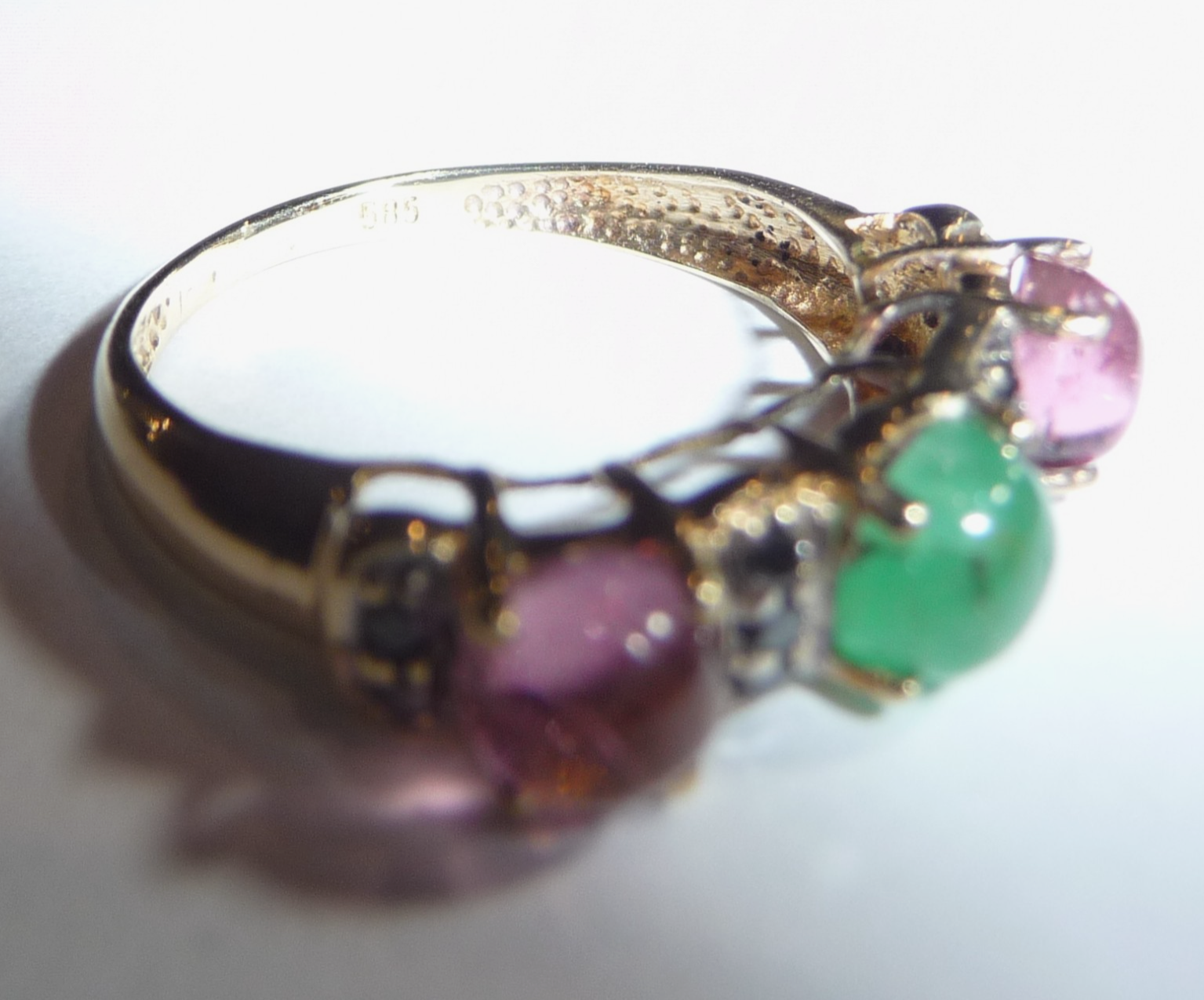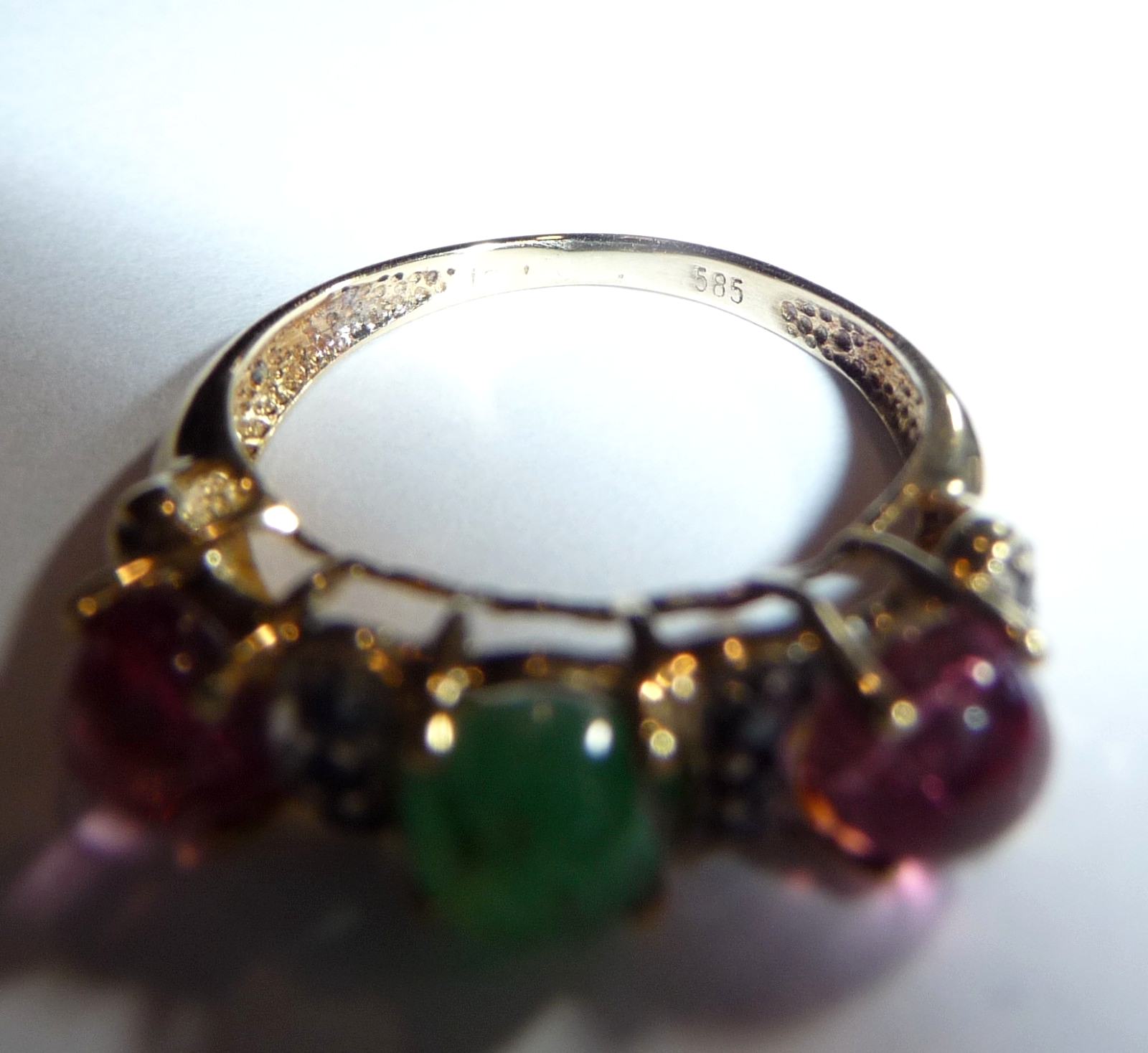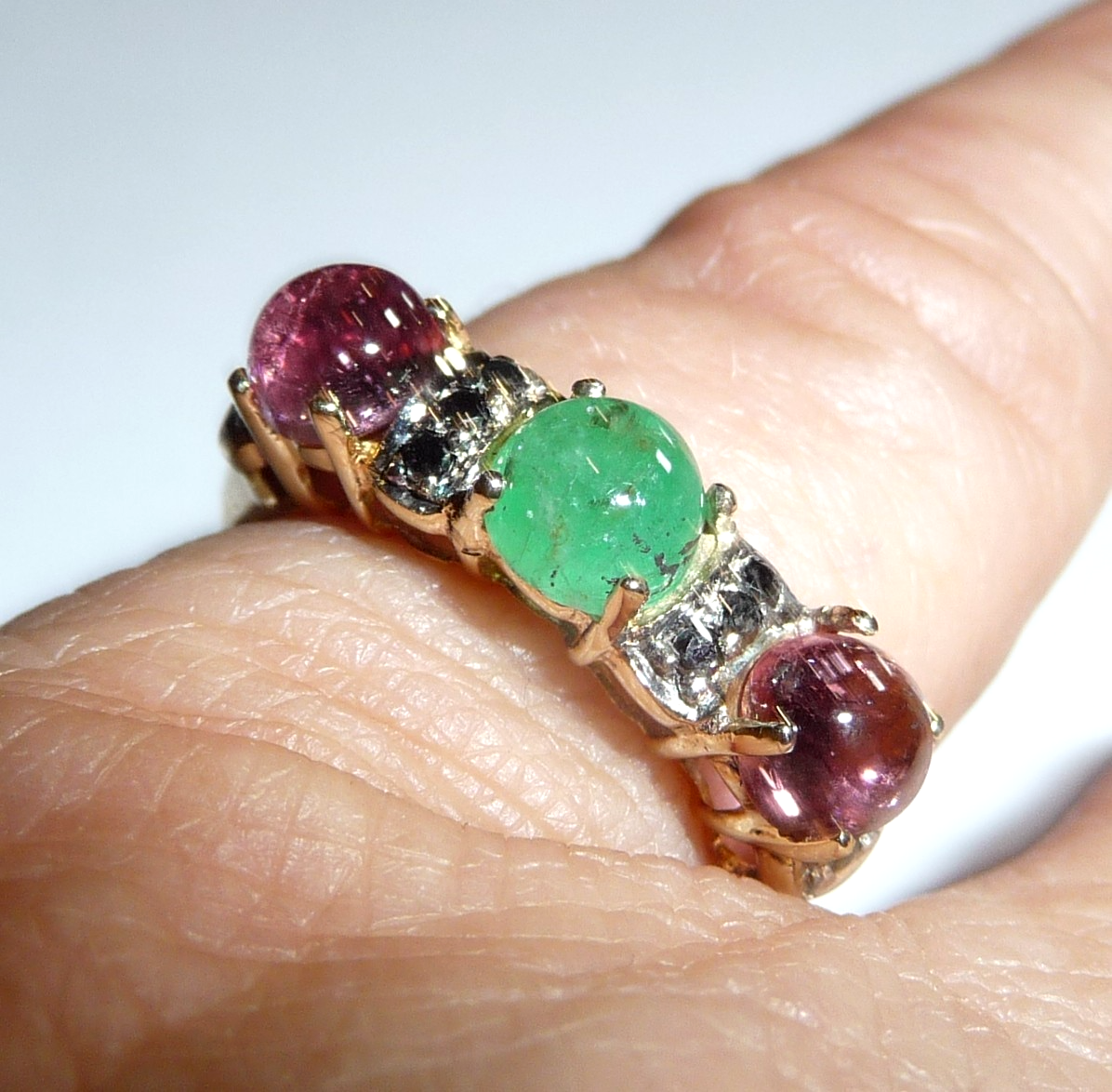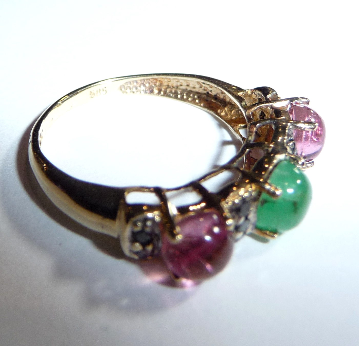 Ring in 585 / 14 K Gelbgold. Der Reihenring ist quer zum Finger arrangiert. Es sind 3 Edelsteine im Cabochon-Schliff eingefasst: 2 rosa Turmaline (Rubellite) und 1 Smaragd von total 1,50 ct.. Zwischen den Edelsteinen sind insgesamt 10 schwarze Diamanten im Achtkantschliff von total 0,20 ct. eingefasst.