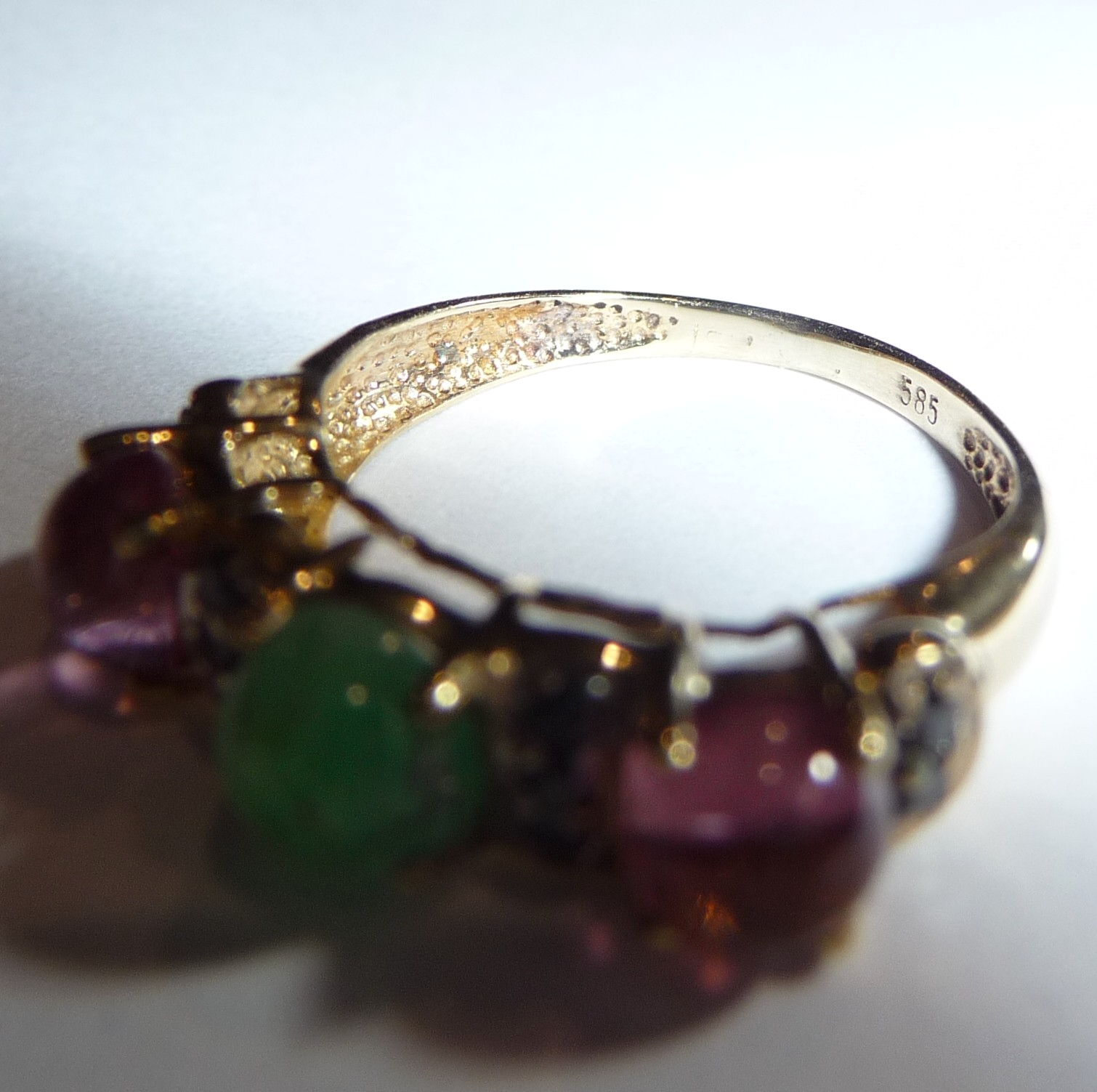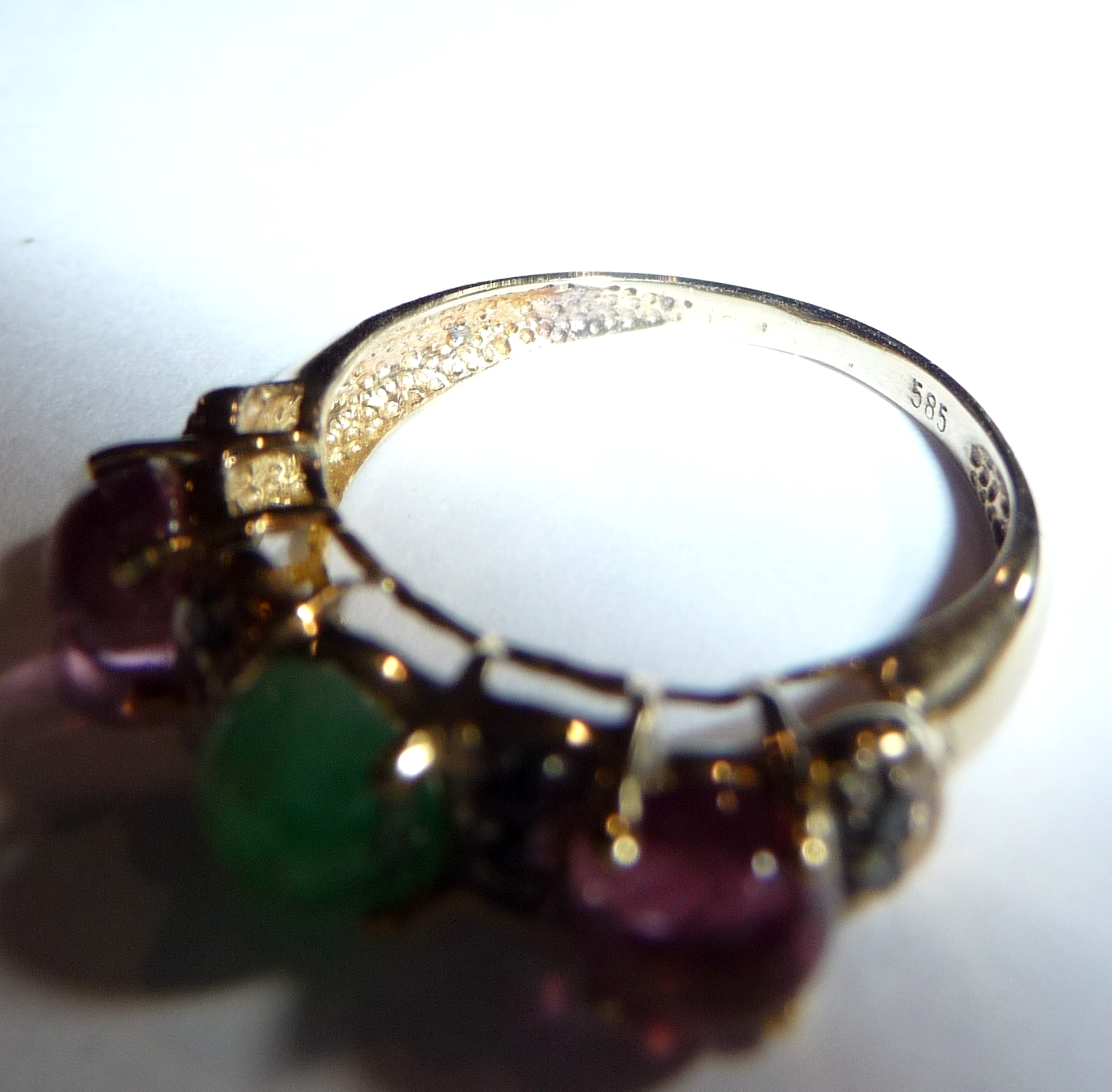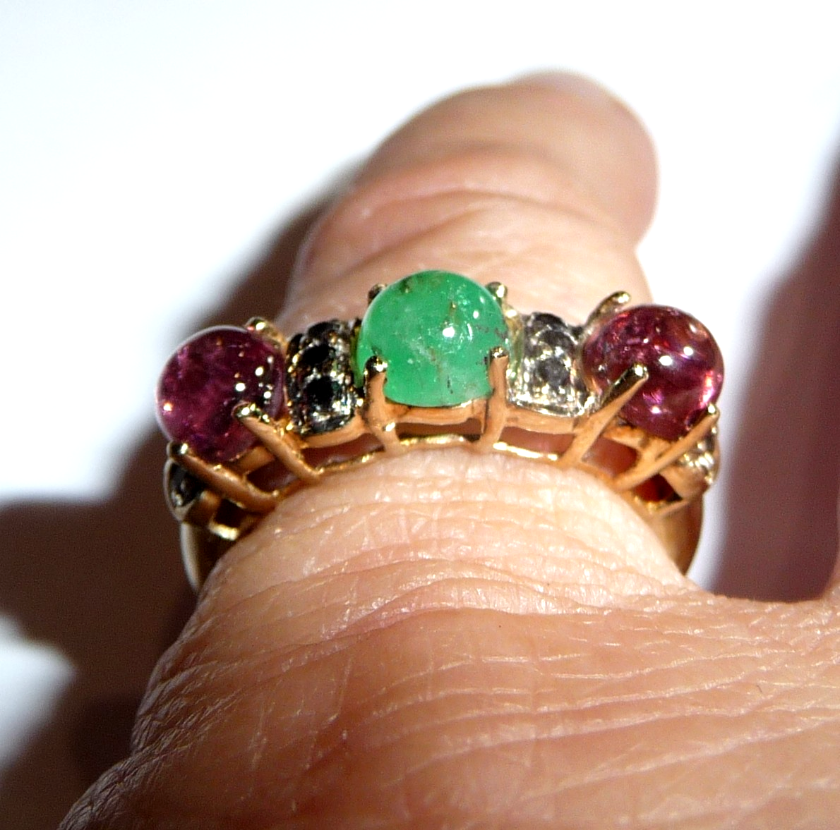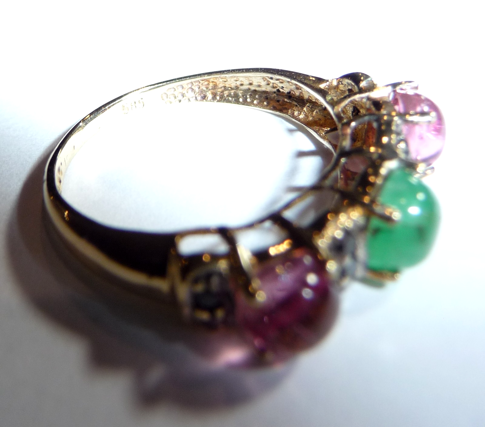 Ring in 585 / 14 K Gelbgold. Der Reihenring ist quer zum Finger arrangiert. Es sind 3 Edelsteine im Cabochon-Schliff eingefasst: 2 rosa Turmaline (Rubellite) und 1 Smaragd von total 1,50 ct.. Zwischen den Edelsteinen sind insgesamt 10 schwarze Diamanten im Achtkantschliff von total 0,20 ct. eingefasst.