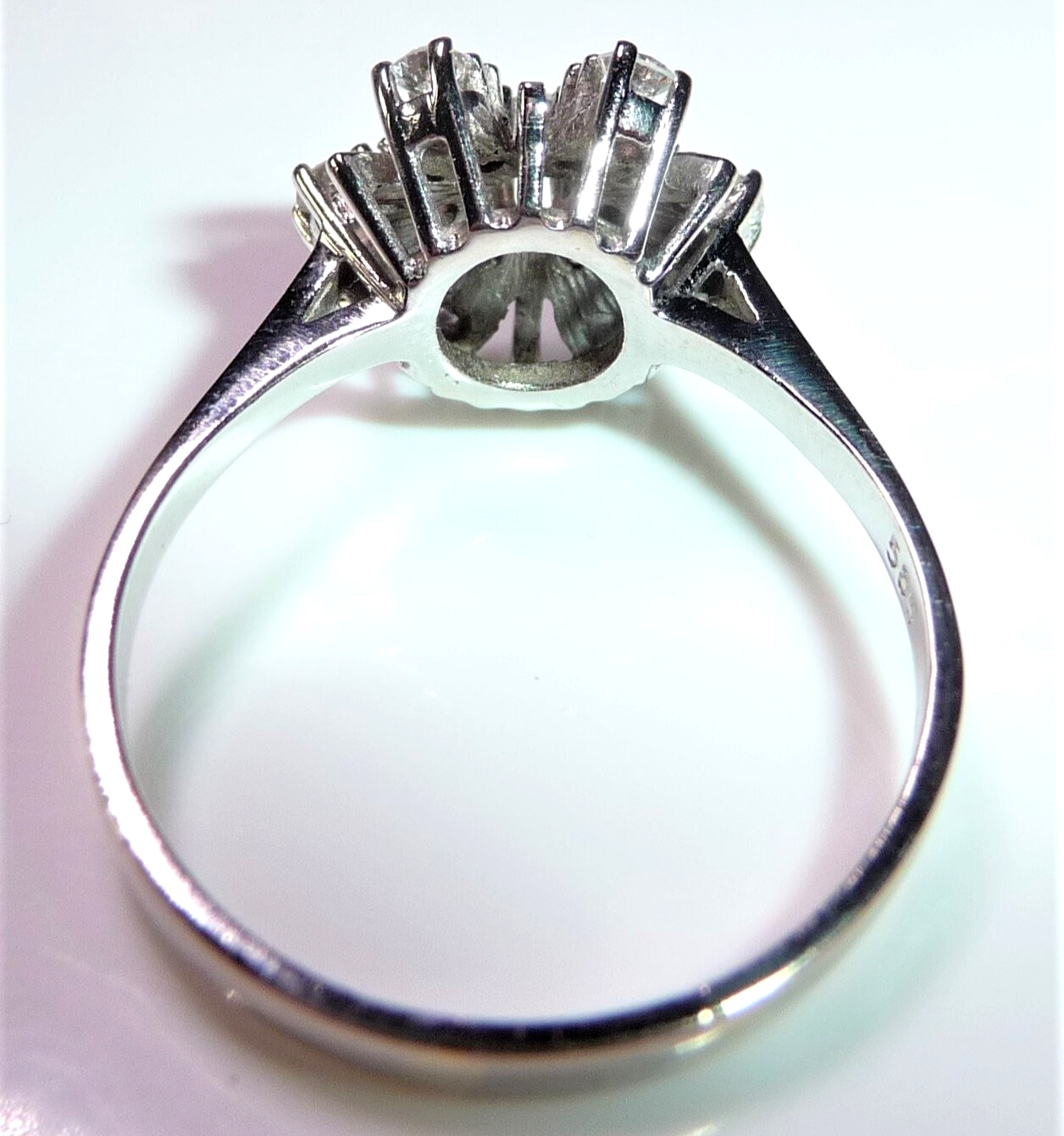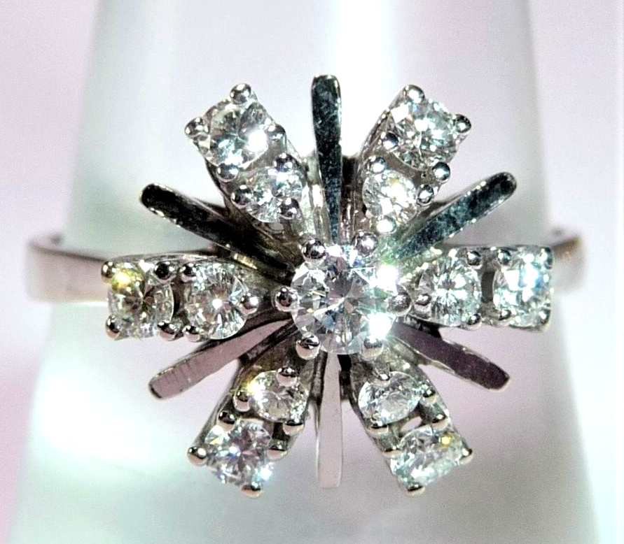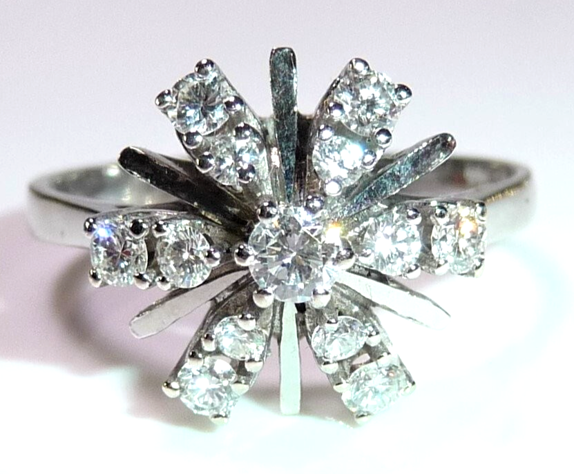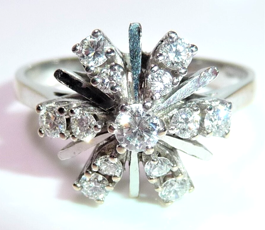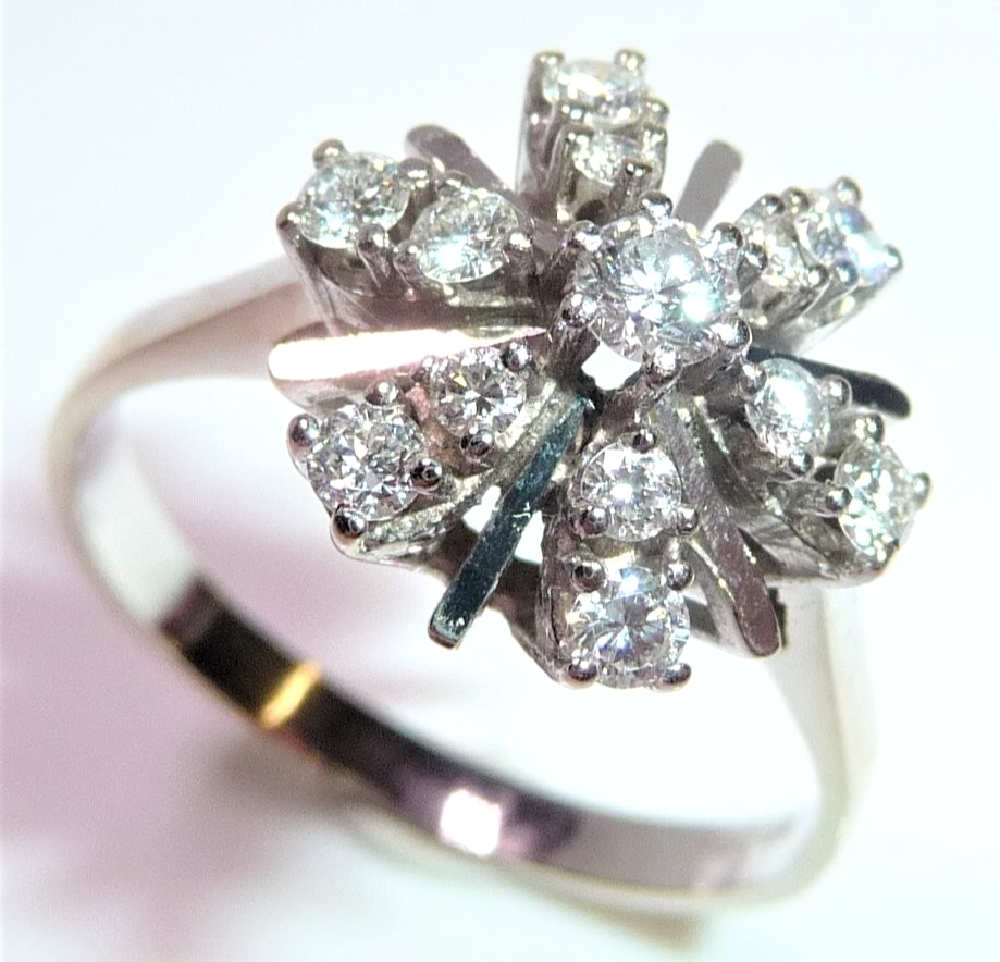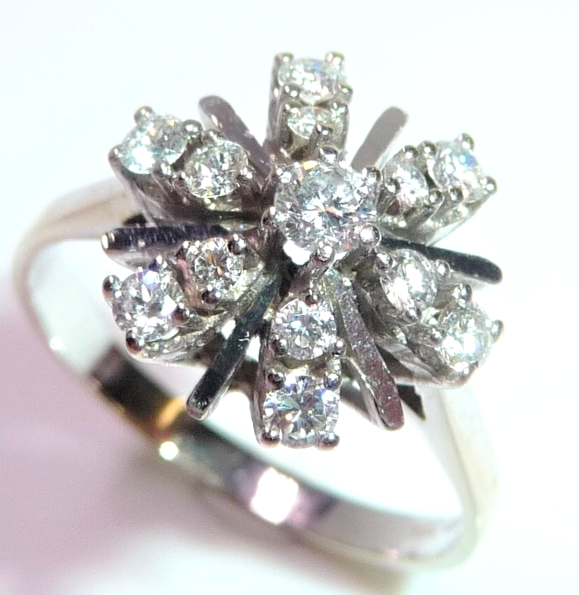 Ring in 585 / 14 K Weißgold. Elegantes Modell, dessen Ringkopf wie eine Blüte oder ein Schneekristall aufgebaut ist. Von innen nach außen leicht abgeschrägt verlaufend, sind insgesamt 13 Diamanten im Brillantschliff von total 0.54 ct. (G/VS-SI) eingefasst. Die glatten Weißgold-Stege sorgen für zusätzliche Lichtreflexionen.