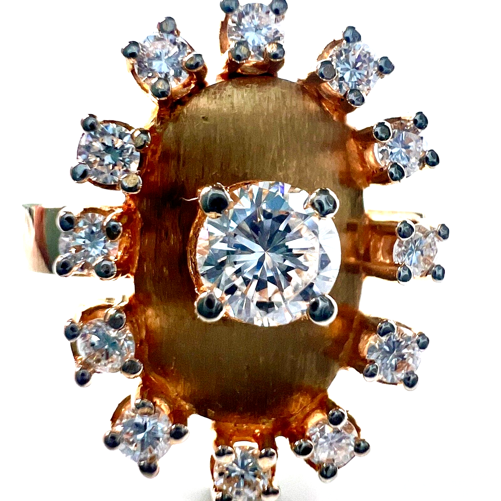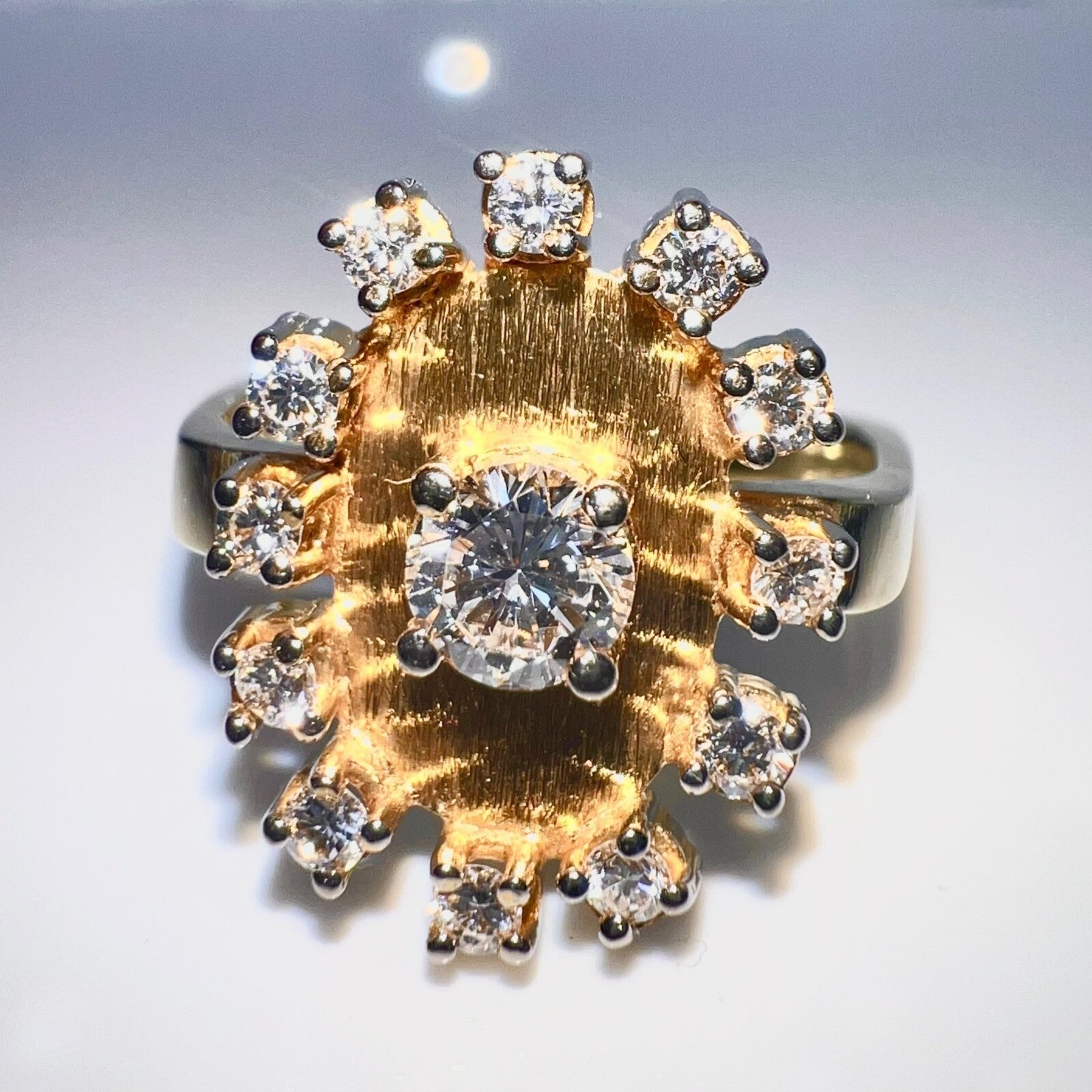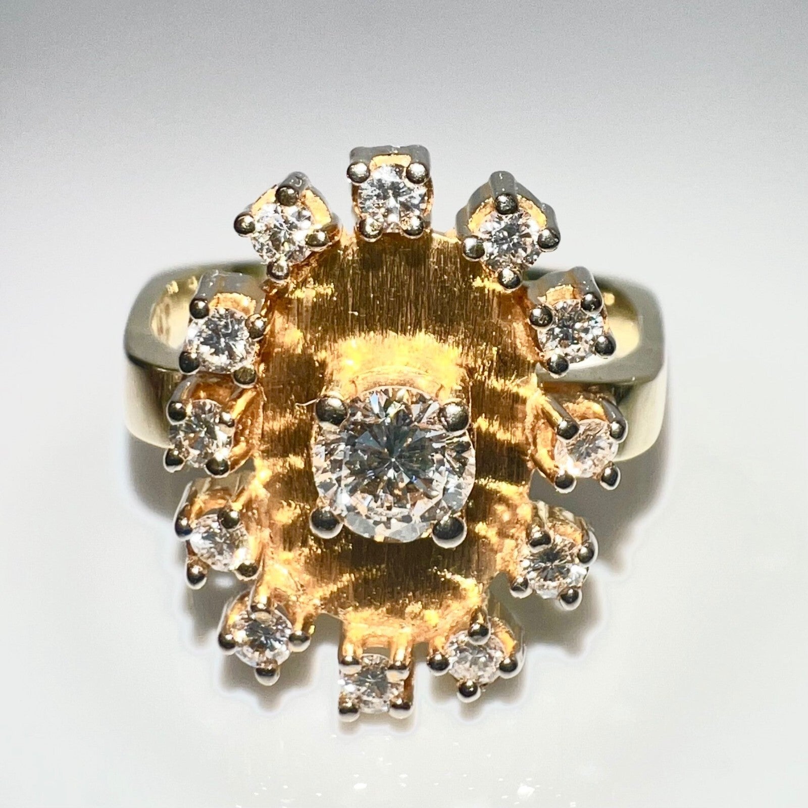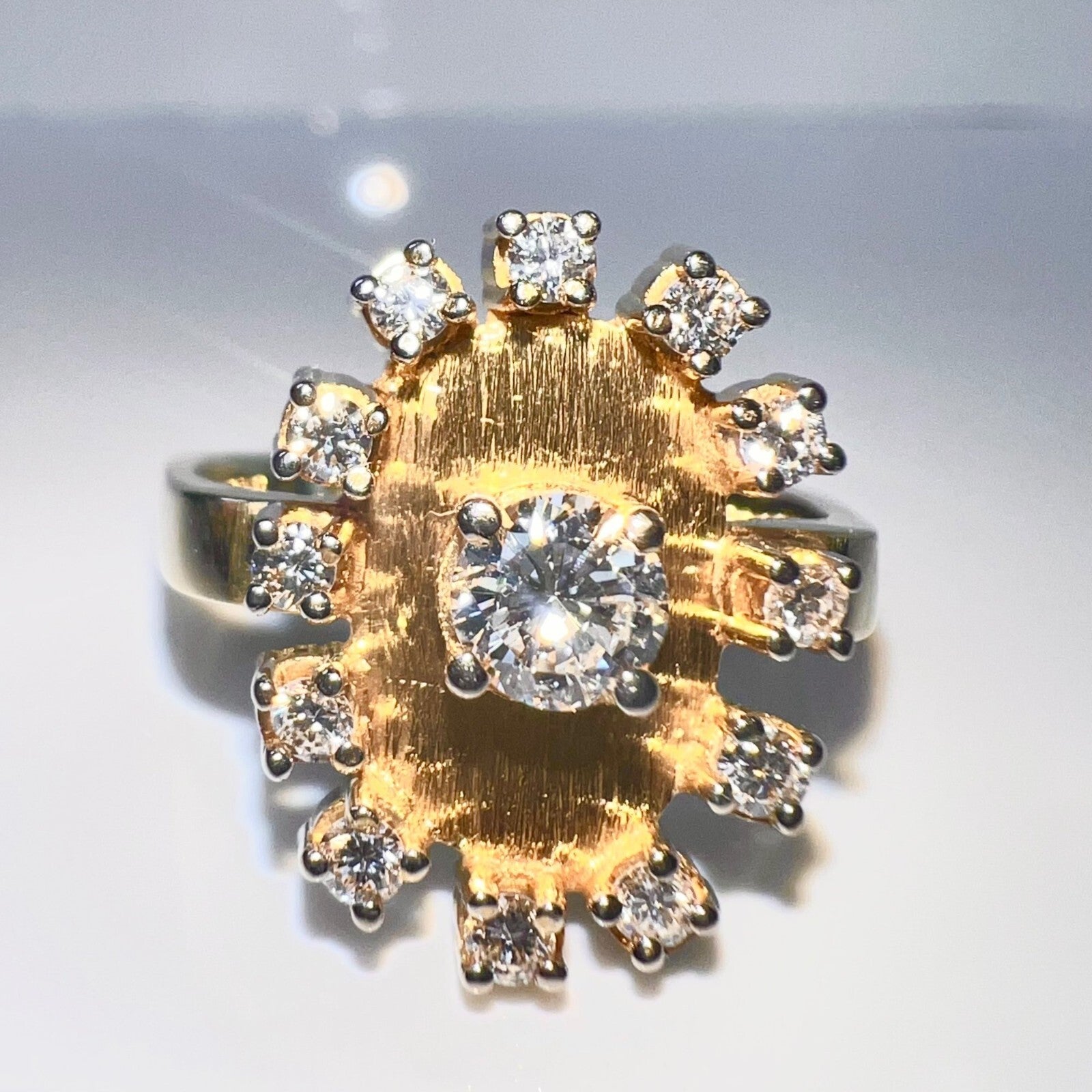 Kreativer Ring in 585 / 14 K Gelbgold. Der Ring ist eine Goldschmiede-Arbeit von Hand mit Signe. Der Ringkopf ist oval und hat im Zentrum einen Diamanten im Brillantschliff von ca. 0.32 ct. mit den Maßen 4,3 mm Durchmesser und 2,7 mm Tiefe eingefasst. Der Mittel-Diamant ist von außerordentlich guter Qualität mit Farbe F und Reinheit VVS. Der Rand des ovalen Ringkopfes ist noch besetzt mit 12 Diamanten im Brillantschliff von total 0.36 ct. (F/VS). Die Ringschiene ist leicht eckig gestaltet (Steigbügel-Design), was verhindert, dass sich der Ring am Finger dreht.