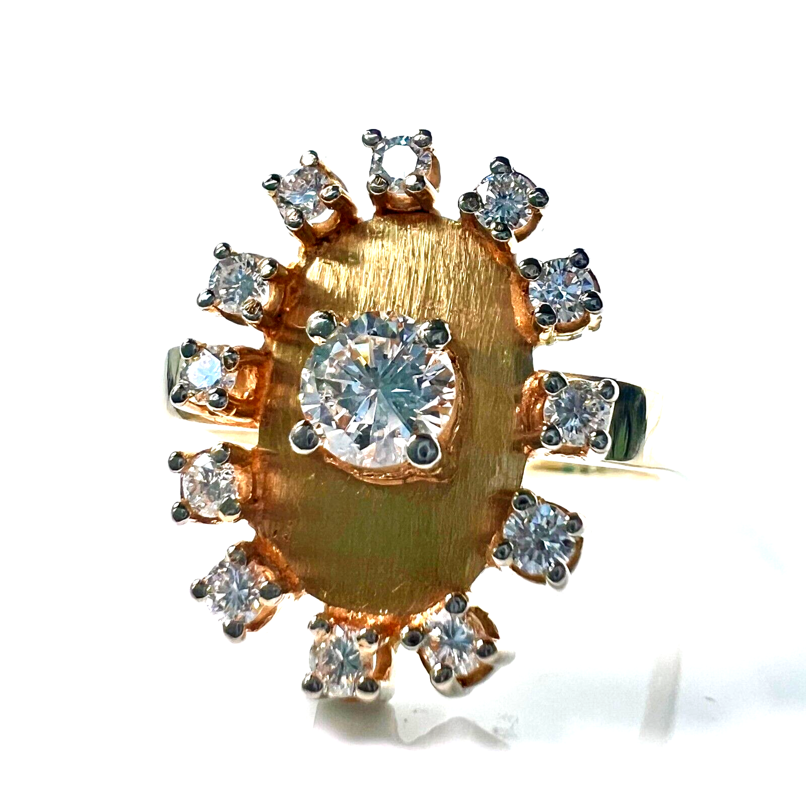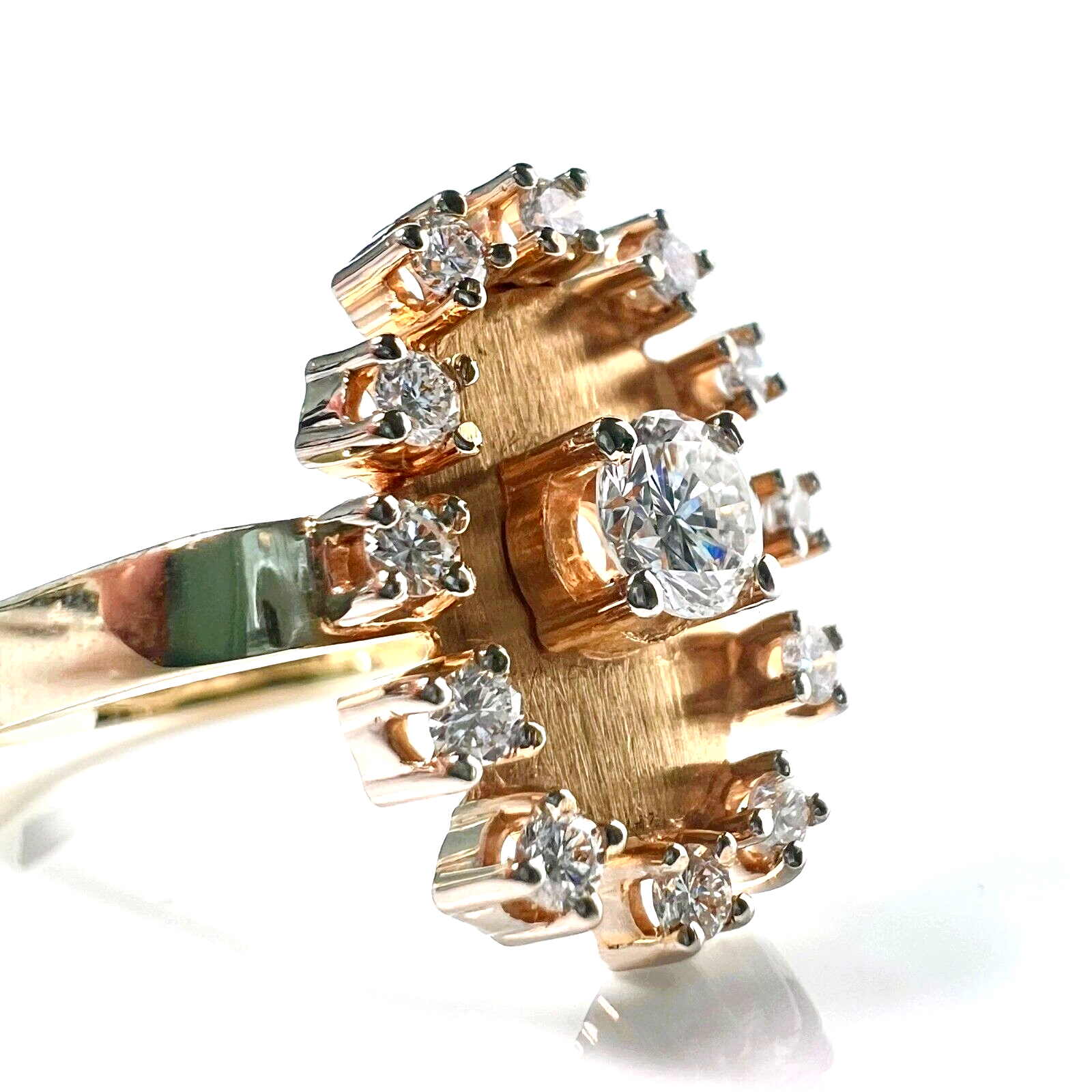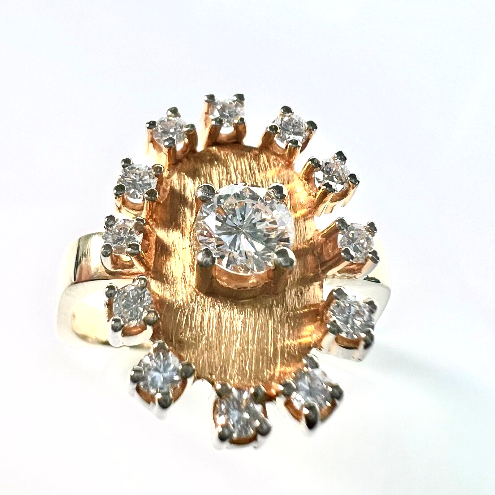 Kreativer Ring in 585 / 14 K Gelbgold. Der Ring ist eine Goldschmiede-Arbeit von Hand mit Signe. Der Ringkopf ist oval und hat im Zentrum einen Diamanten im Brillantschliff von ca. 0.32 ct. mit den Maßen 4,3 mm Durchmesser und 2,7 mm Tiefe eingefasst. Der Mittel-Diamant ist von außerordentlich guter Qualität mit Farbe F und Reinheit VVS. Der Rand des ovalen Ringkopfes ist noch besetzt mit 12 Diamanten im Brillantschliff von total 0.36 ct. (F/VS). Die Ringschiene ist leicht eckig gestaltet (Steigbügel-Design), was verhindert, dass sich der Ring am Finger dreht.