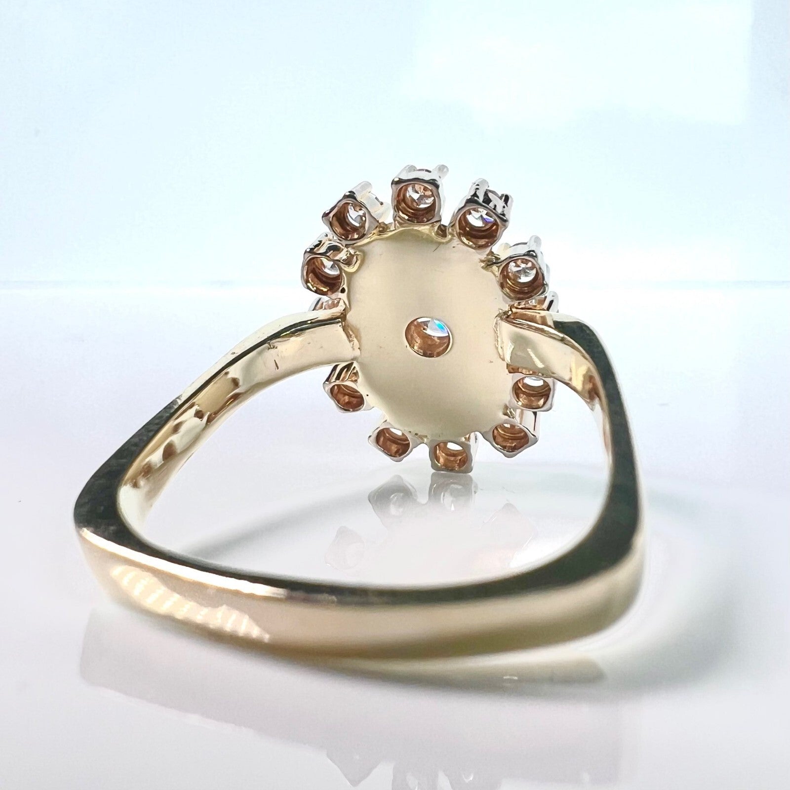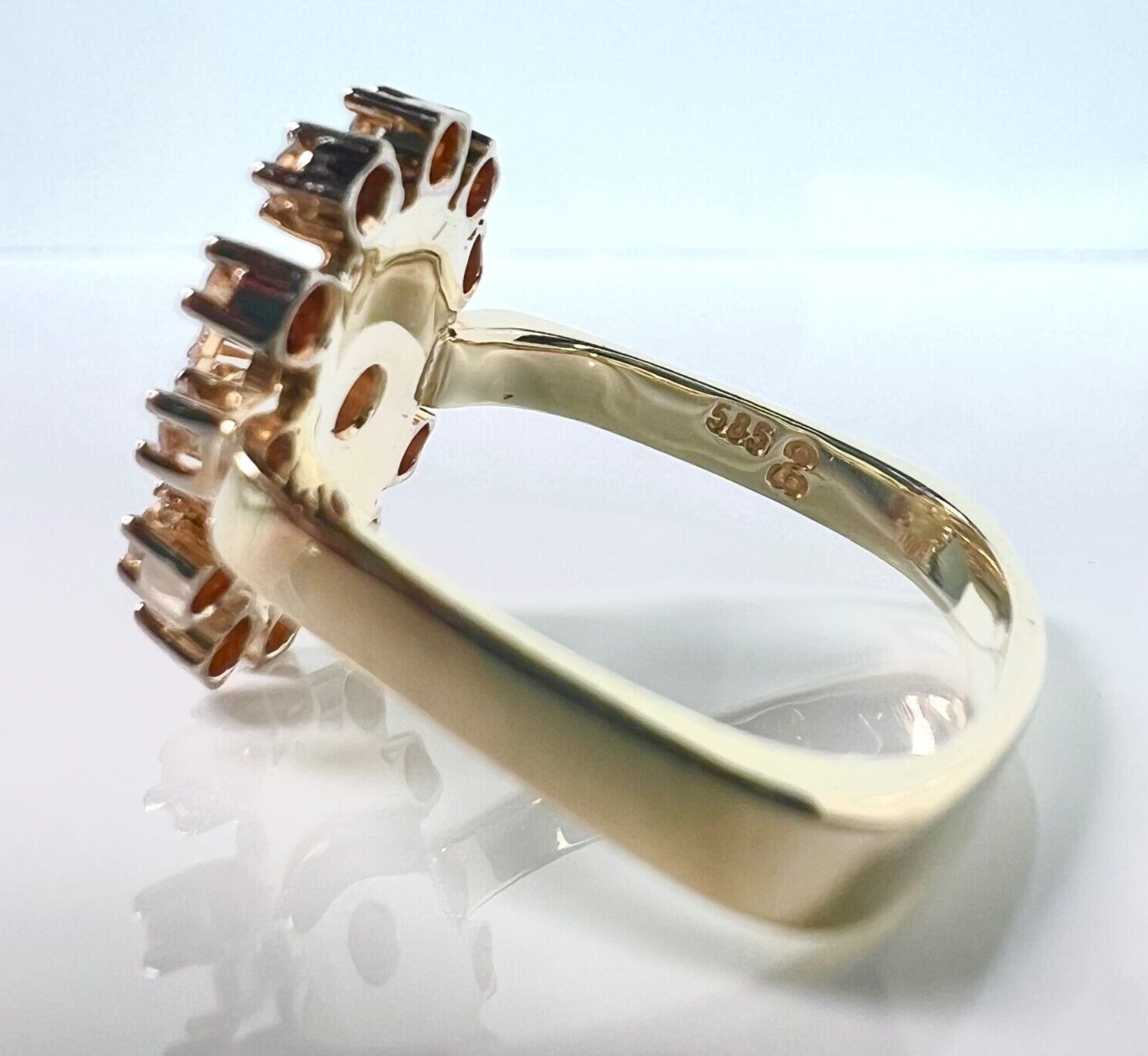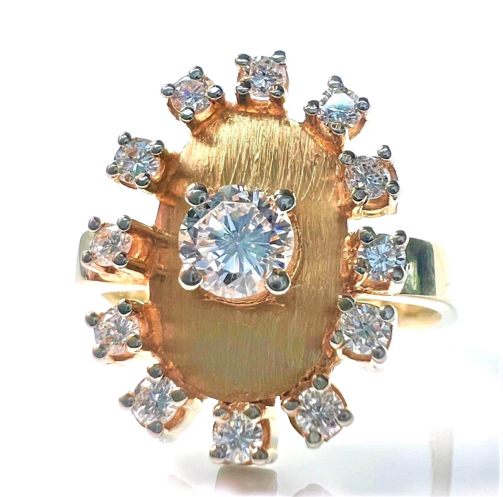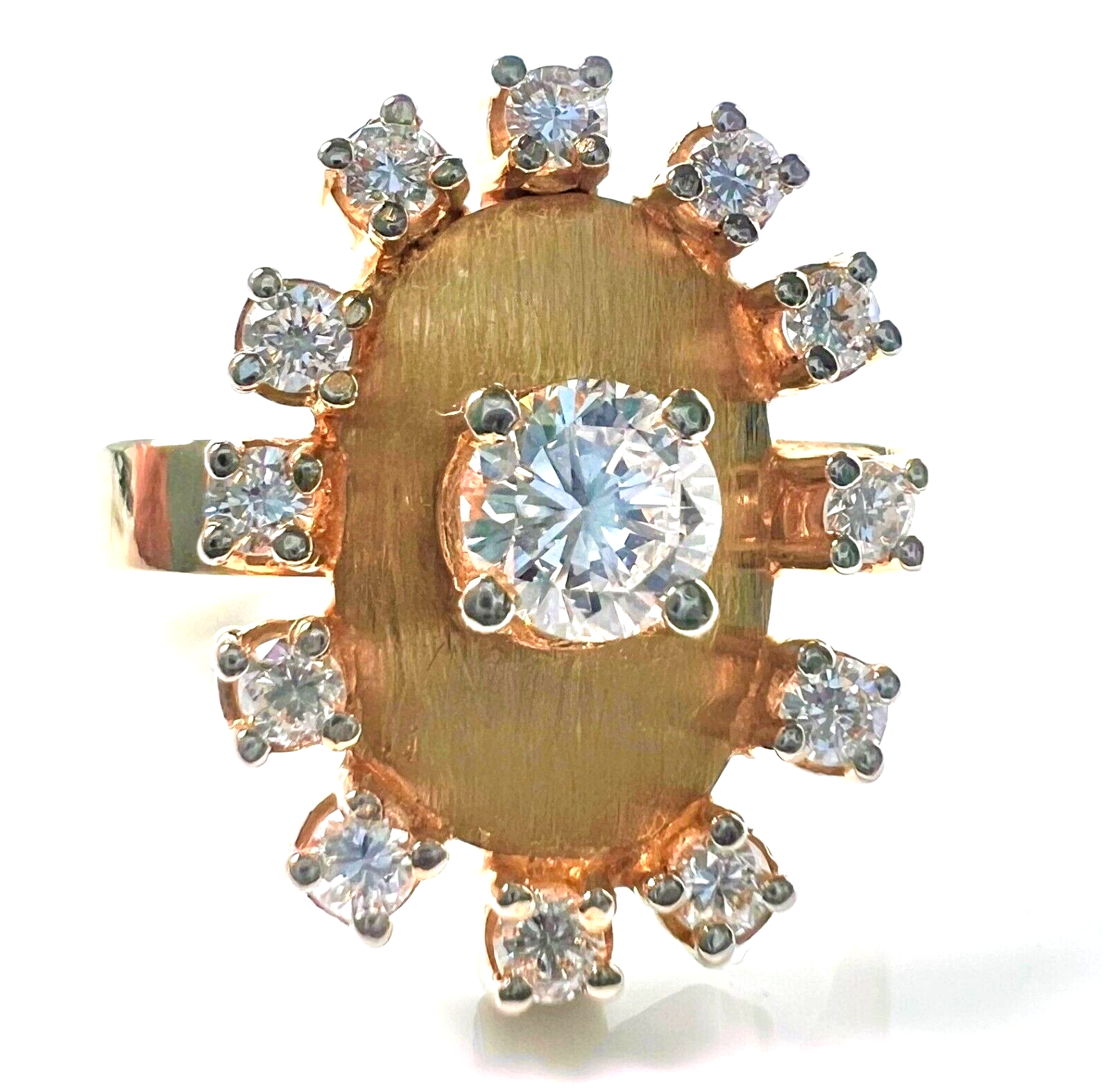 Kreativer Ring in 585 / 14 K Gelbgold. Der Ring ist eine Goldschmiede-Arbeit von Hand mit Signe. Der Ringkopf ist oval und hat im Zentrum einen Diamanten im Brillantschliff von ca. 0.32 ct. mit den Maßen 4,3 mm Durchmesser und 2,7 mm Tiefe eingefasst. Der Mittel-Diamant ist von außerordentlich guter Qualität mit Farbe F und Reinheit VVS. Der Rand des ovalen Ringkopfes ist noch besetzt mit 12 Diamanten im Brillantschliff von total 0.36 ct. (F/VS). Die Ringschiene ist leicht eckig gestaltet (Steigbügel-Design), was verhindert, dass sich der Ring am Finger dreht.