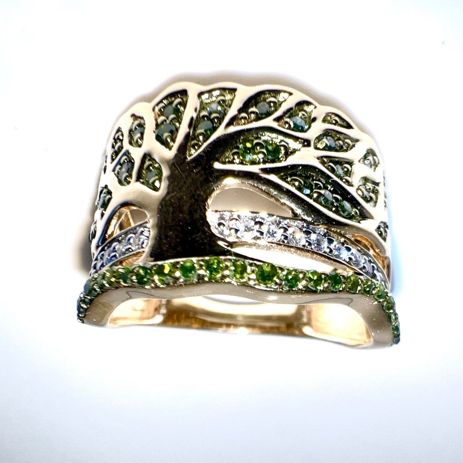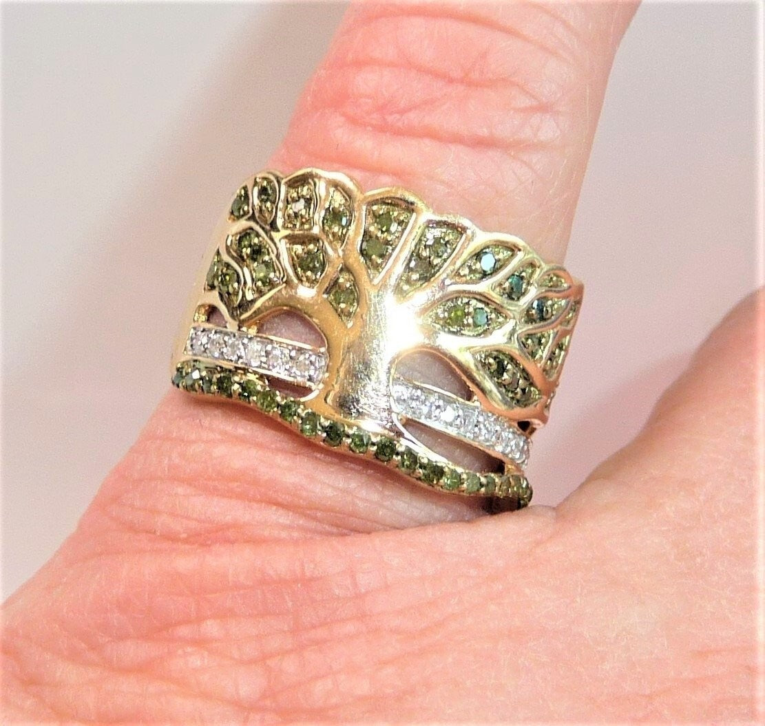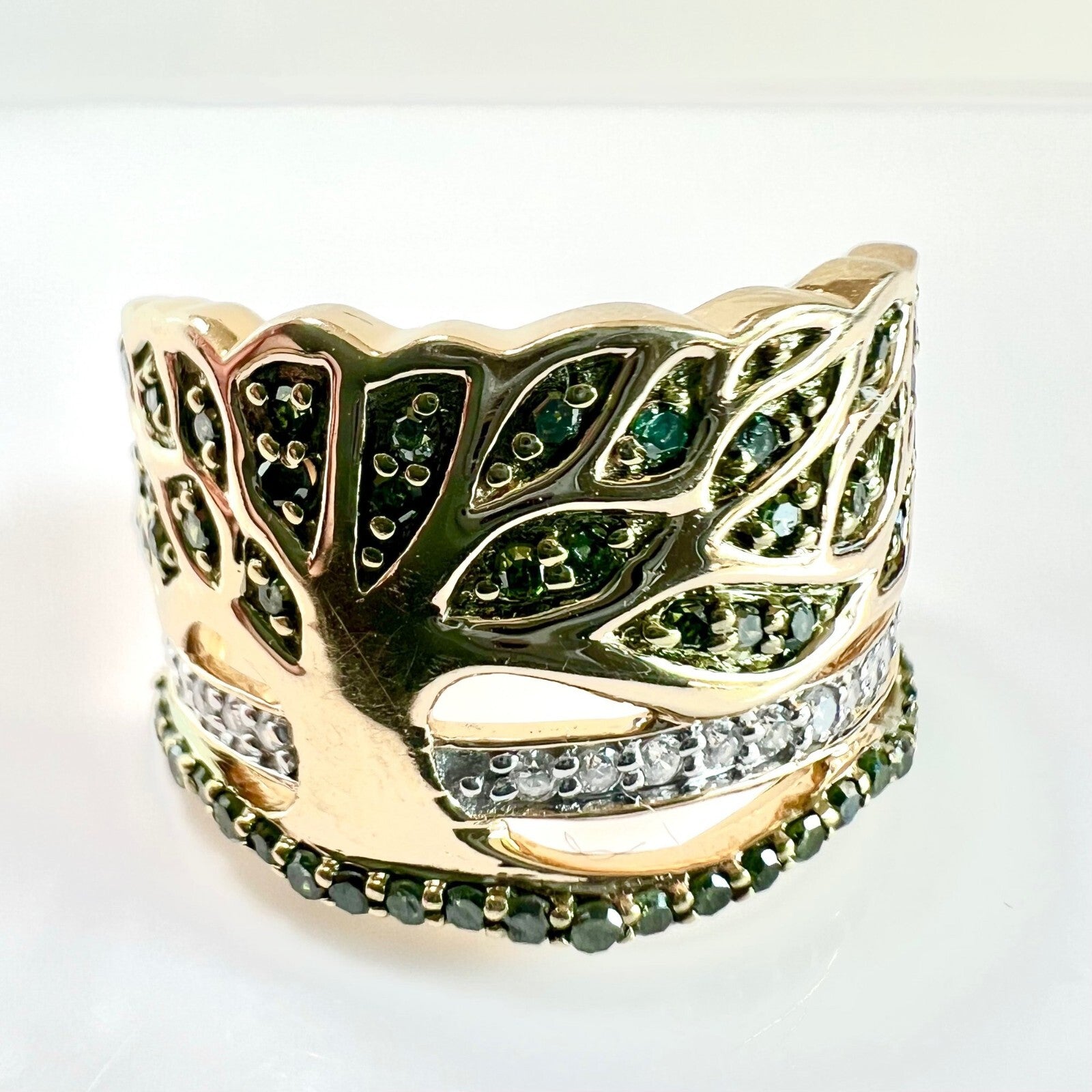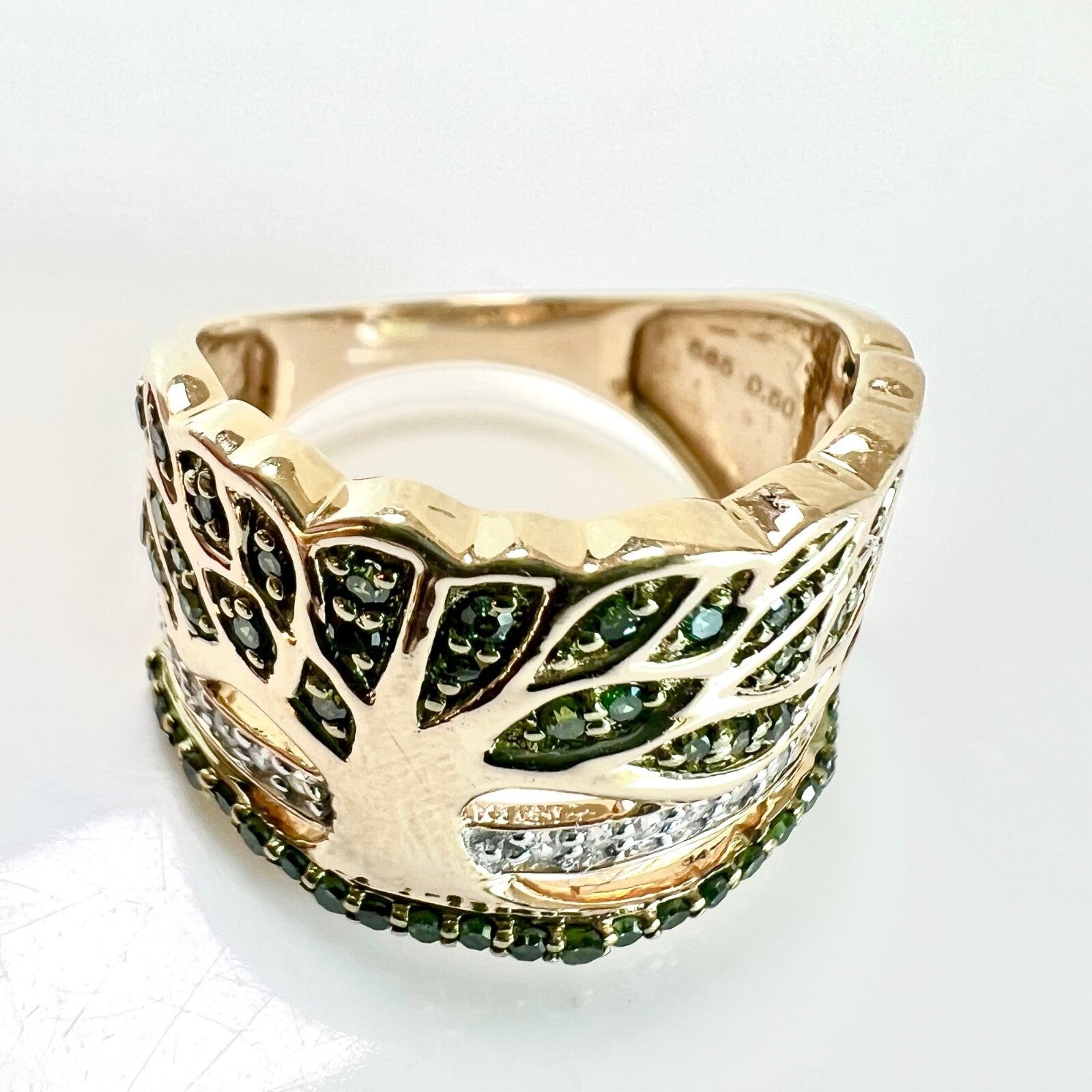Ring 585 Gold Landschaft mit Baum weiße und grüne Diamanten 54 änderbar
