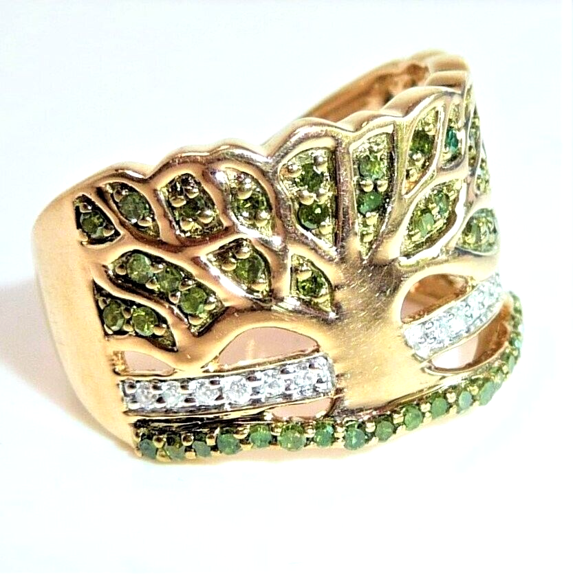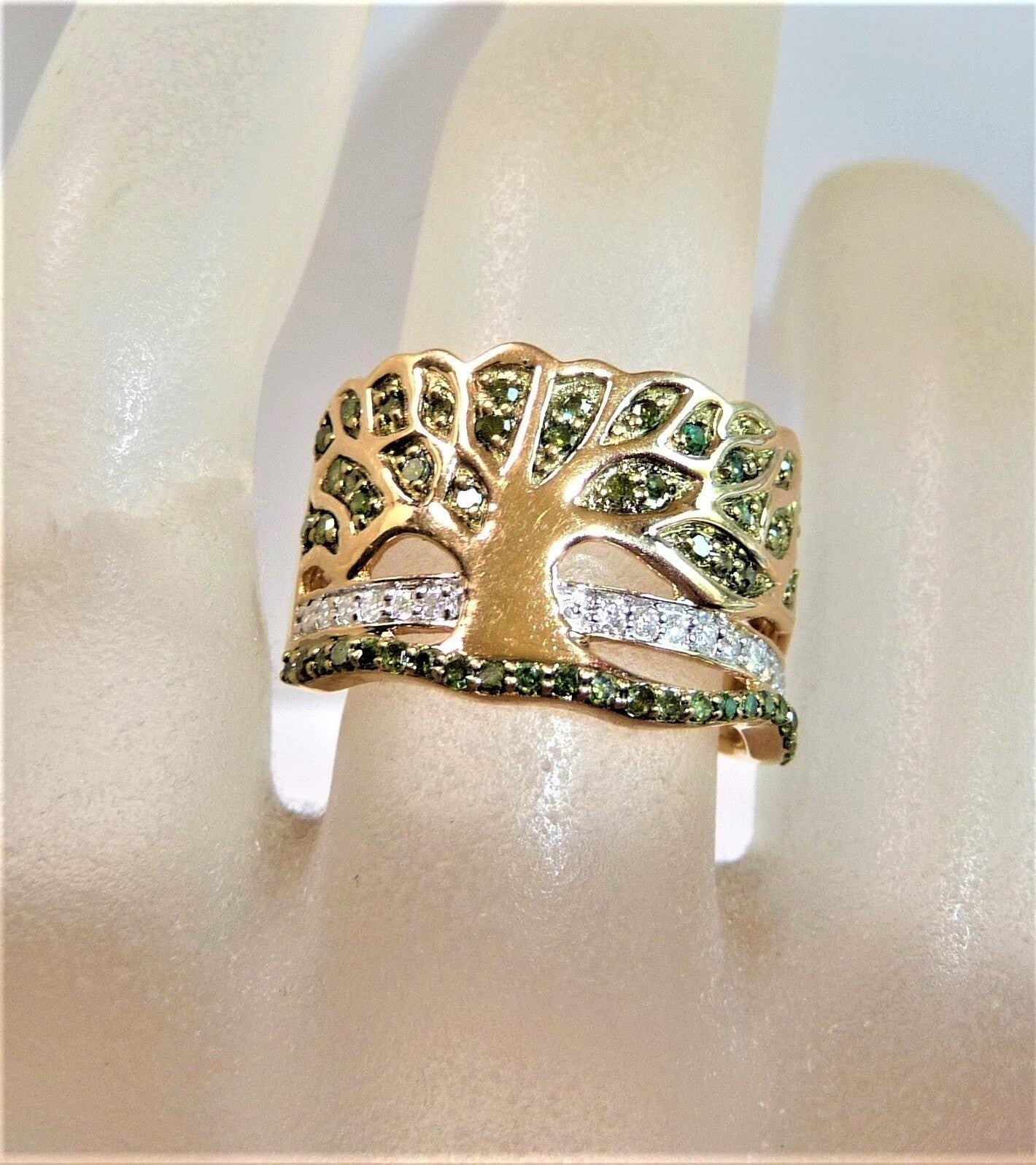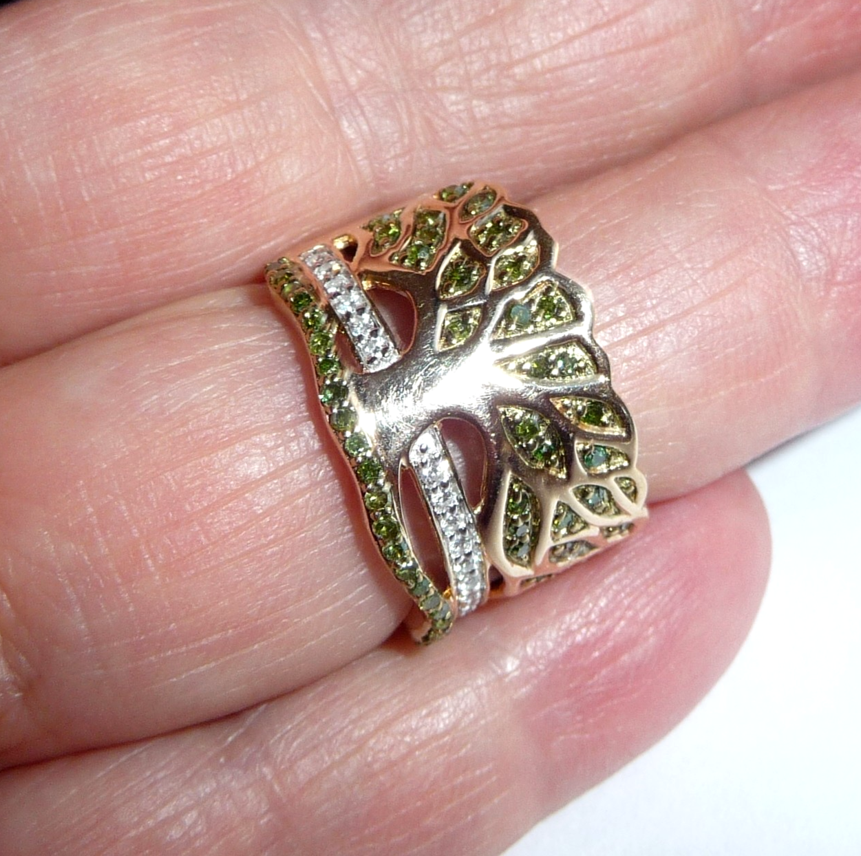 Ring 585 Gold Landschaft mit Baum weiße und grüne Diamanten 54 änderbar