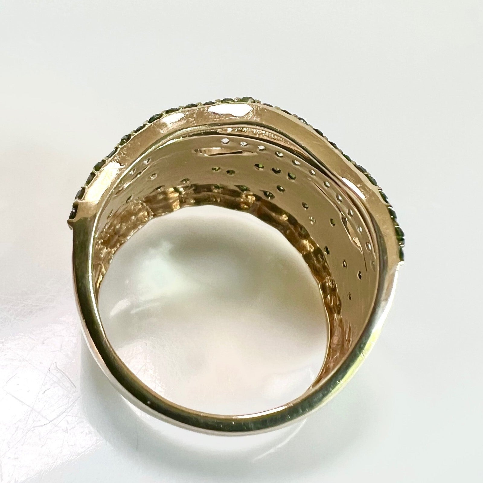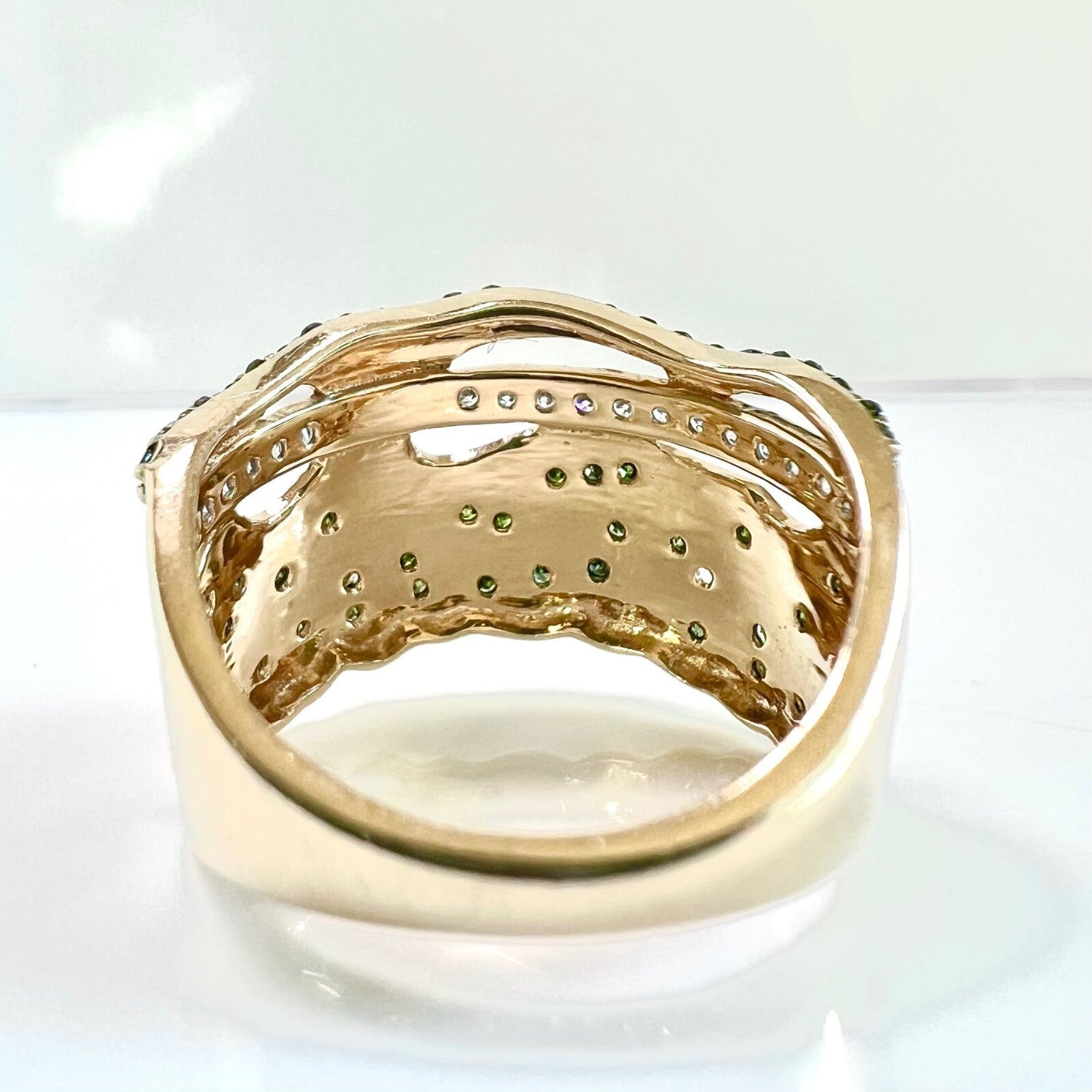 Ring in 585 / 14 K Gelbgold. Der Ring hat ein kreatives Design mit einem Landschafts-Motiv aus Diamanten und Gold geformt. Abgebildet ist ein großer Lebens-Baum. Im Vordergrund ist eine grüne Wiese und im Hintergrund ein hell glänzender Fluss aus weißen Diamanten. Bei den grünen Edelsteinen handelt es sich im 60 grüne Diamanten im Achtkantschliff von total 0.35 ct. (SI). Die 18 weißen Diamanten, die den Fluss symbolisieren, sind im Brillantschliff. Sie haben zusammen 0.15 ct. (F/SI).