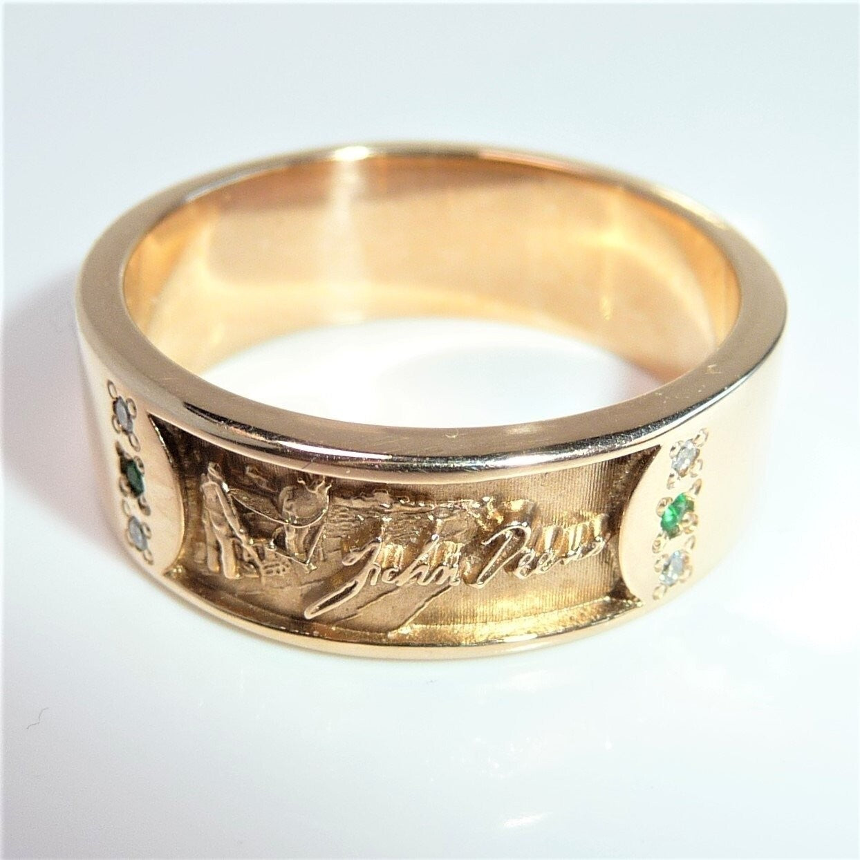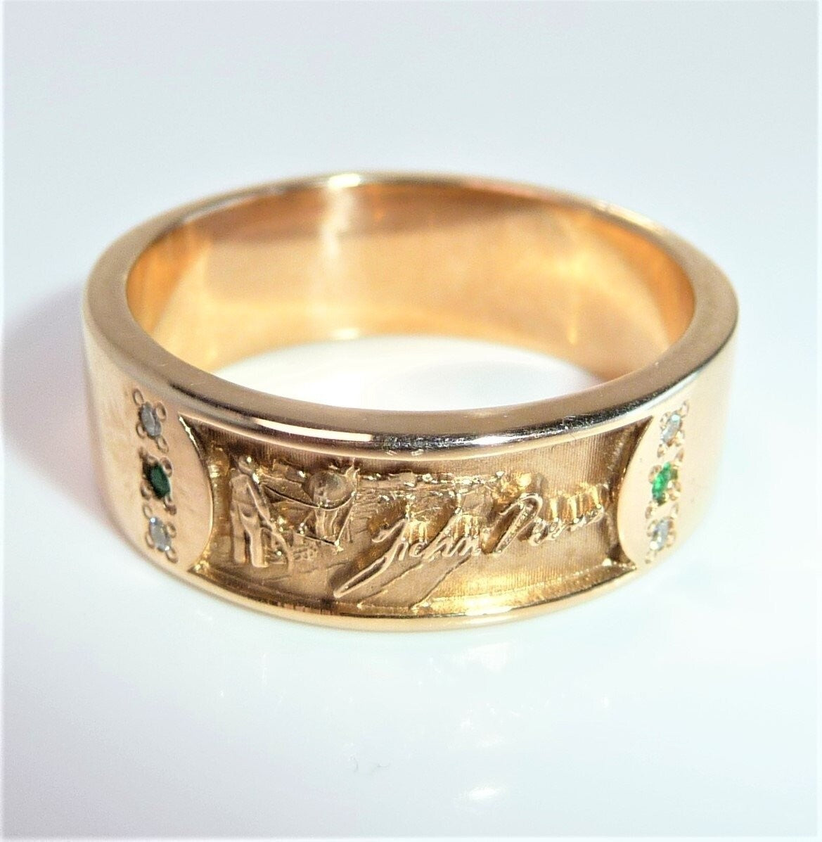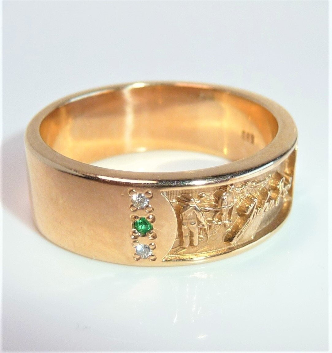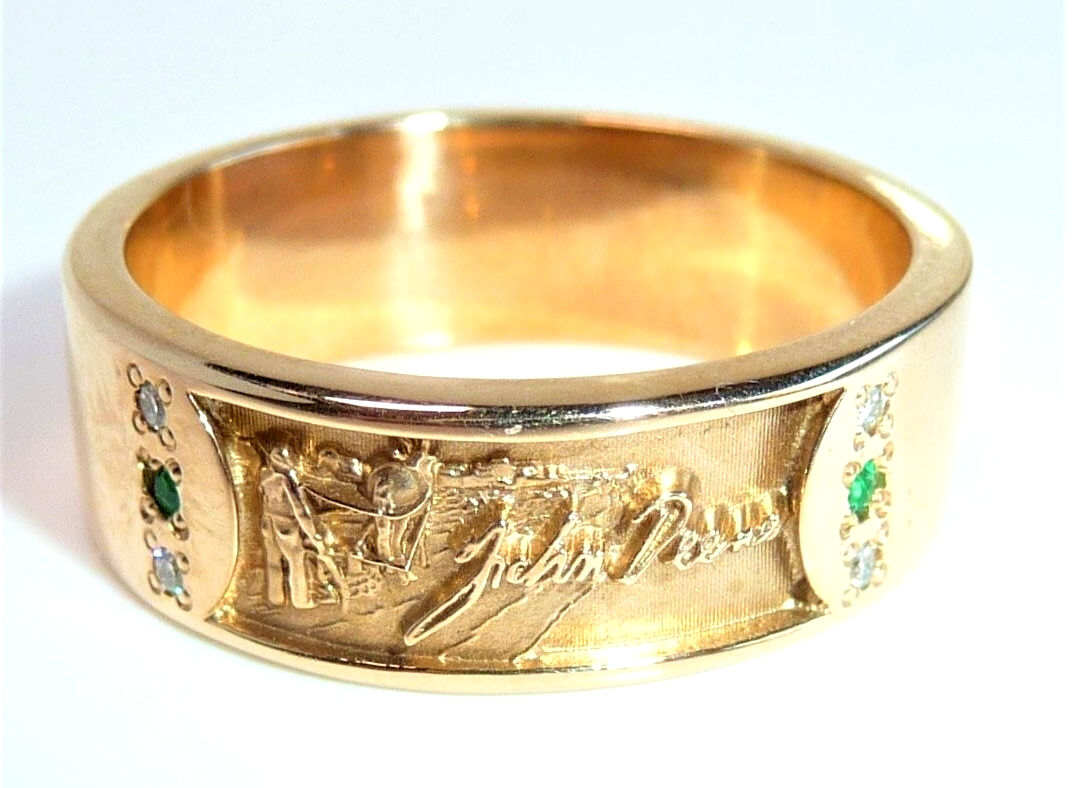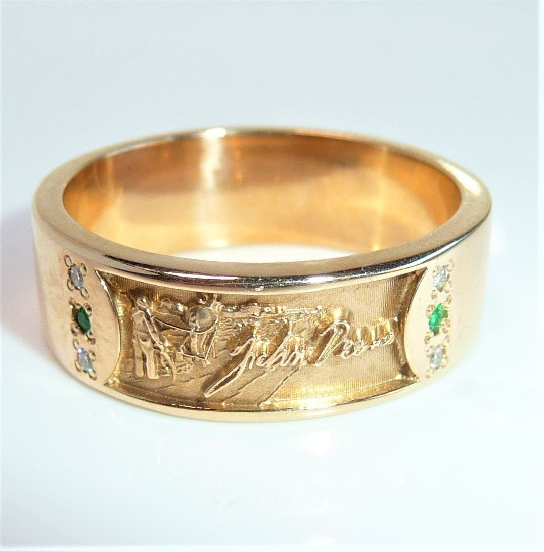 Ring in 585  / 14 K Roségold. Der Ring ist ein Jubiläumsring / Anniversary Ring von der  amerikanischen Marke für landwirtschaftliche Fahrzeuge John Deere. Wir denken, es ist schon ein älterer Sammler-Ring, der für besondere Ehrungen (Anniversary) im Bereich des gehobenen Managements verliehen wurde. Wunderschöne Ausführung in massivem 585 / 14 K Roségold. Wie ein plastisches Relief ist eine landwirtschaftliche Szenerie in das Gold geprägt mit dem Schriftzug "John Deere" und einem Farmer, der das Feld pflügt.
