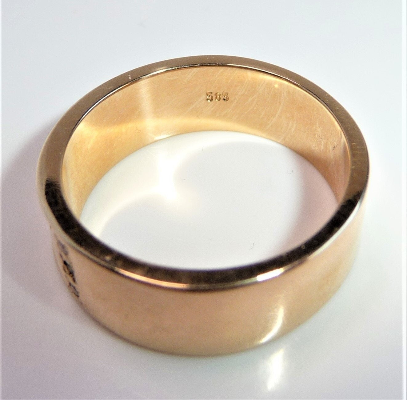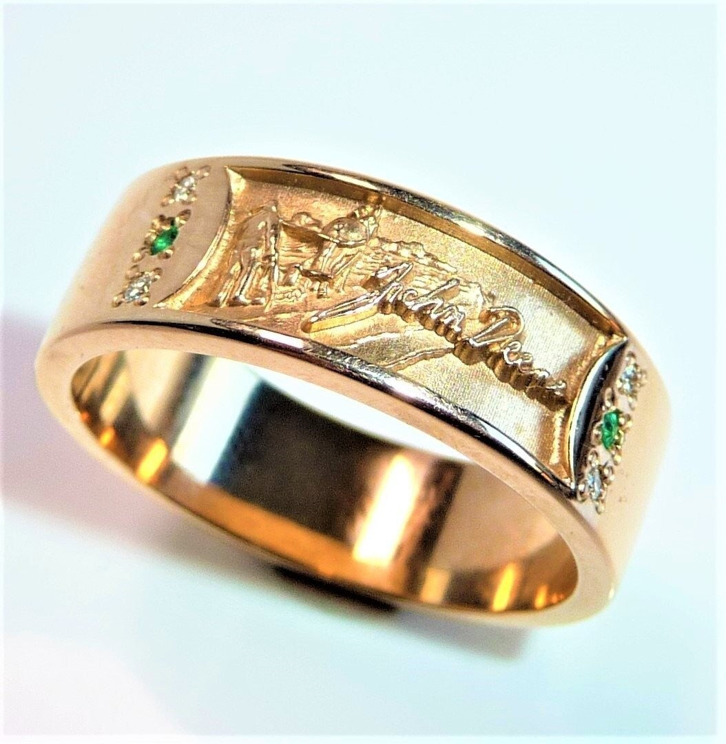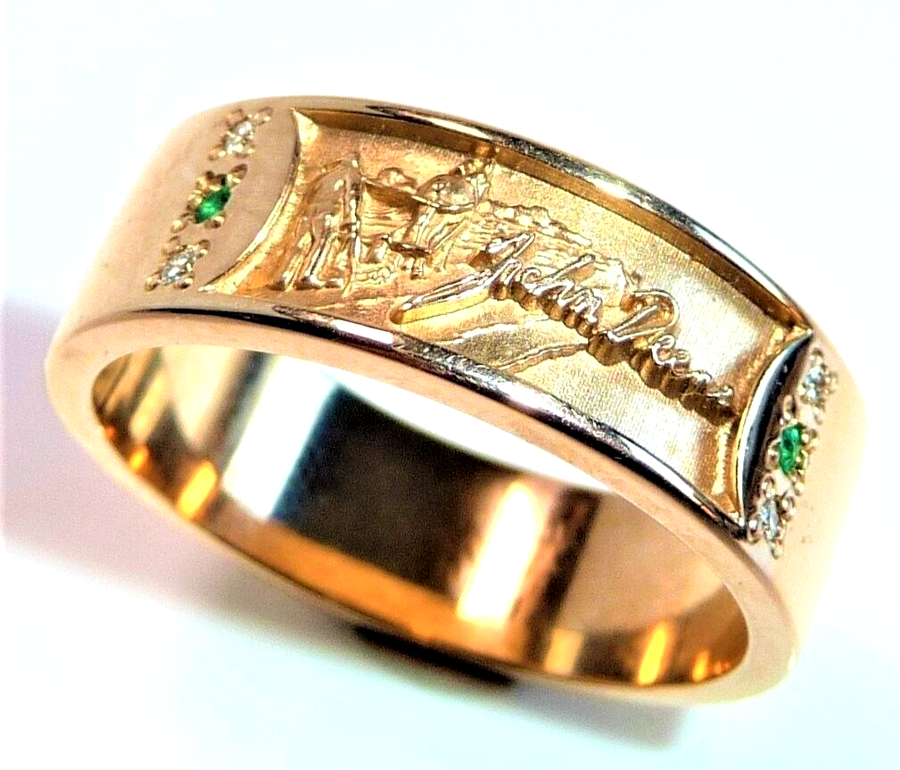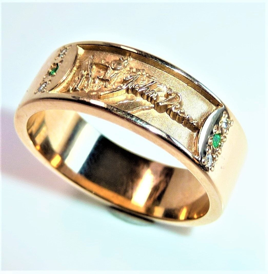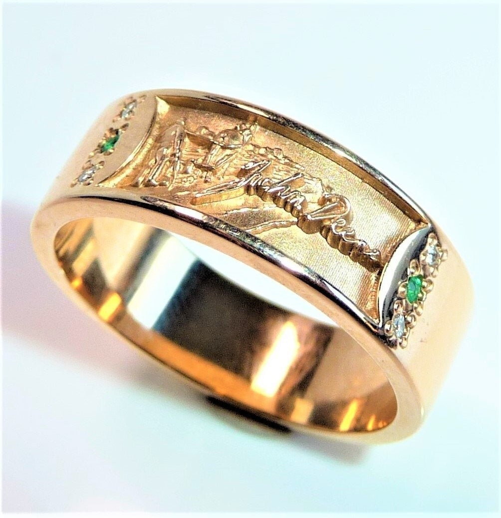 Ring in 585  / 14 K Roségold. Der Ring ist ein Jubiläumsring / Anniversary Ring von der  amerikanischen Marke für landwirtschaftliche Fahrzeuge John Deere. Wir denken, es ist schon ein älterer Sammler-Ring, der für besondere Ehrungen (Anniversary) im Bereich des gehobenen Managements verliehen wurde. Wunderschöne Ausführung in massivem 585 / 14 K Roségold. Wie ein plastisches Relief ist eine landwirtschaftliche Szenerie in das Gold geprägt mit dem Schriftzug "John Deere" und einem Farmer, der das Feld pflügt.