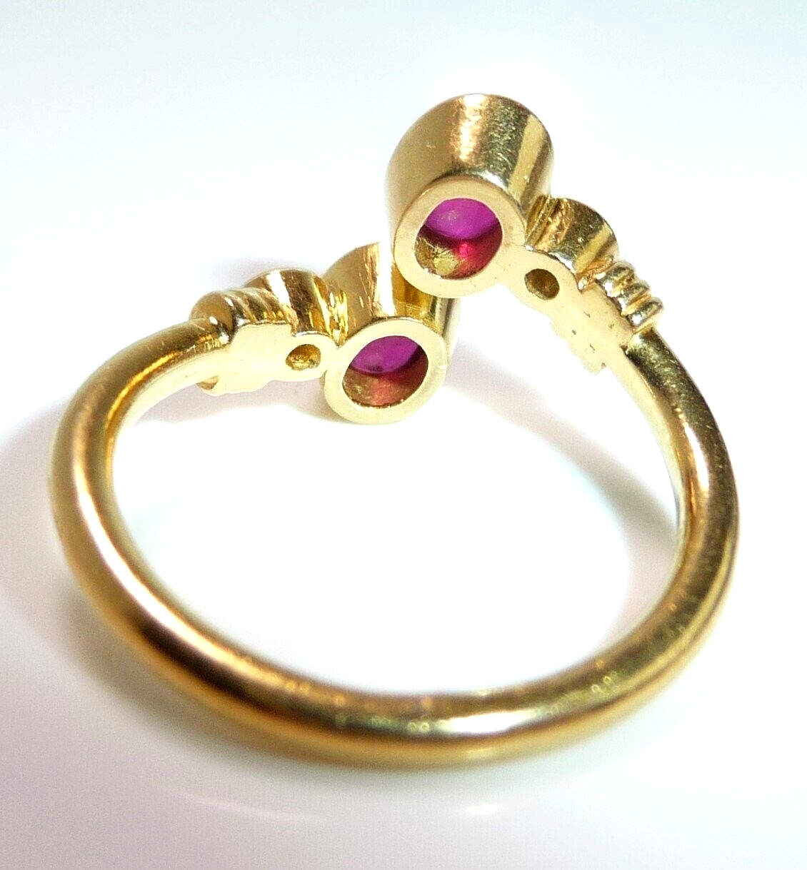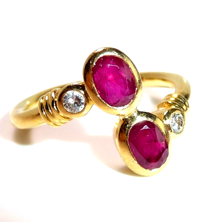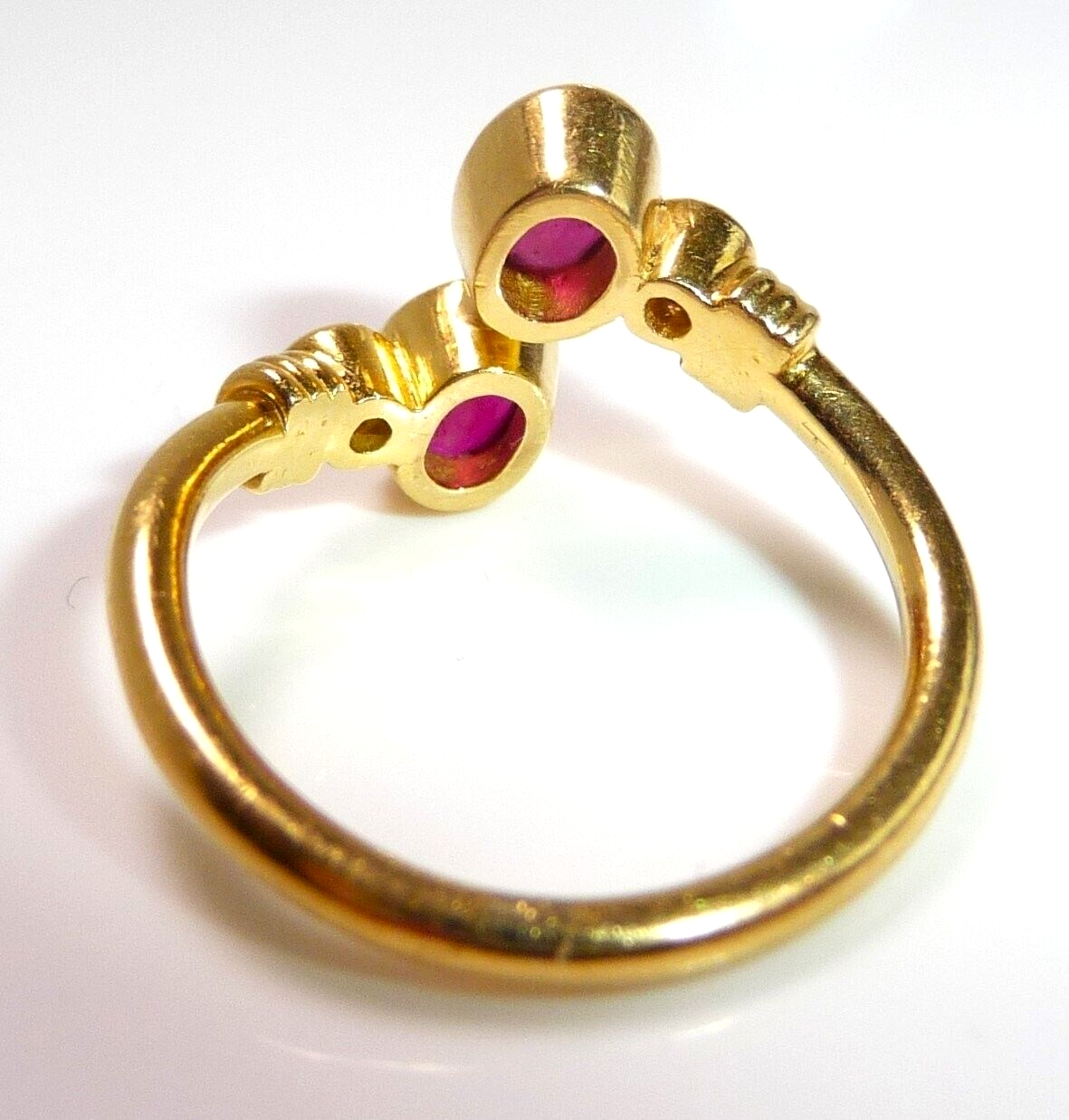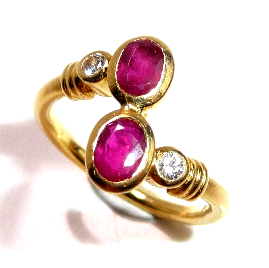 Ring in 750 / 18 K Gelbgold. Der Ringkopf teilt sich im oberen Bereich und die Enden haben je einen Rubin eingefasst von zusammen 0.60 ct.. Im Übergang zur Ringschiene ist jeweils noch ein Diamant im Brillantschliff eingefasst. Zusammen haben die beiden Diamanten 0.10 ct. mit Farbe G und Reinheit SI.