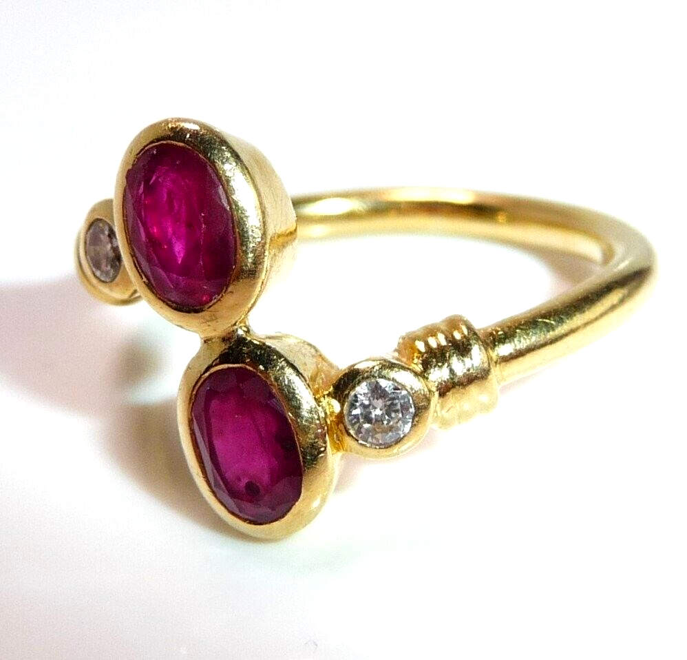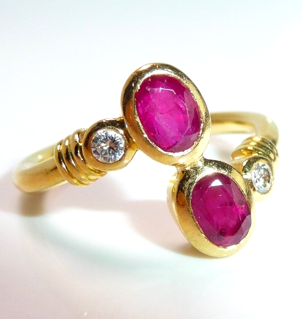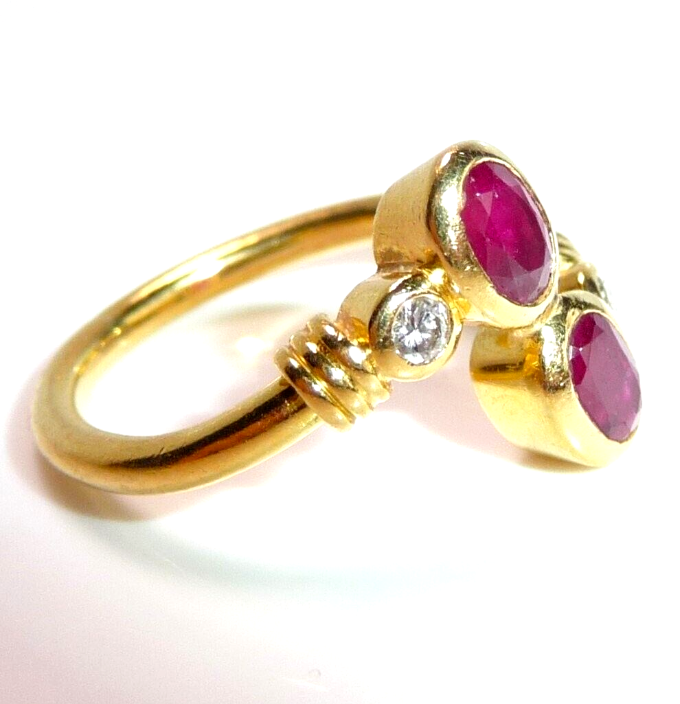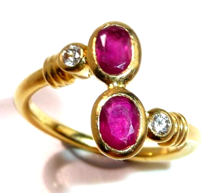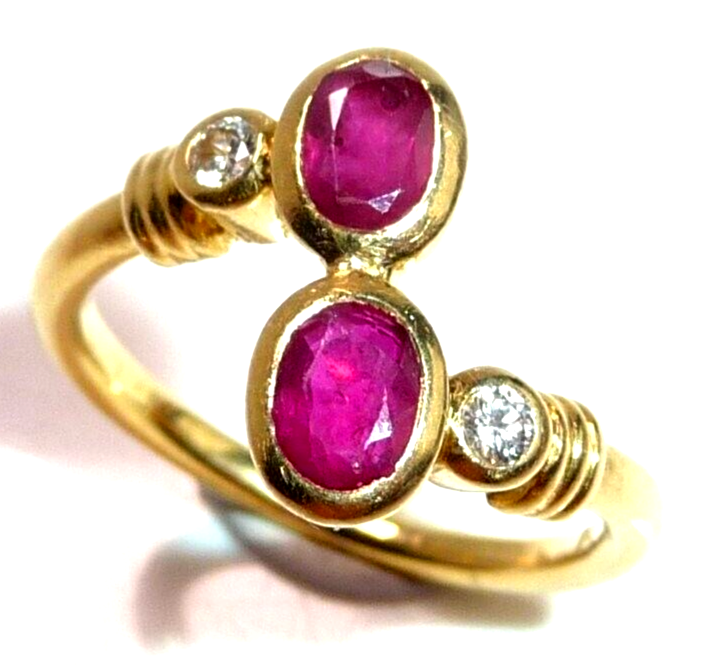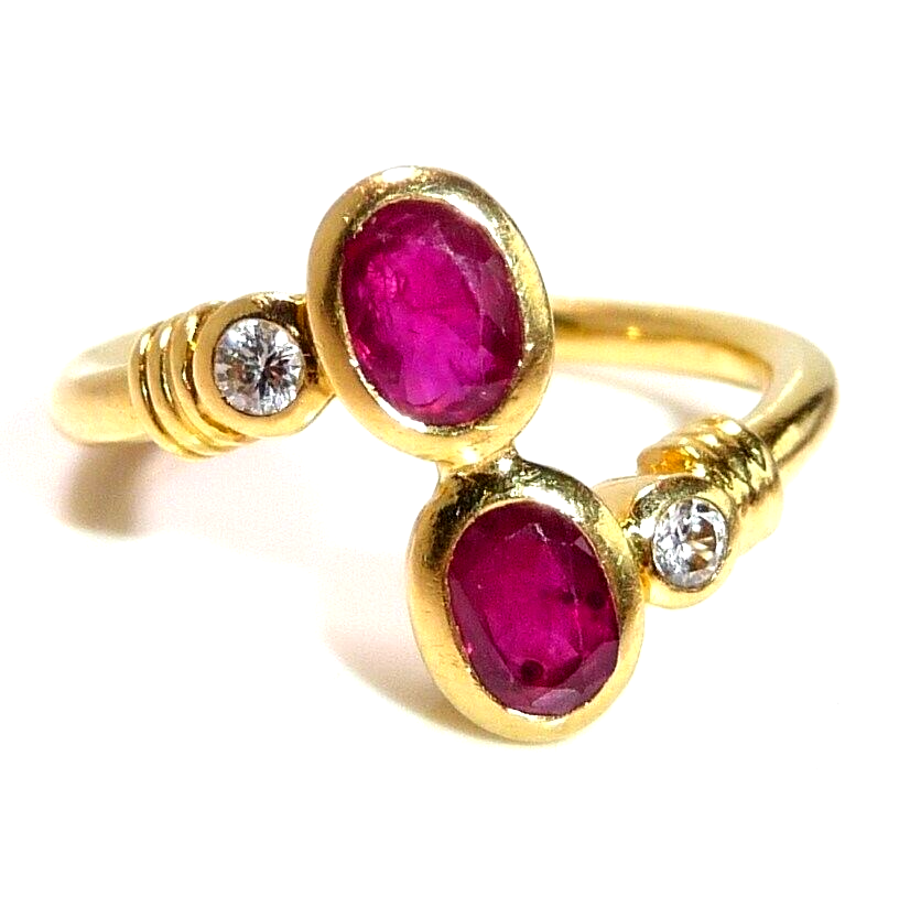Ring in 750 / 18 K Gelbgold. Der Ringkopf teilt sich im oberen Bereich und die Enden haben je einen Rubin eingefasst von zusammen 0.60 ct.. Im Übergang zur Ringschiene ist jeweils noch ein Diamant im Brillantschliff eingefasst. Zusammen haben die beiden Diamanten 0.10 ct. mit Farbe G und Reinheit SI.