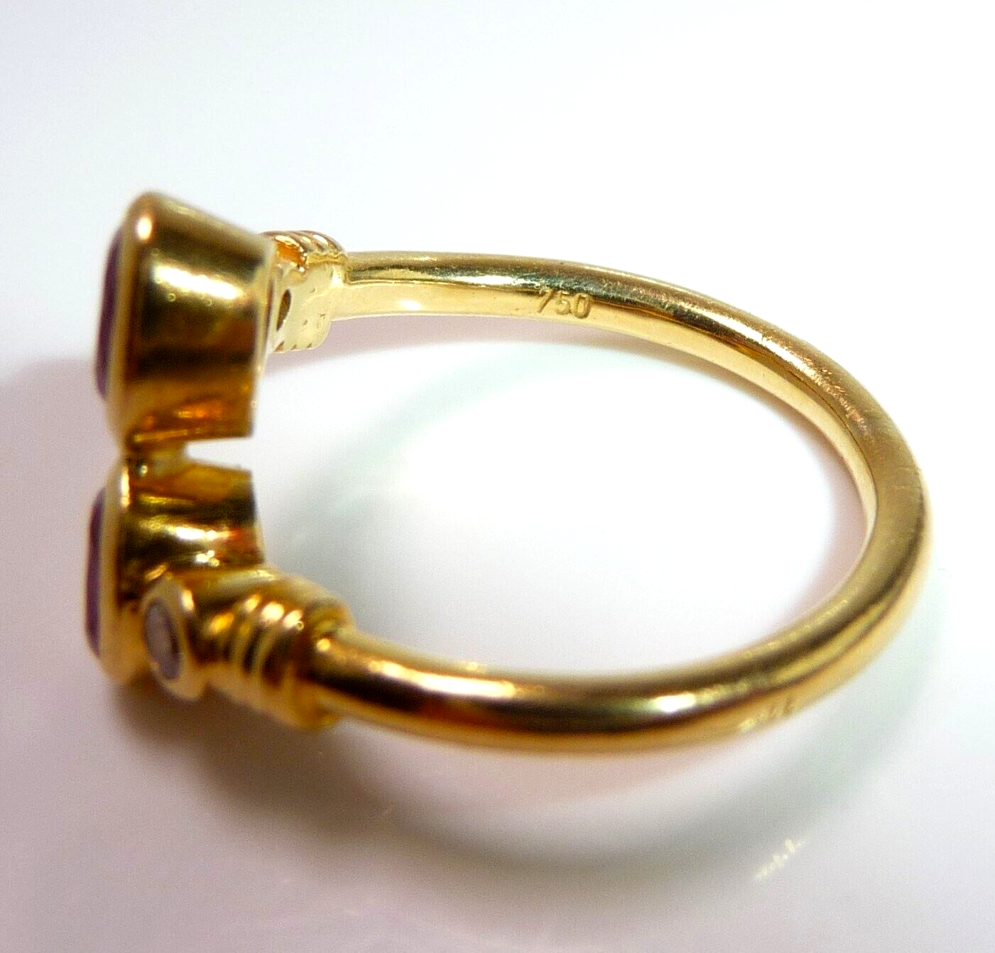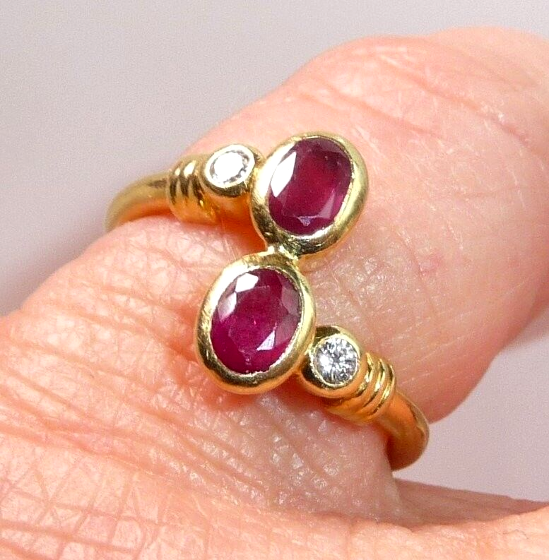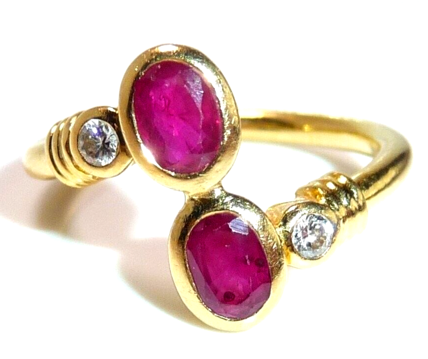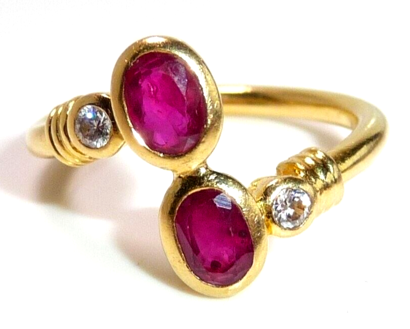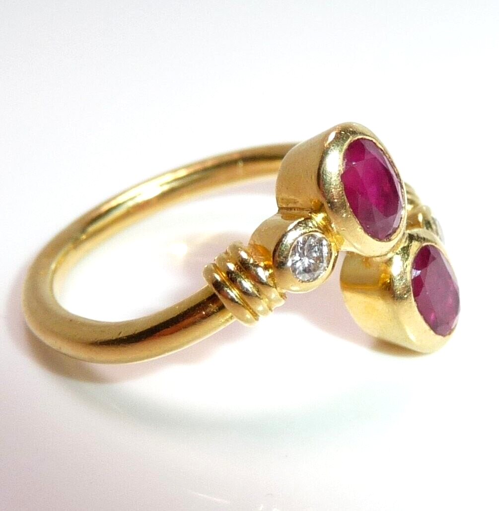 Ring in 750 / 18 K Gelbgold. Der Ringkopf teilt sich im oberen Bereich und die Enden haben je einen Rubin eingefasst von zusammen 0.60 ct.. Im Übergang zur Ringschiene ist jeweils noch ein Diamant im Brillantschliff eingefasst. Zusammen haben die beiden Diamanten 0.10 ct. mit Farbe G und Reinheit SI.