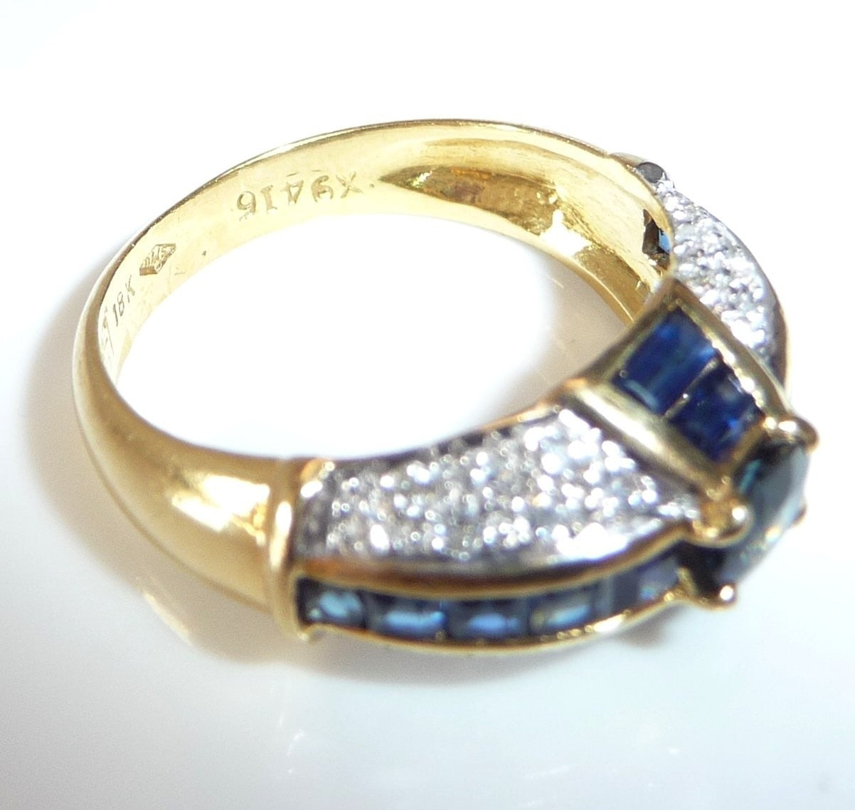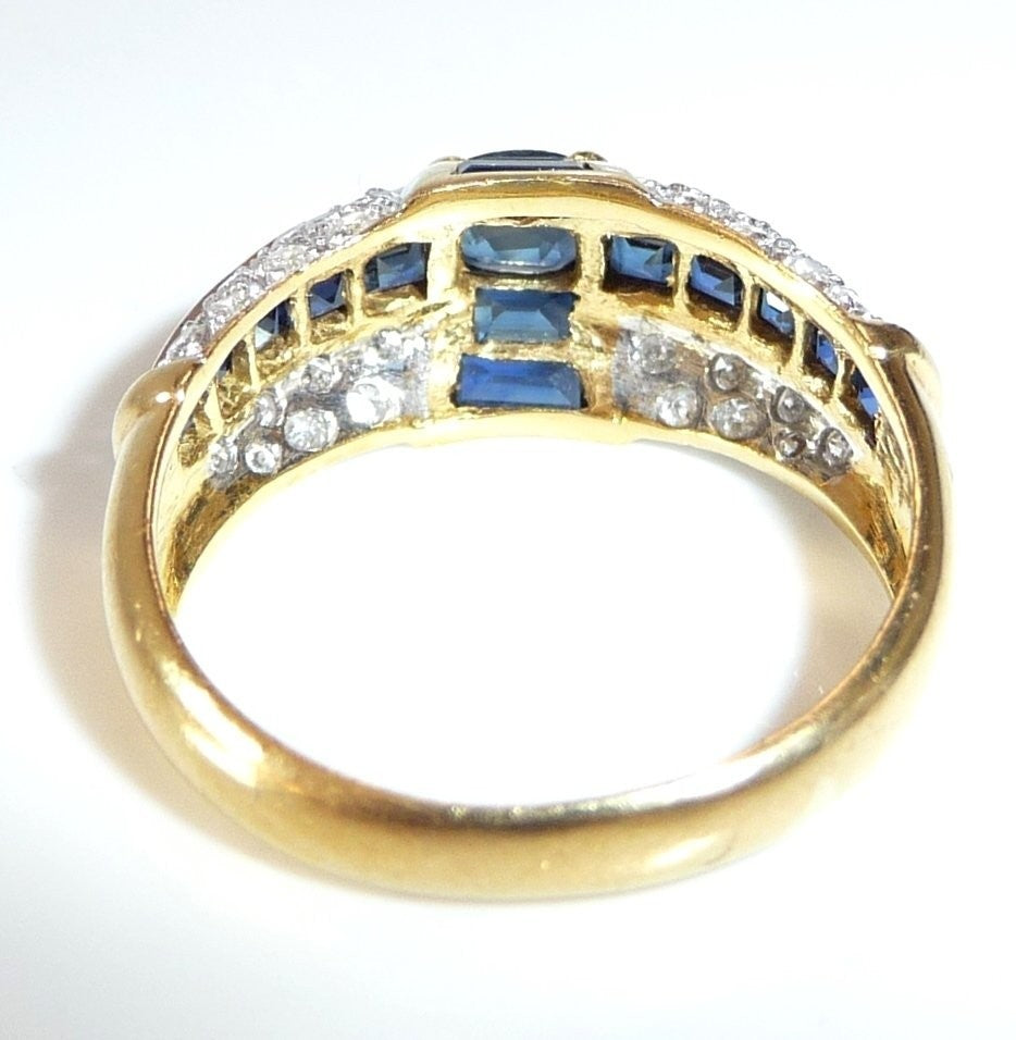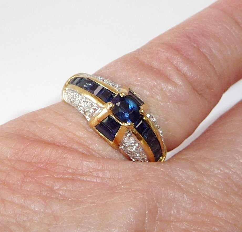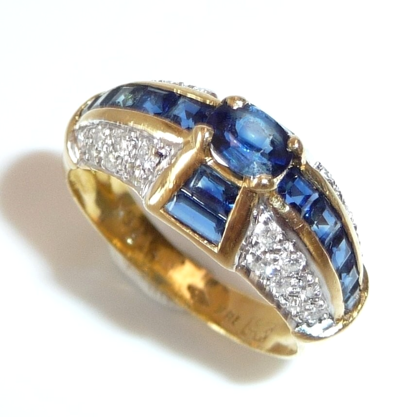 Ring in 750 / 14 K Gelbgold mit Weißgold im Bereich der Diamanten. Das Design ist interessant: in der verbreiterten und leicht gewölbten Mitte ist ein Streifen von blauen Saphiren eingefasst, der sich in der Mitte kreuzt. Zusammen haben die insgesamt 15 Saphire 1.00 ct. In die freien Stellen sind insgesamt 28 Diamanten im Brillantschliff pavé in Weißgold gefasst und ergeben glitzernde Flächen, die das dunkle Blau kontrastieren.