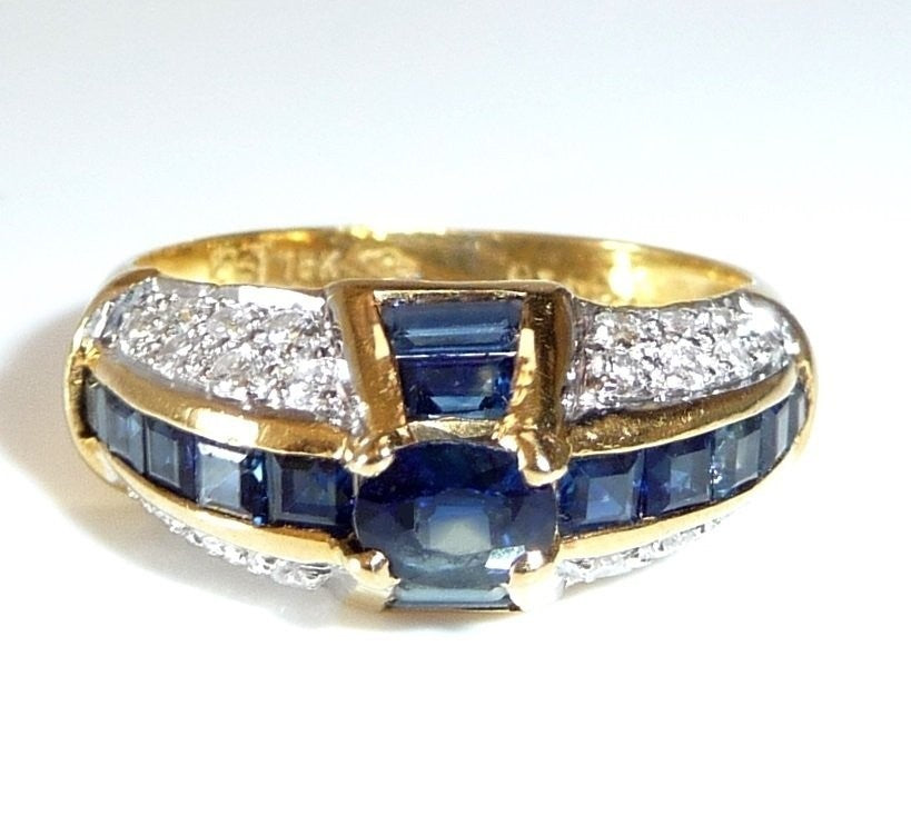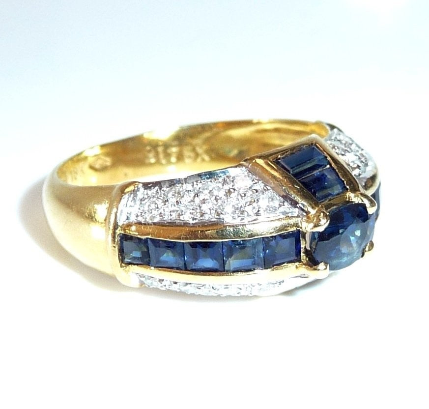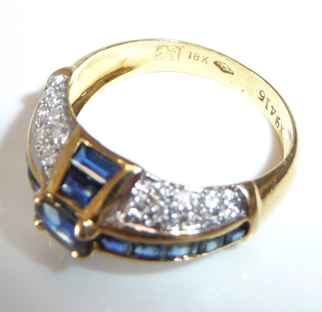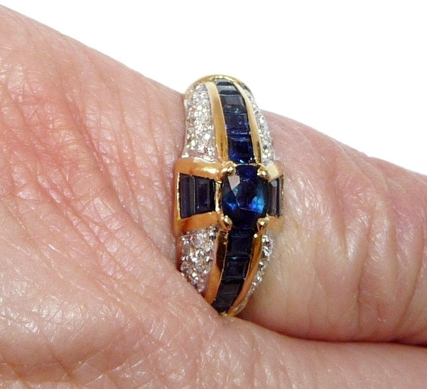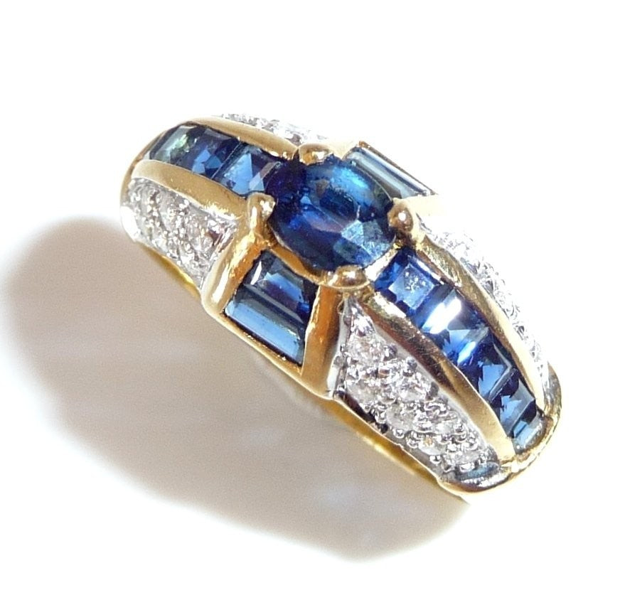 Ring in 750 / 14 K Gelbgold mit Weißgold im Bereich der Diamanten. Das Design ist interessant: in der verbreiterten und leicht gewölbten Mitte ist ein Streifen von blauen Saphiren eingefasst, der sich in der Mitte kreuzt. Zusammen haben die insgesamt 15 Saphire 1.00 ct. In die freien Stellen sind insgesamt 28 Diamanten im Brillantschliff pavé in Weißgold gefasst und ergeben glitzernde Flächen, die das dunkle Blau kontrastieren.
