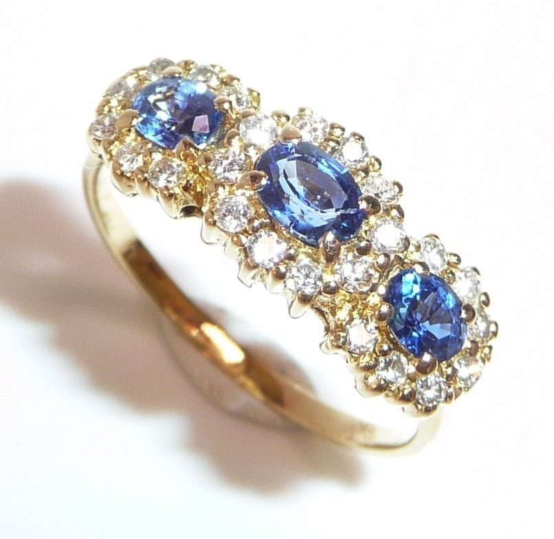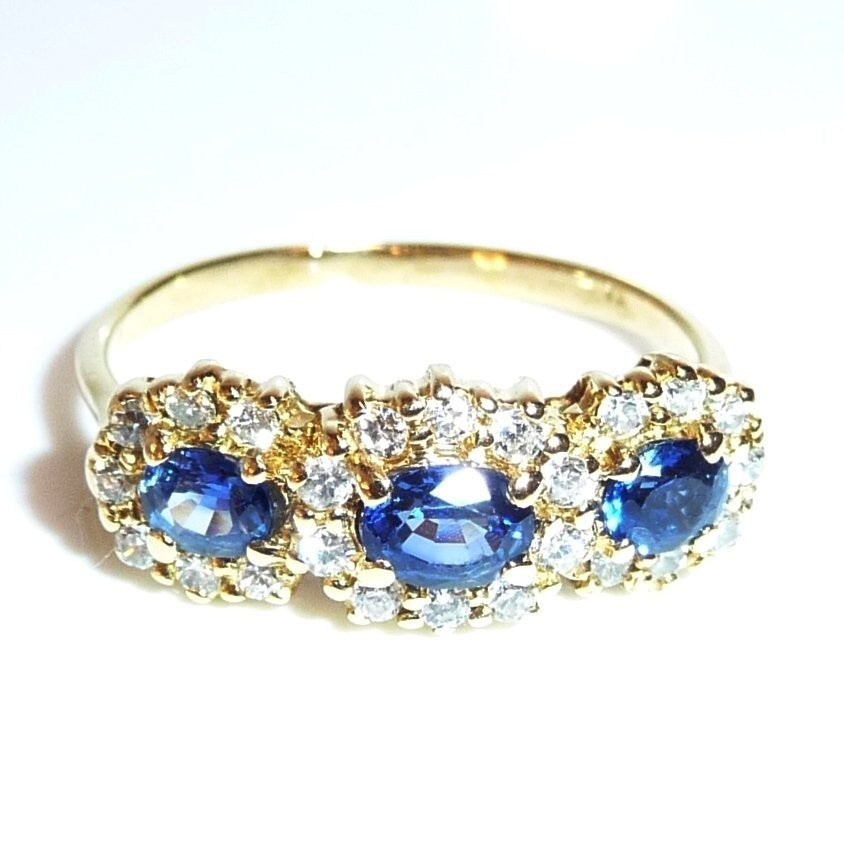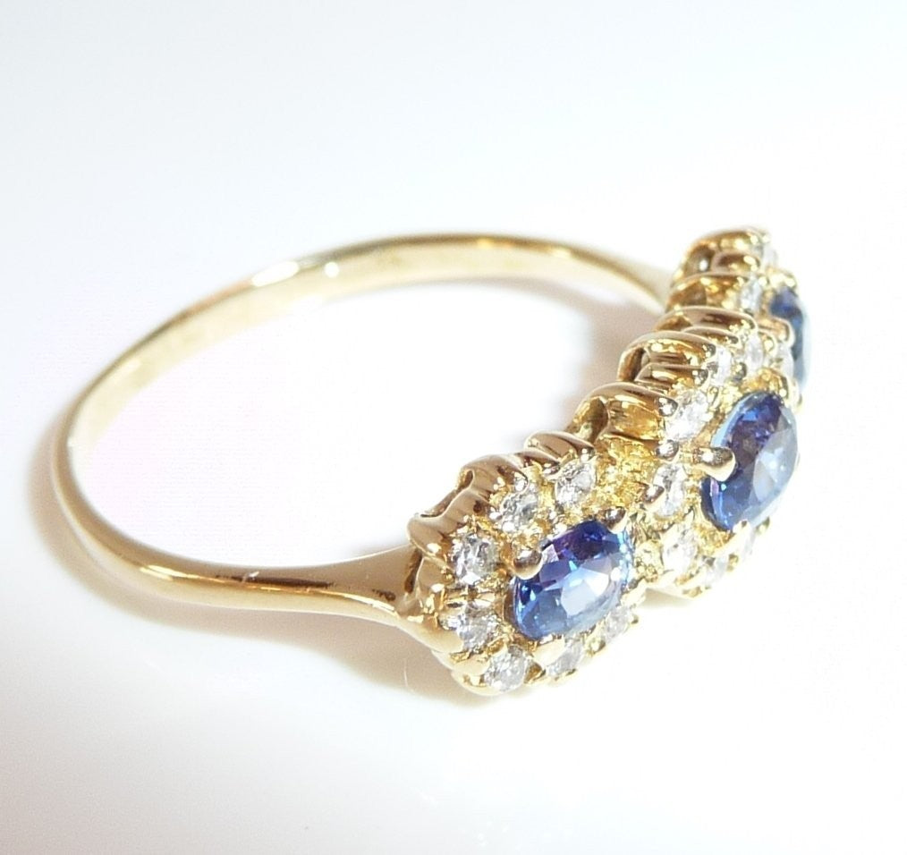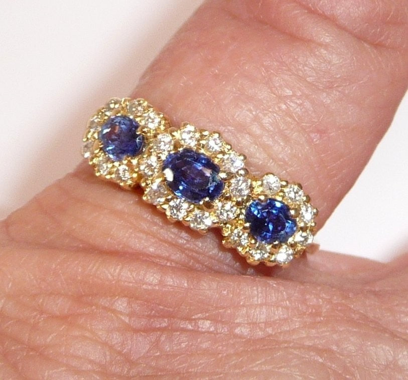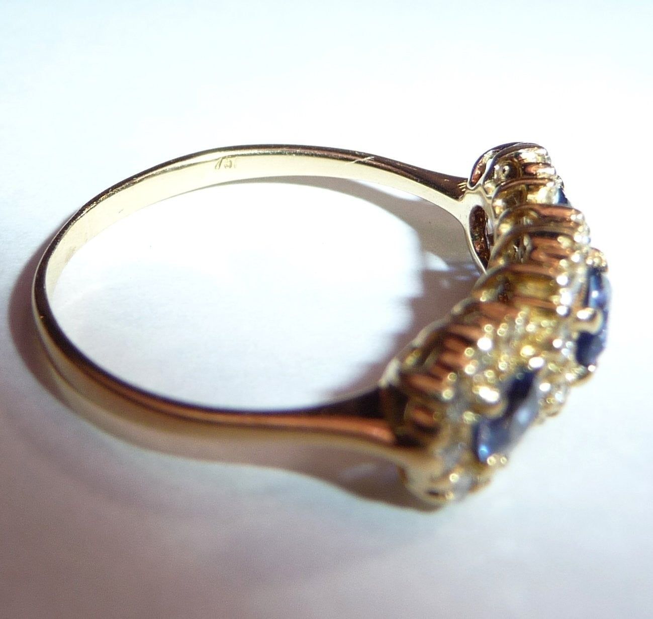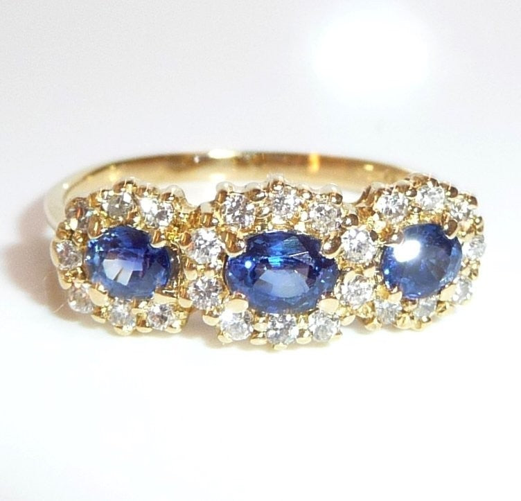 Goldschmiede-Ring, gearbeitet in 18 K / 750 Gelbgold. Das Design des Ringes ist quer zum Finger arrangiert.  Der Ring hat drei ovale, facettierte Saphire in feinstem mittleren Blau eingefasst. Zusammen wieder die 3 Saphire 0.60 ct.. Jeder Saphir wird umspielt von funkelnden Diamanten im Brillantschliff. Zusammen haben die 24 Diamanten 0.50 ct. mit Farbe F-G und Reinheit VS-SI. Der farbliche Kontrast zwischen Diamanten und Saphiren macht den Ring zum Eye-Catcher.