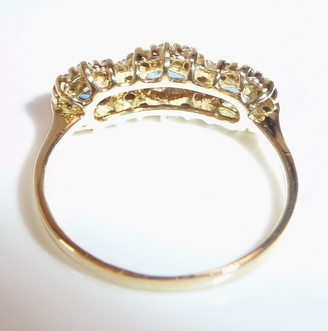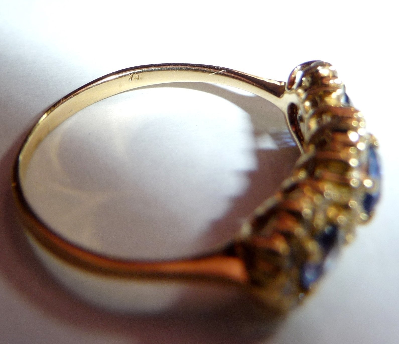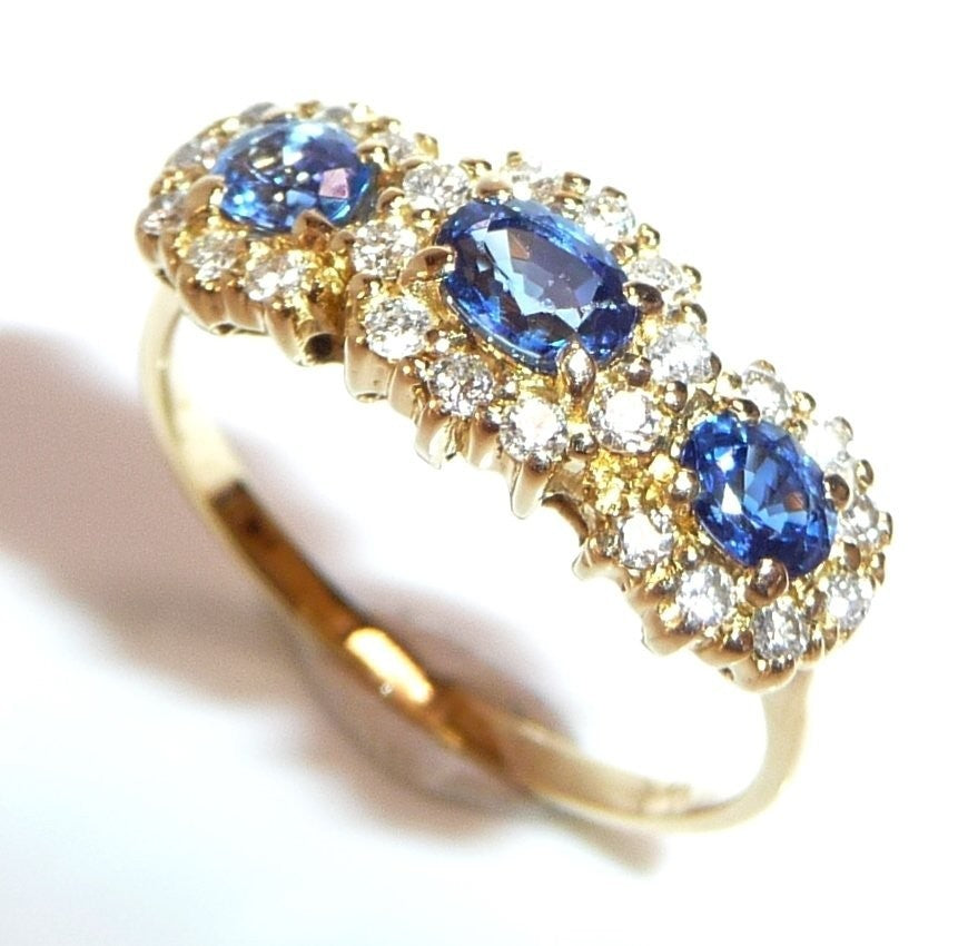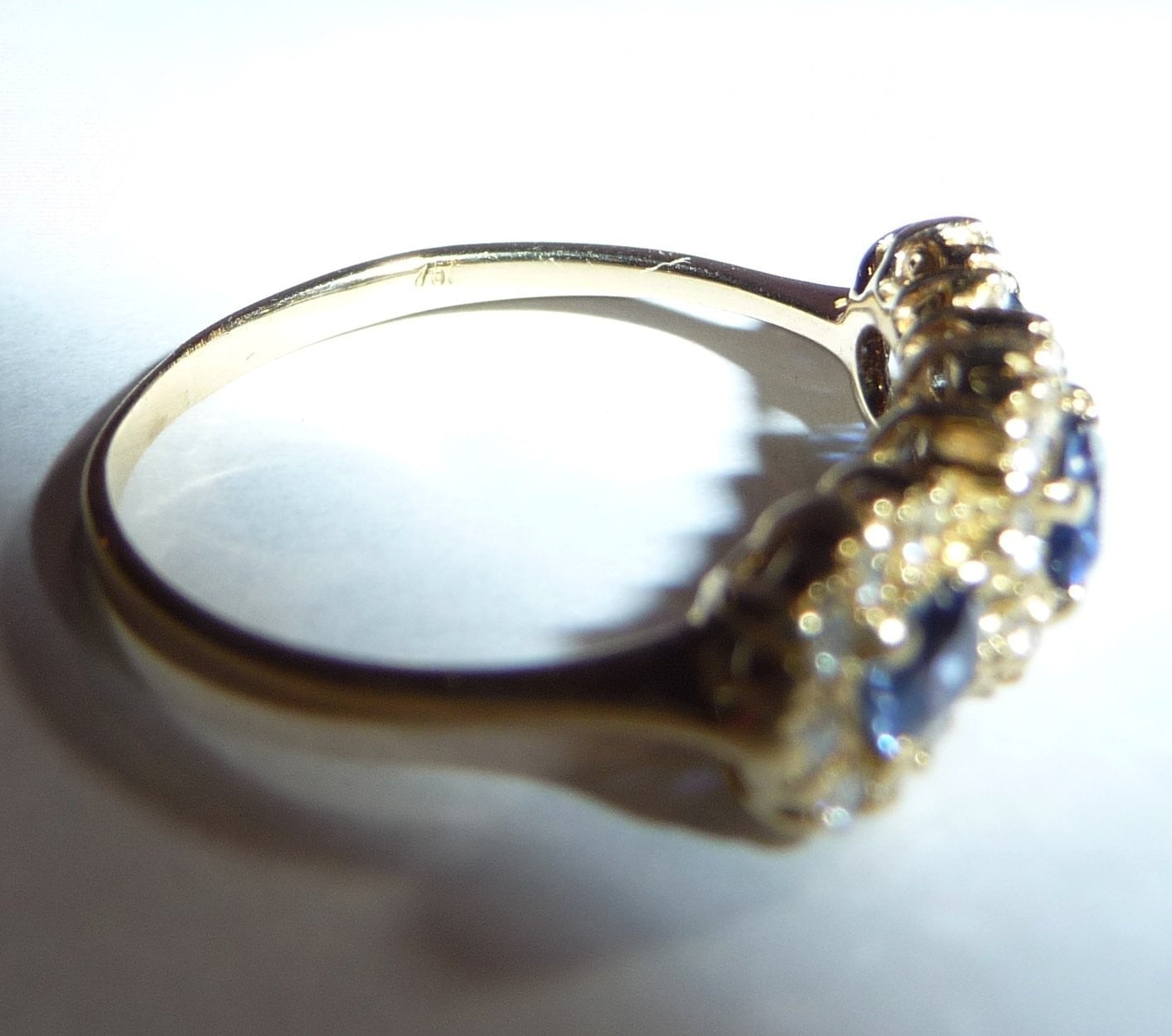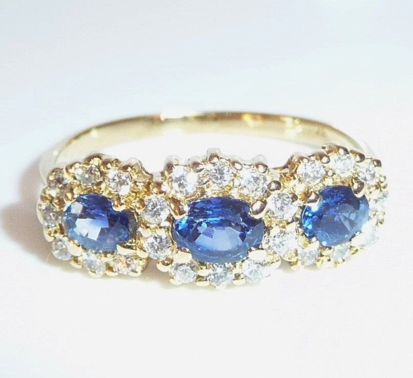 Goldschmiede-Ring, gearbeitet in 18 K / 750 Gelbgold. Das Design des Ringes ist quer zum Finger arrangiert.  Der Ring hat drei ovale, facettierte Saphire in feinstem mittleren Blau eingefasst. Zusammen wieder die 3 Saphire 0.60 ct.. Jeder Saphir wird umspielt von funkelnden Diamanten im Brillantschliff. Zusammen haben die 24 Diamanten 0.50 ct. mit Farbe F-G und Reinheit VS-SI. Der farbliche Kontrast zwischen Diamanten und Saphiren macht den Ring zum Eye-Catcher.