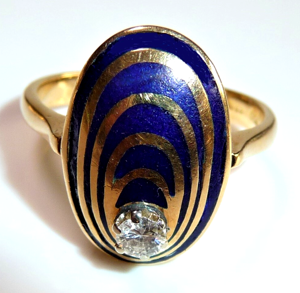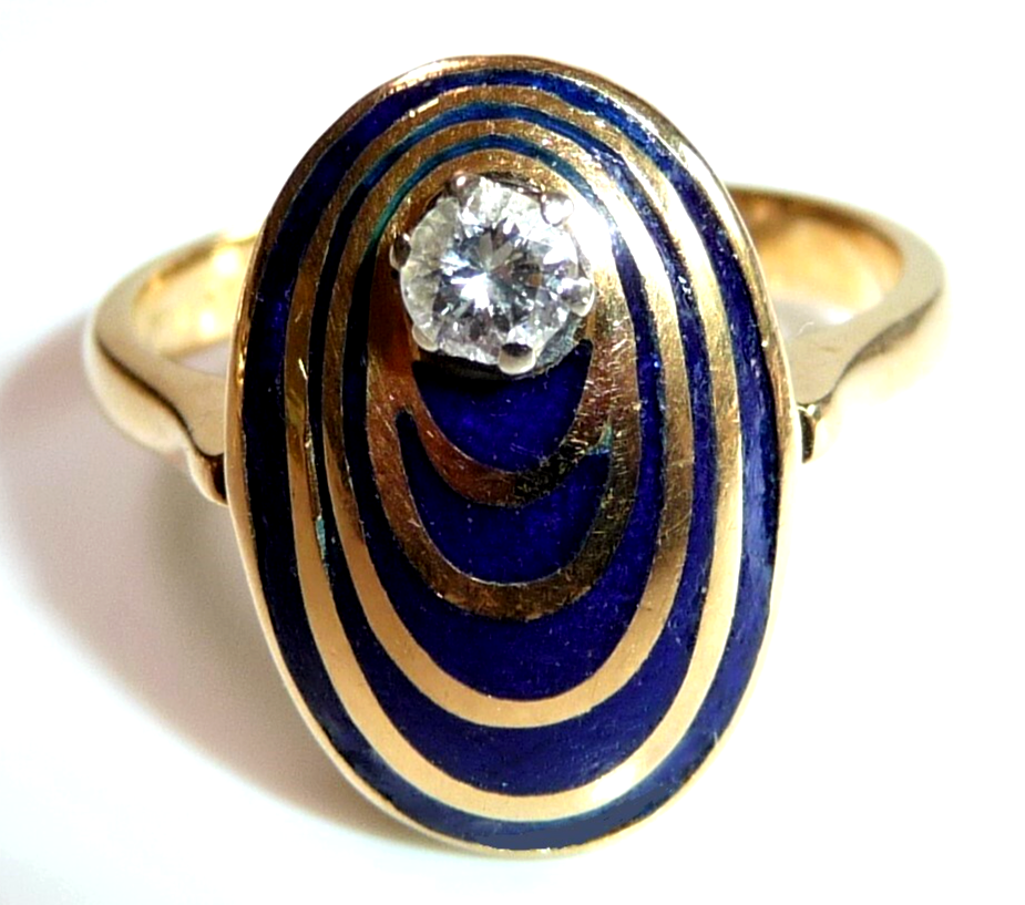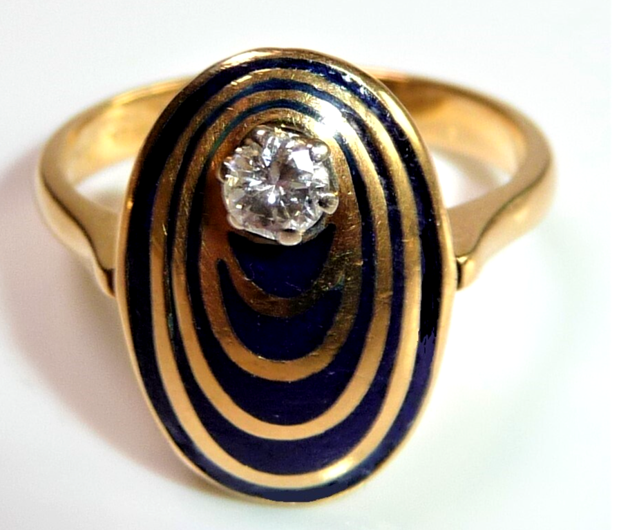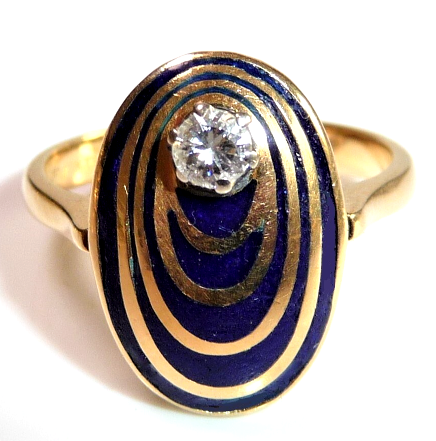 Ring in 750/18K Gelbgold. Der Ring hat einen ovalen Ringkopf, der ein sehr originelles Spiralen-Muster hat. Ovale Goldbögen, die sich einseitig immer mehr ausweiten von einem Zentrum ausgehend, das am Rande liegt. Das besagte Zentrum ist der klare Altschliff-Diamant von 0.15 ct. (G/SI) mit dem Durchmesser von 3,3 mm. Die Gold-Ellipsen werden kontrastiert durch eine dunkelblaue Emaille mit der Farbe von Lapislazuli.