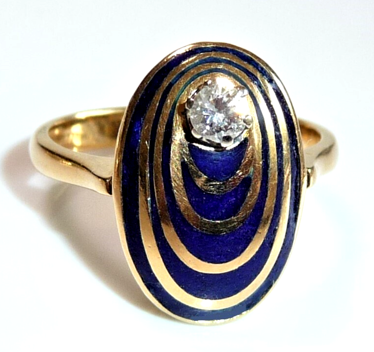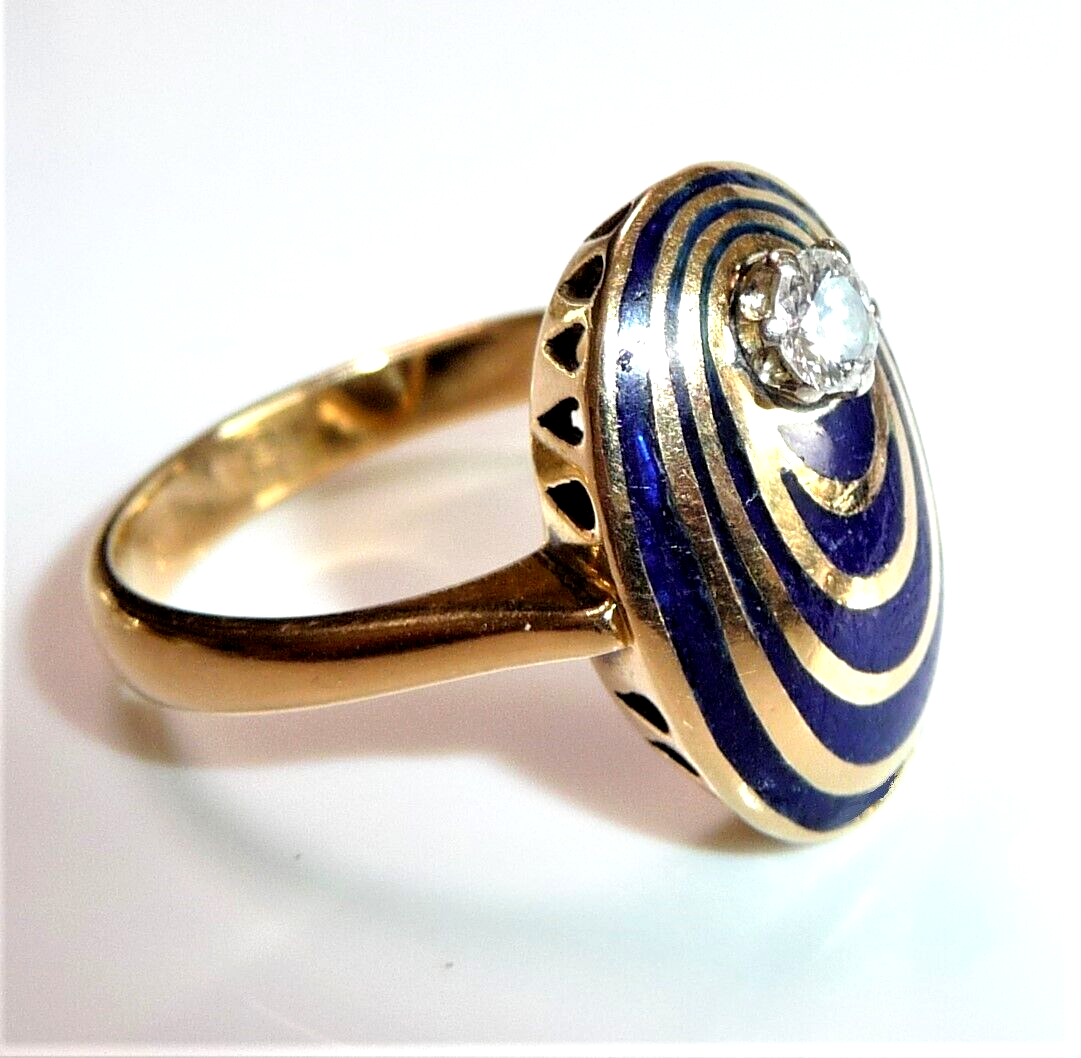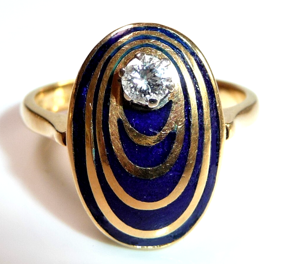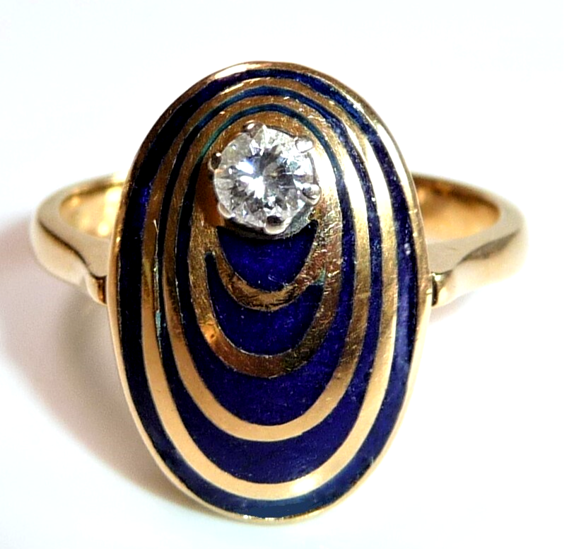 Ring in 750/18K Gelbgold. Der Ring hat einen ovalen Ringkopf, der ein sehr originelles Spiralen-Muster hat. Ovale Goldbögen, die sich einseitig immer mehr ausweiten von einem Zentrum ausgehend, das am Rande liegt. Das besagte Zentrum ist der klare Altschliff-Diamant von 0.15 ct. (G/SI) mit dem Durchmesser von 3,3 mm. Die Gold-Ellipsen werden kontrastiert durch eine dunkelblaue Emaille mit der Farbe von Lapislazuli.