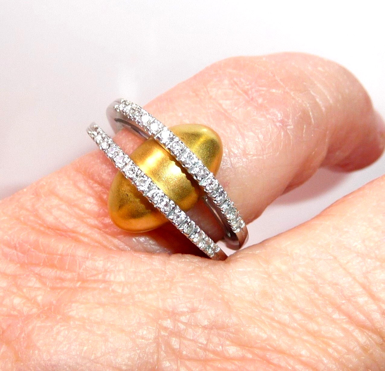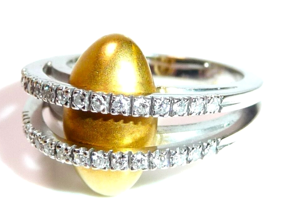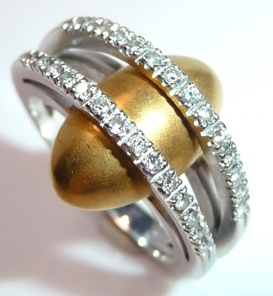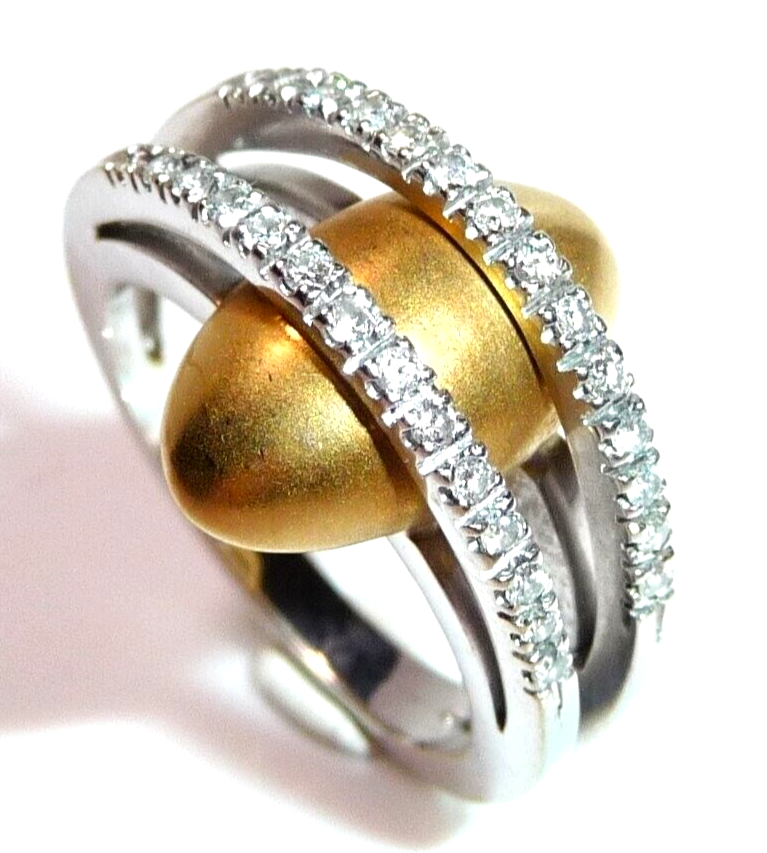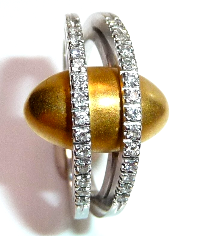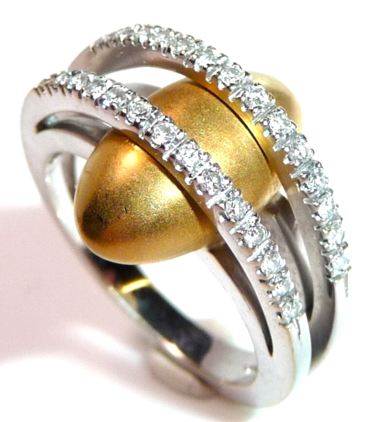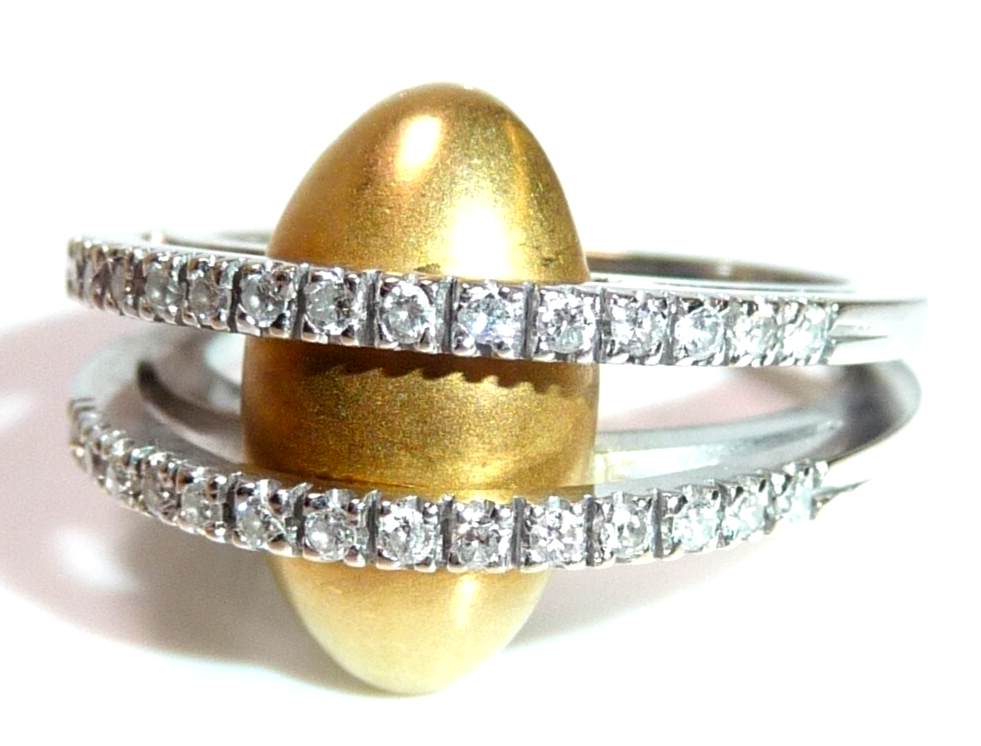 Kreativer Diamant Ring, gearbeitet in 18 K / 750 Weißgold und Gelbgold. Der breite Ring teilt sich nach oben hin in zwei Bögen, die mit insgesamt 28 Diamanten im Brillantschliff von total 0.30 ct. (G/VS) besetzt sind. Unter die Diamant-Bögen platziert sich ein ovales, gewölbtes Gelbgold Element mit mattierter Oberfläche. Der Ring ist eine kreative Goldschmiede-Arbeit und ein Eyecatcher in exzellentem Zustand.