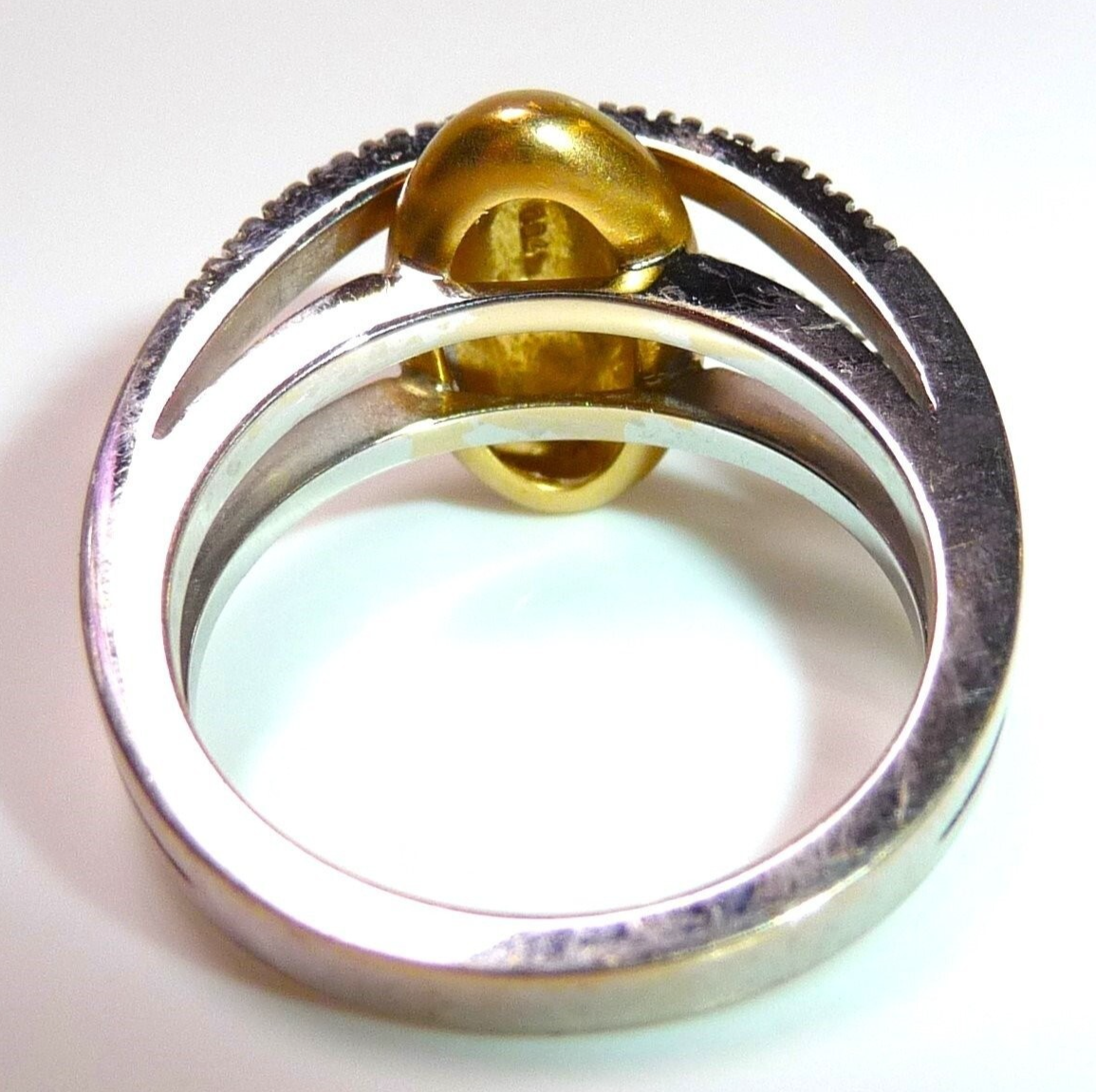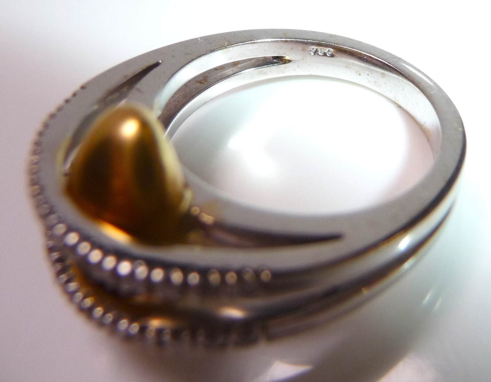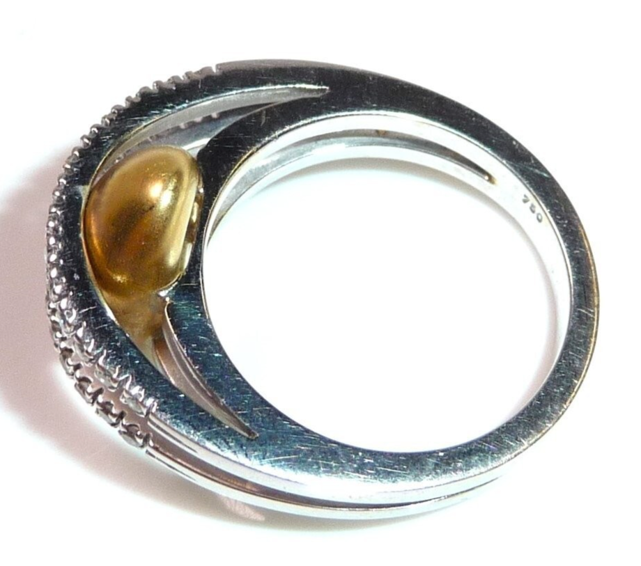 Gepunzt in der Ringschiene mit 750 und unter dem Kopf des Gelbgold-Element ebenfalls mit 750 punziert (siehe Bild 5).