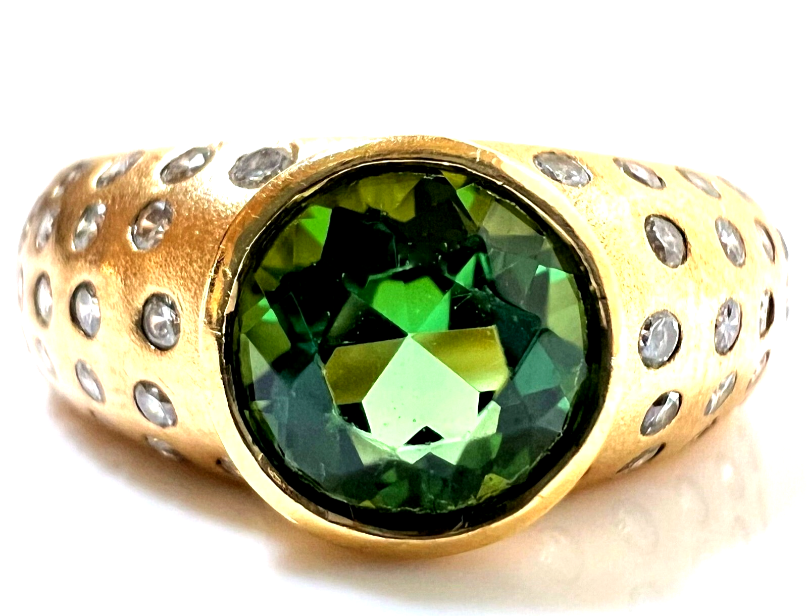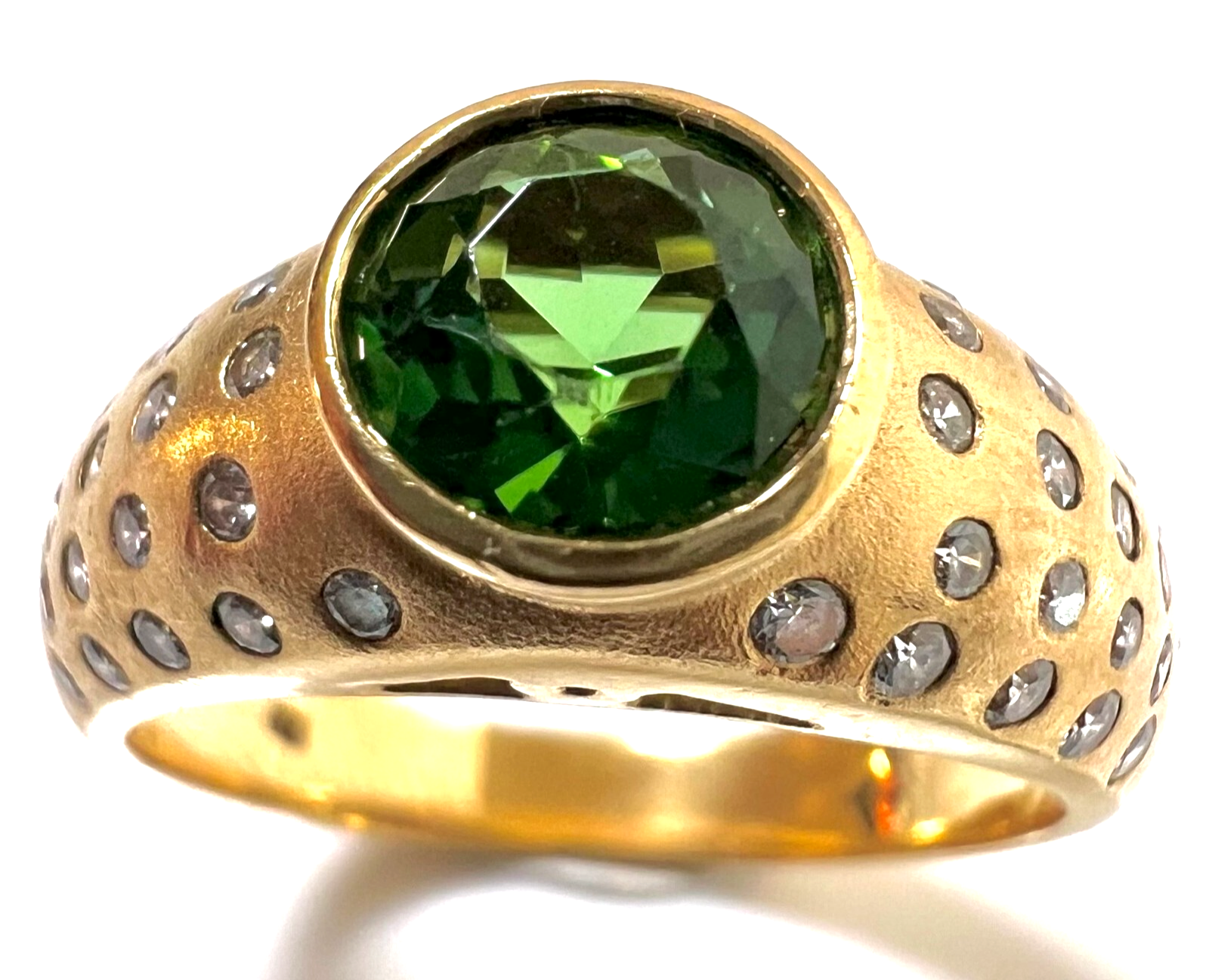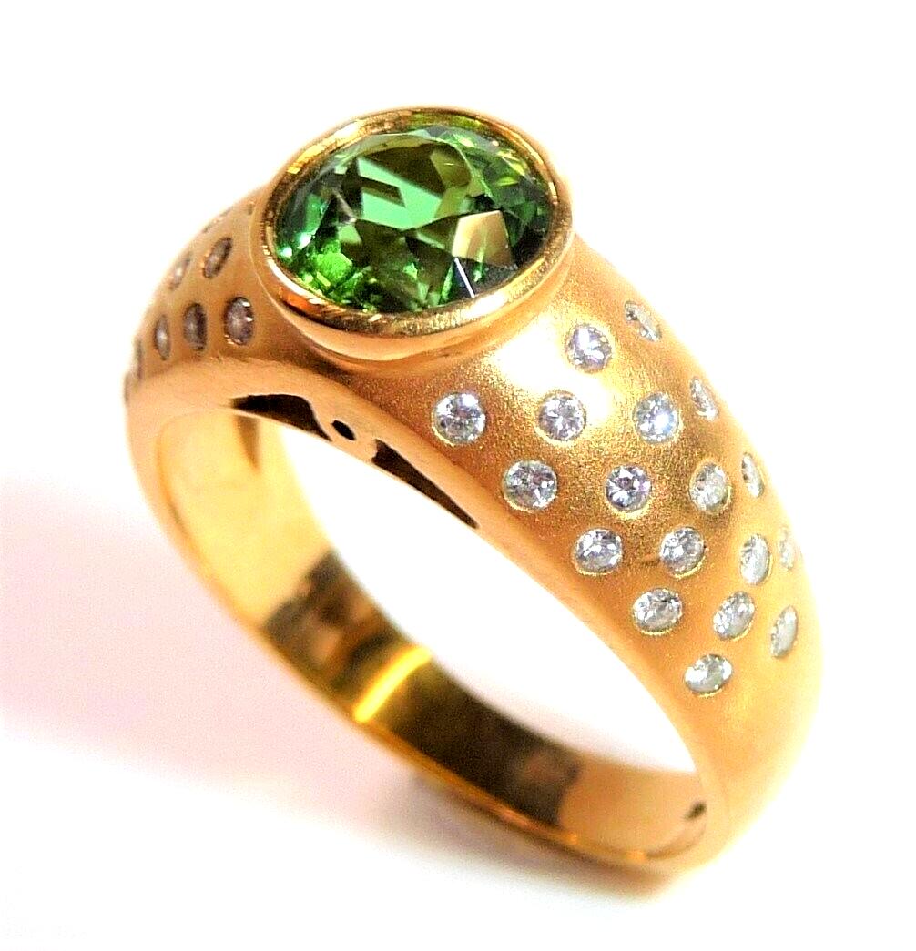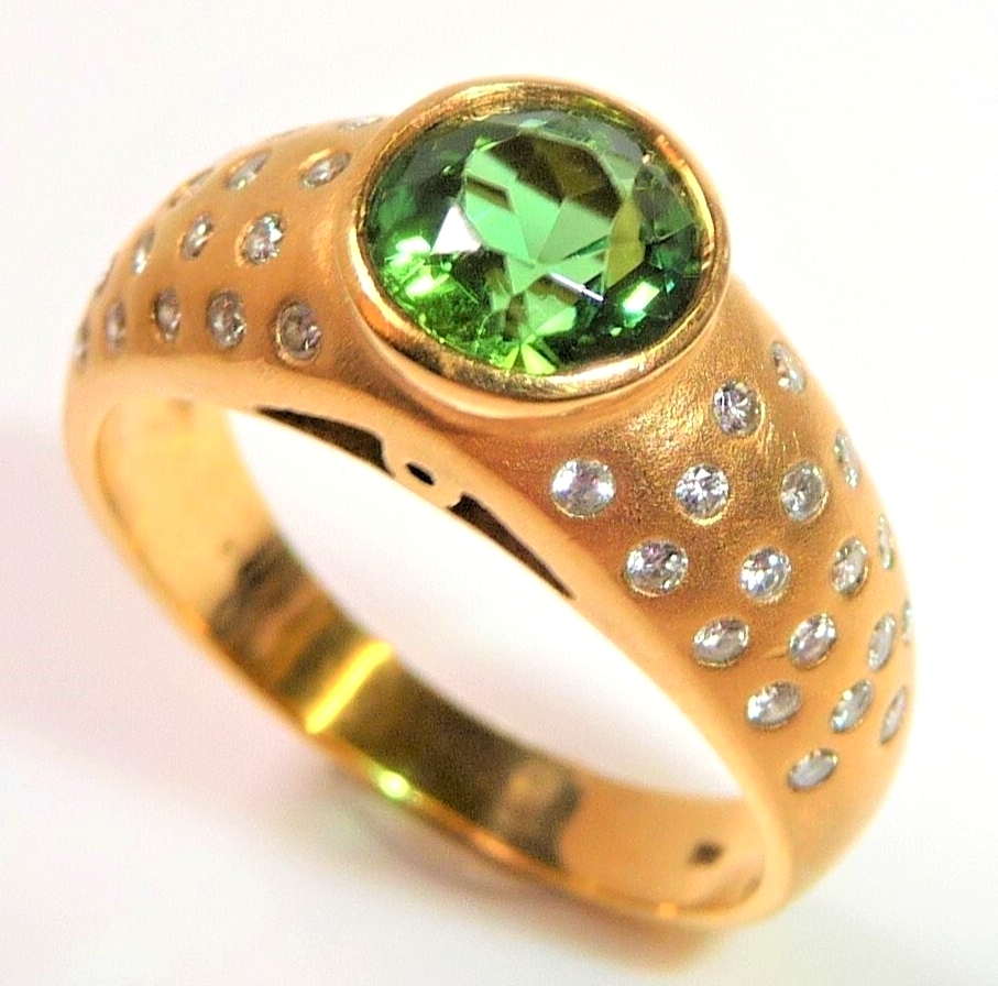 Ring in 750 / 18 K Gelbgold. Der Ring ist eine Goldschmiede-Arbeit von Hand. In die gewölbten Ringschultern sind insgesamt 46 Diamanten im Brillantschliff in die edel mattierte Oberfläche eingefasst. Die 46 Diamanten haben ca. 0.60 ct. (F/VS-VVS). Im Zentrum ist ein runder, facettierter Turmalin von 1.00 ct. in einem hellen Grün.