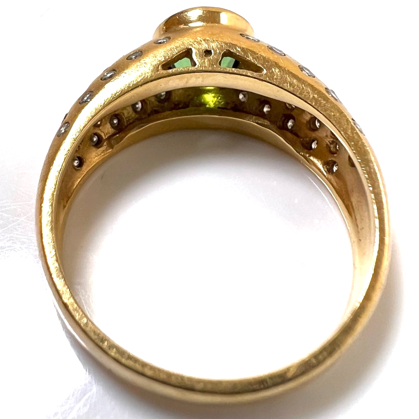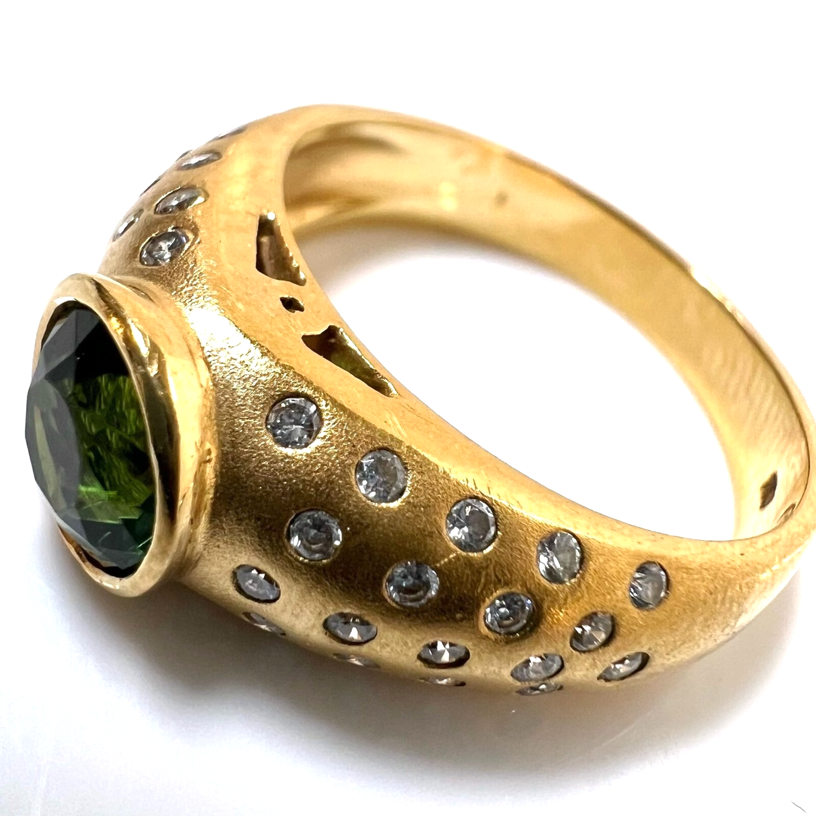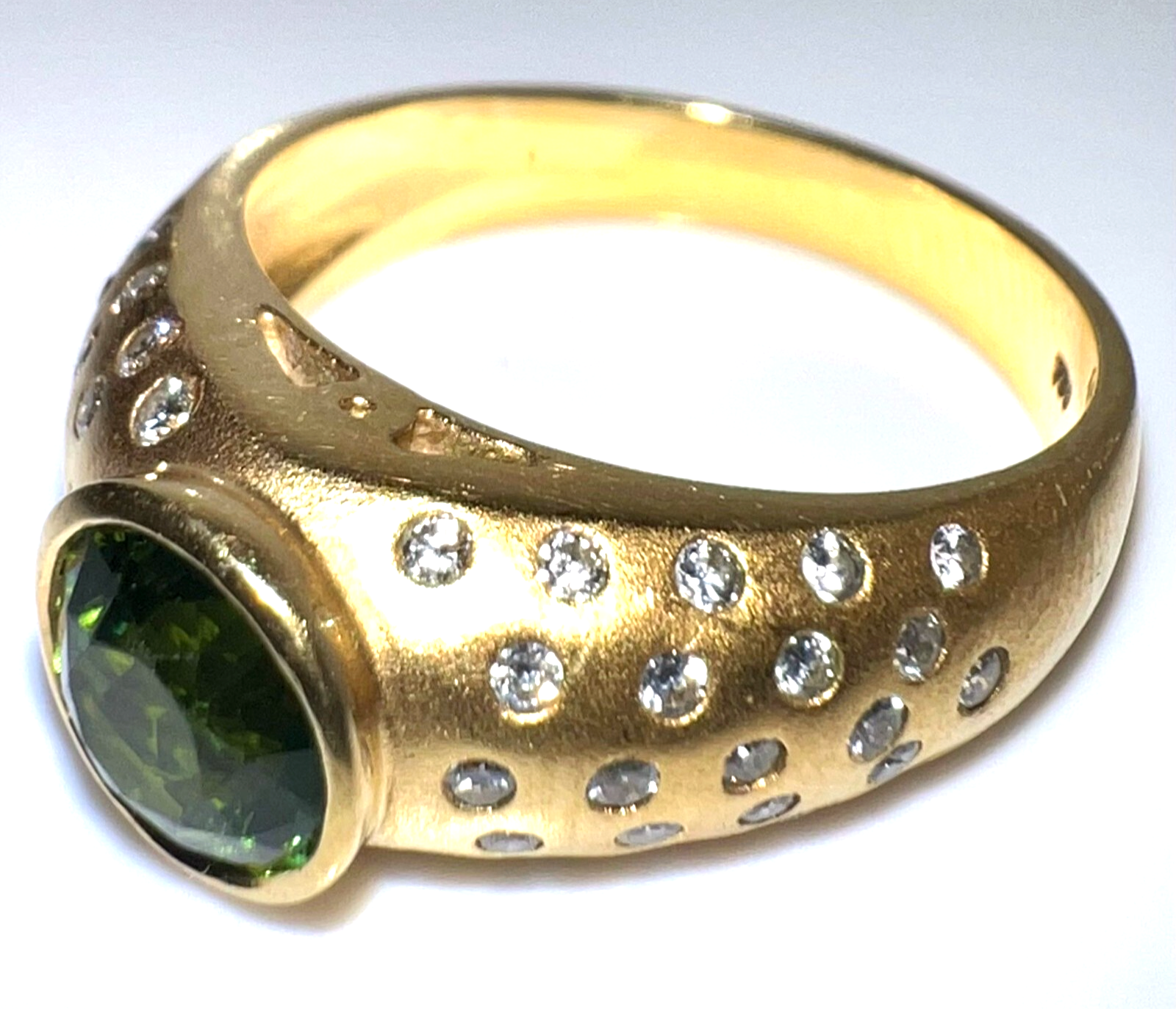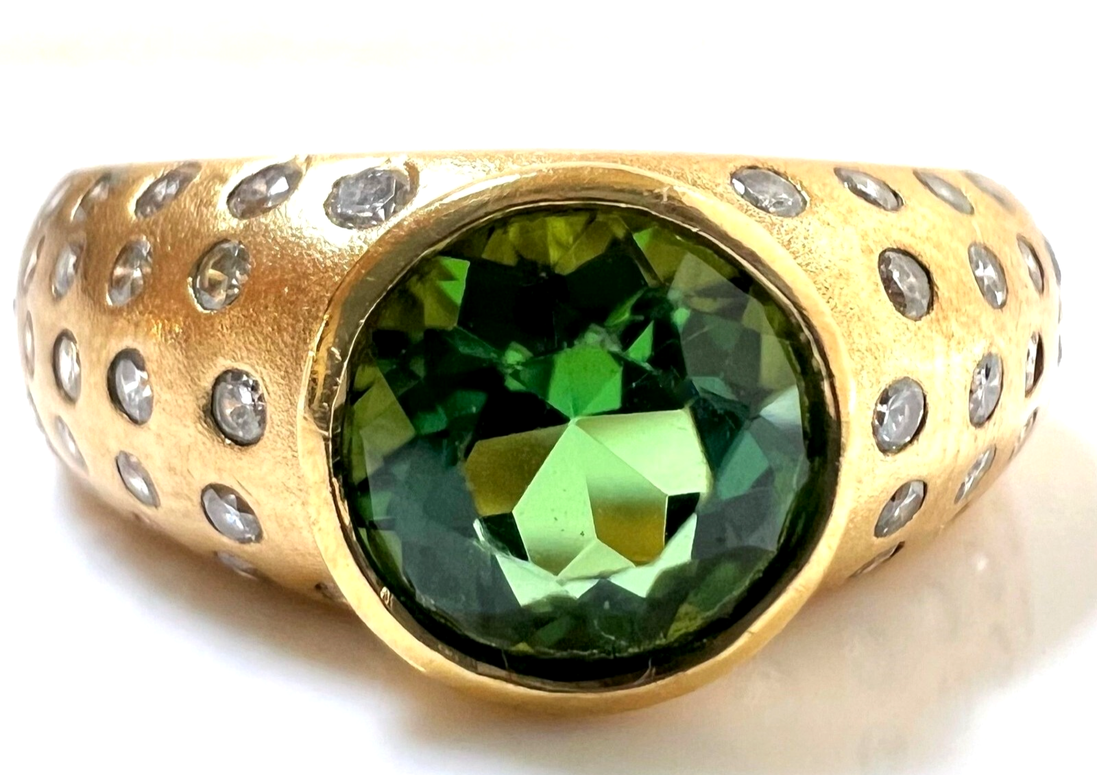 Ring in 750 / 18 K Gelbgold. Der Ring ist eine Goldschmiede-Arbeit von Hand. In die gewölbten Ringschultern sind insgesamt 46 Diamanten im Brillantschliff in die edel mattierte Oberfläche eingefasst. Die 46 Diamanten haben ca. 0.60 ct. (F/VS-VVS). Im Zentrum ist ein runder, facettierter Turmalin von 1.00 ct. in einem hellen Grün.